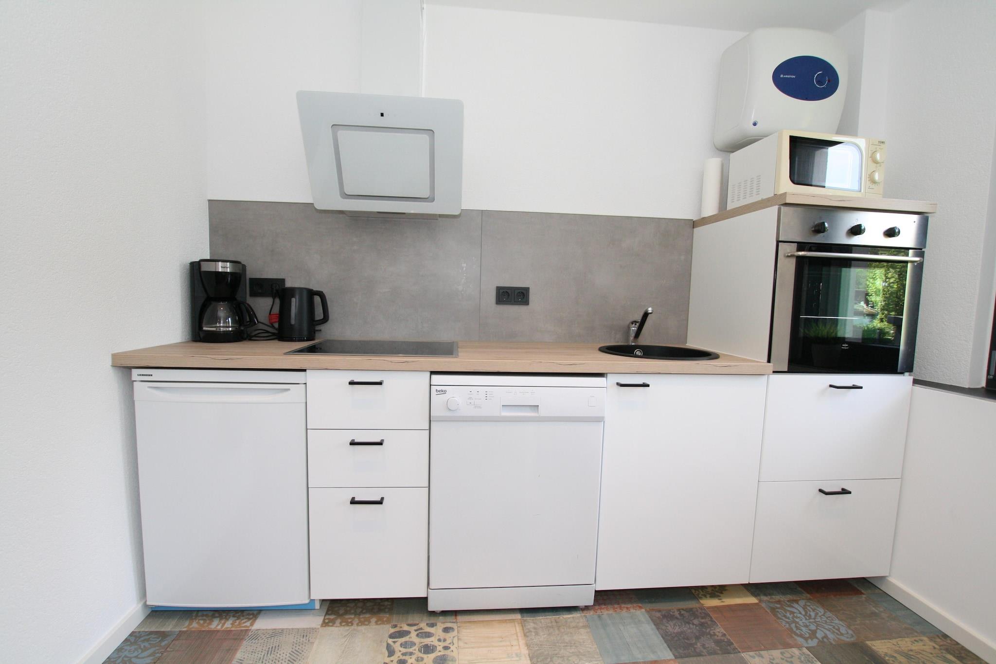 Ground floor: (open kitchen(dining table, hob(4 ring stoves, ceramic), electric kettle, toaster, hood, coffee machine, oven, microwave, dishwasher, fridge-freezer), Living/bed room(single sofa bed, double bed, TV(satellite), radio, CD player), bathroom(shower, toilet, hairdryer)) grill, heating(gas), terrace, garden furniture, parking