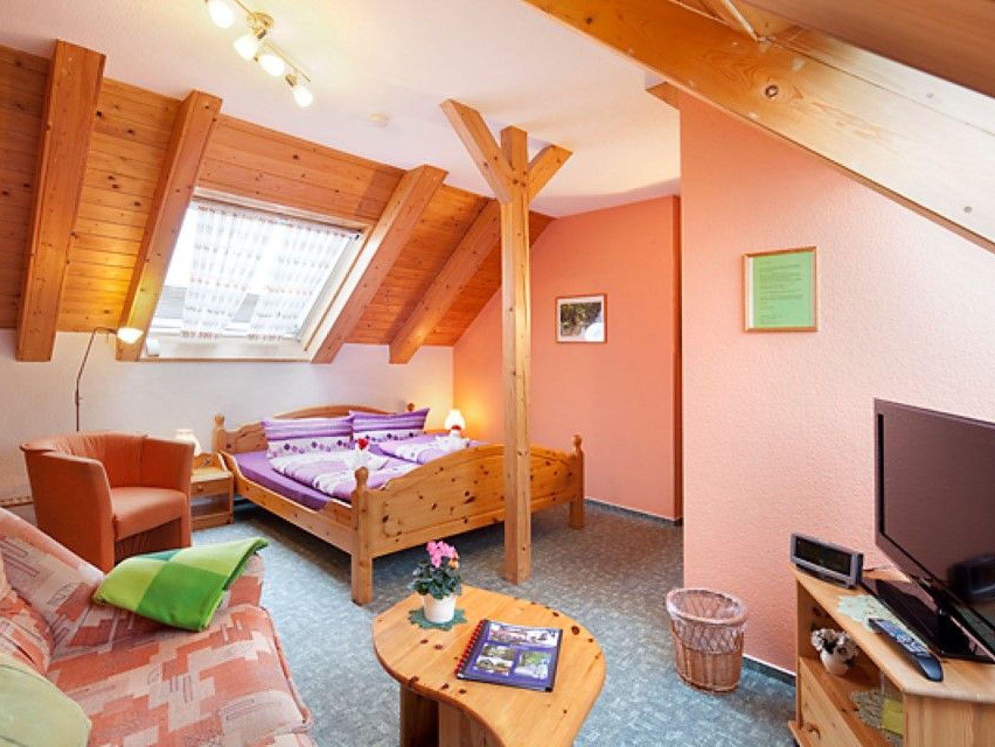 Bei Bedarf kann in der oberen Etage ein zusätzliches Zimmer (15 m²), mit einem französischem Bett (140x200 cm), eigenem Sanitärbereich und TV dazu gebucht werden.