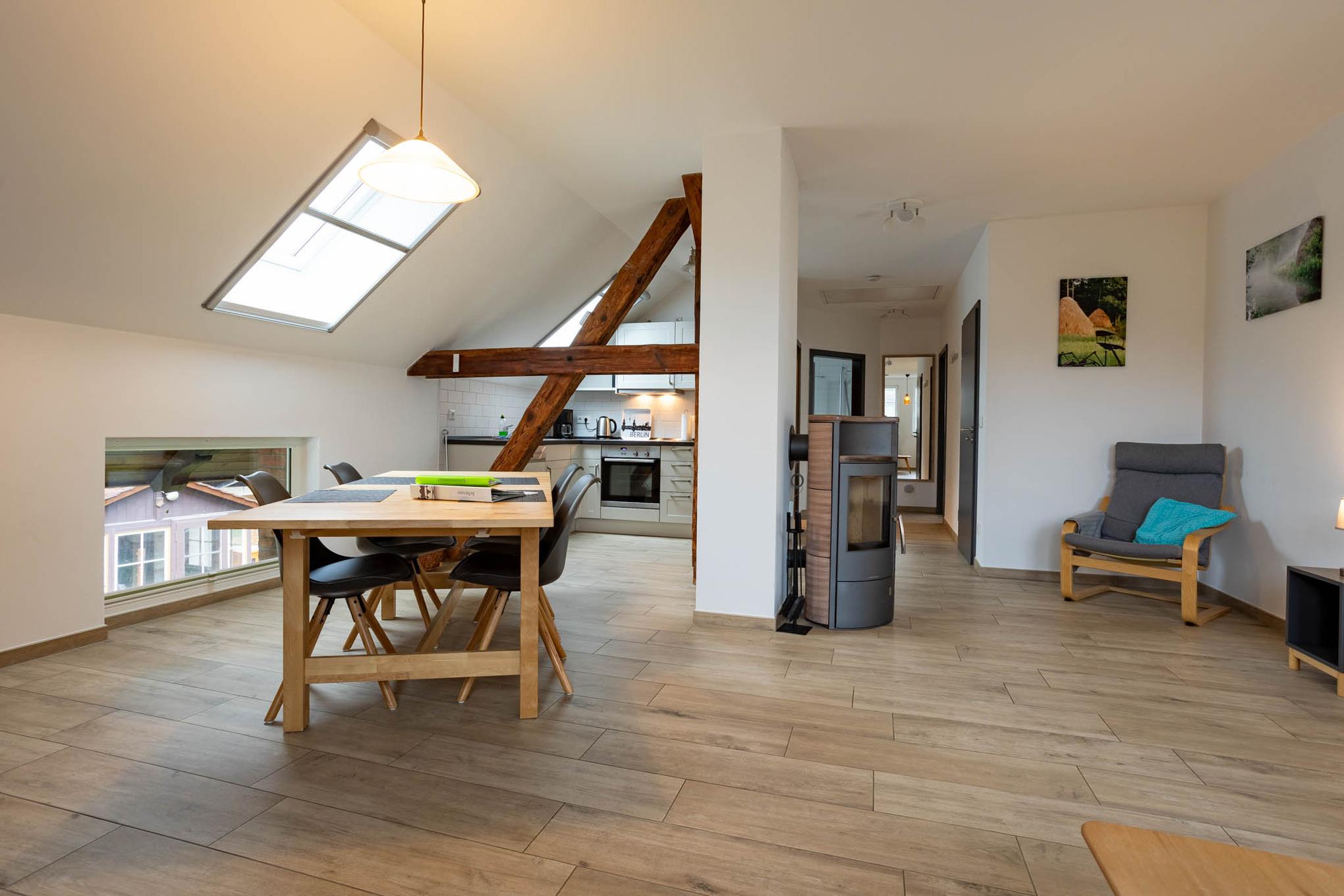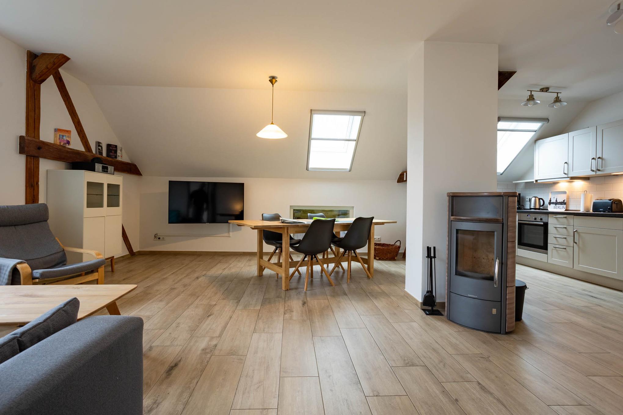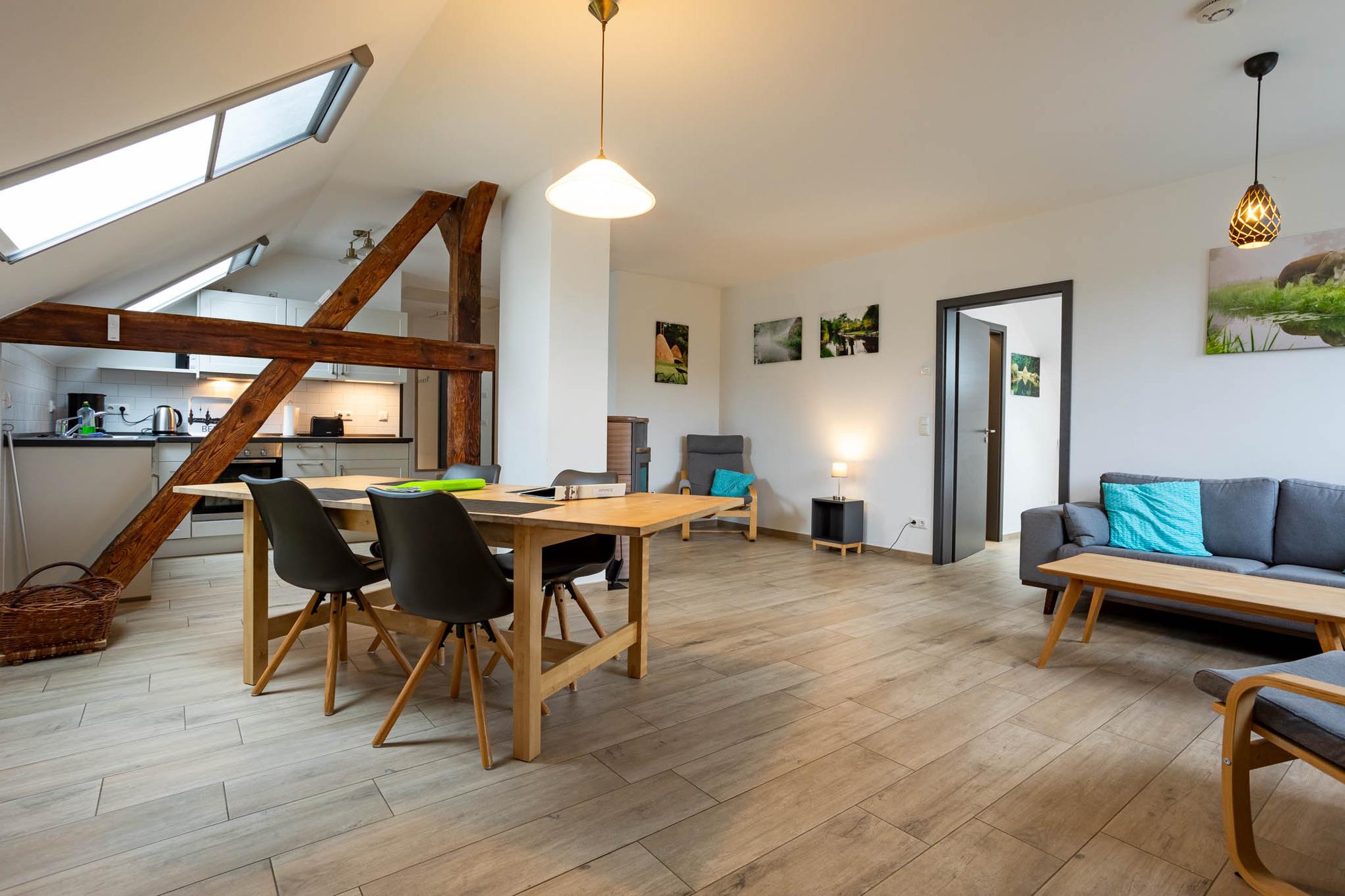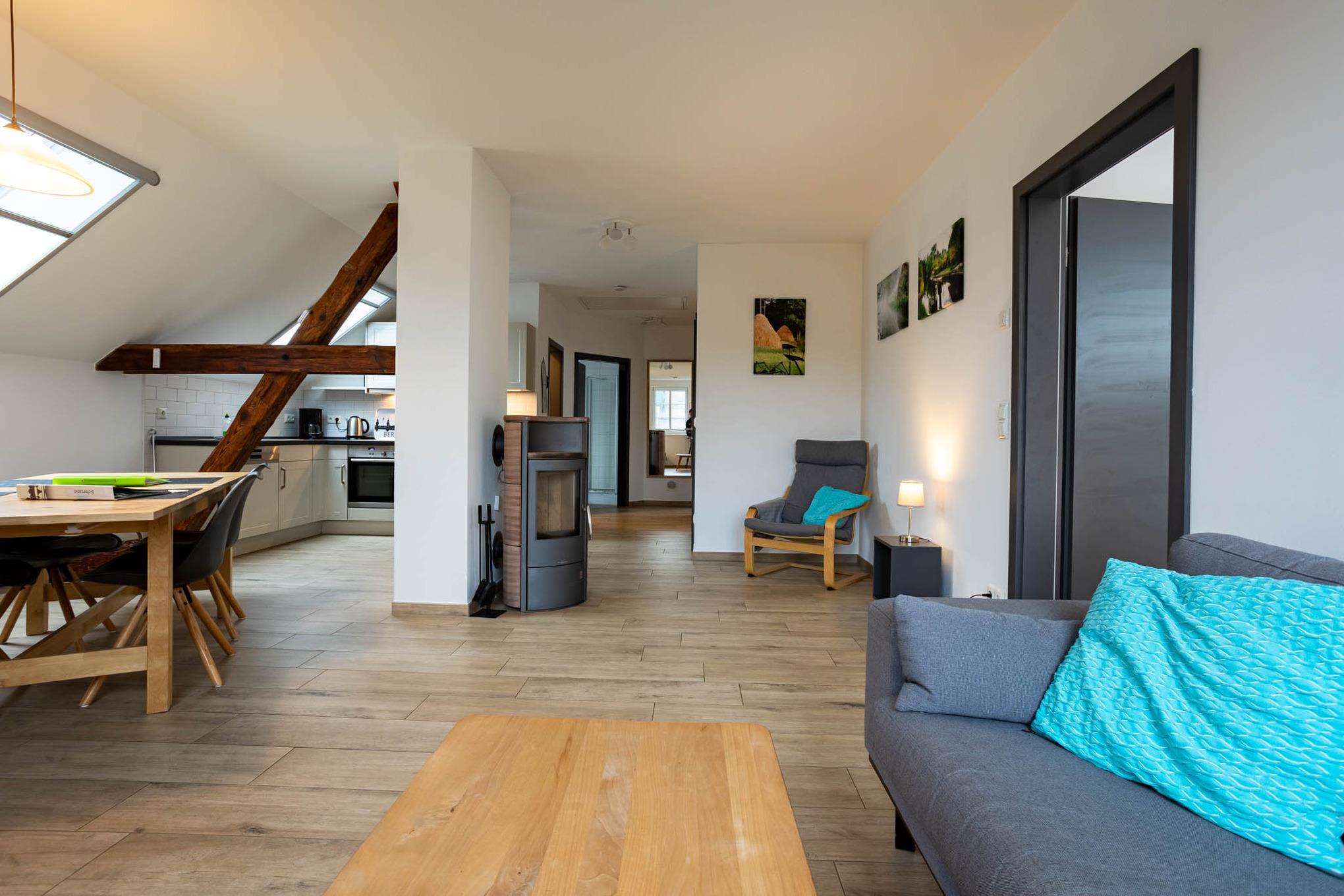 Großzügige 3-Zimmer-Ferienwohnung direkt im Dachgeschoss mit eigener Terrasse. Genießen Sie Wohlfühlatmosphäre mit eigener Sauna, Kamin und Fußbodenheizung.