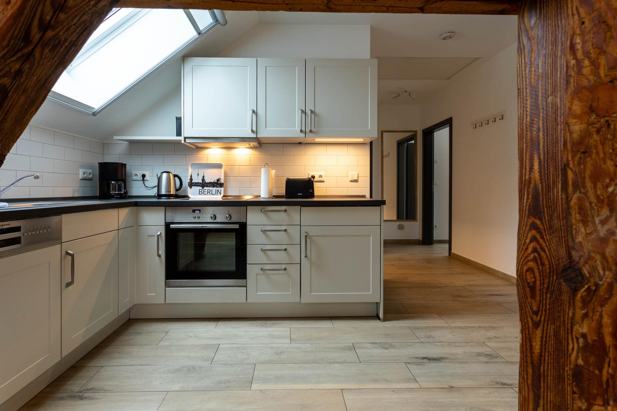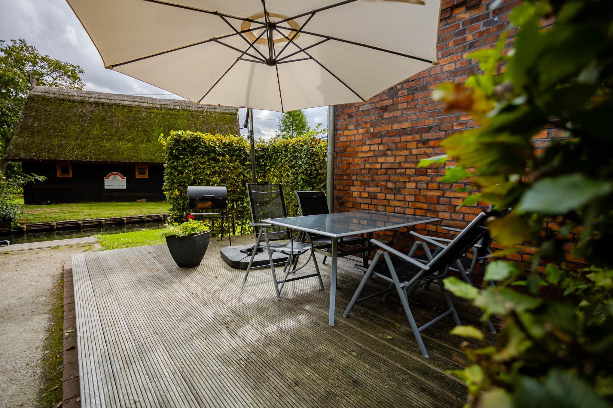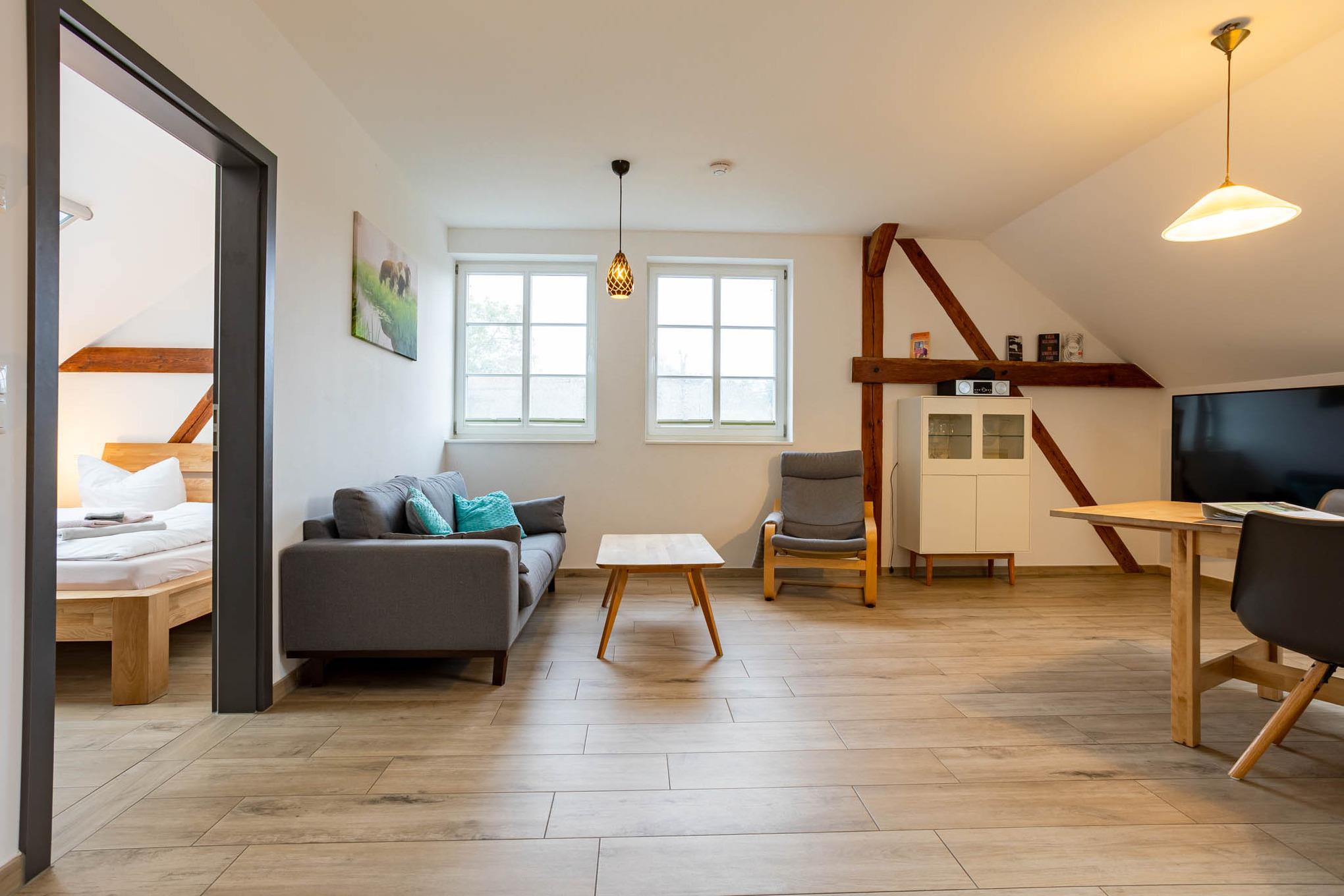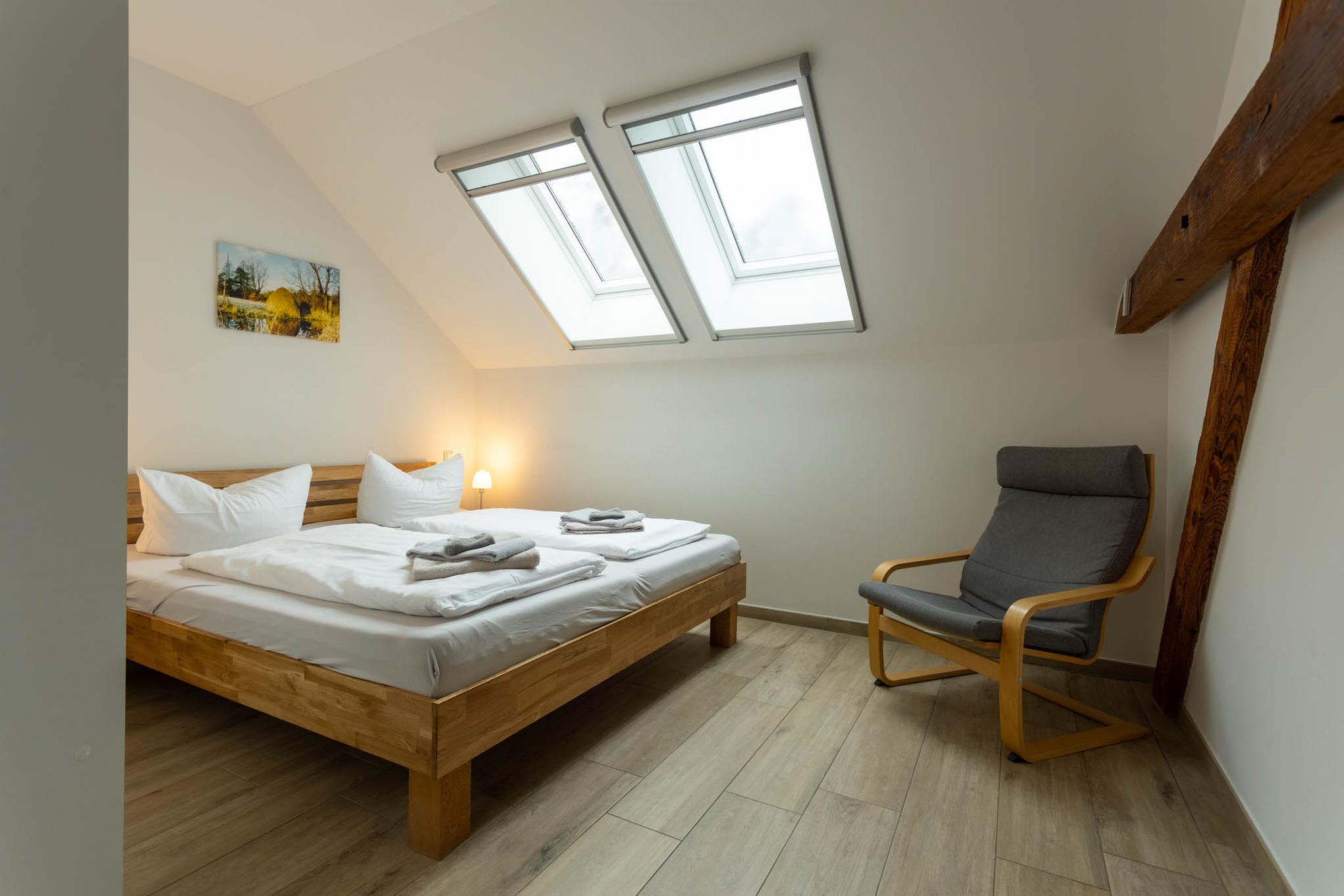 In den Räumen dieser großzügigen 3-Zimmer-Ferienwohnung wurde früher das Heu für die Rinder eingelagert und so manche Generation kleiner Katzen geboren. Heute haben wir hier unsere größte Ferienwohnung mit zwei Schlafzimmern eingerichtet. Ein großer Wohnraum mit integrierter Küche, ein großes Bad sowie ein weiteres WC erstrecken sich auf ca. 90 qm. Alle Fenster sind mit Insektengitter ausgestattet. Die Ferienwohnung bietet vier Personen ausreichend Platz und verfügt mit der Sauna (zur alleinigen Nutzung) auch noch über ein kleines Wellnessparadies. Ein weiterer Pluspunkt: Da die Ferienwohnung am Wasser liegt, gibt es eine eigene Terrasse direkt am Dolzkefließ. Natürlich haben Sie auch Zugriff auf das Gäste-WLAN. Einen PKW-Stellplatz finden Sie direkt an der Ferienwohnung. Eine 11 kW Wallbox ist ebenfalls vorhanden und zusätzliche Parkplätze können in fussläufiger Entfernung angemietet werden.