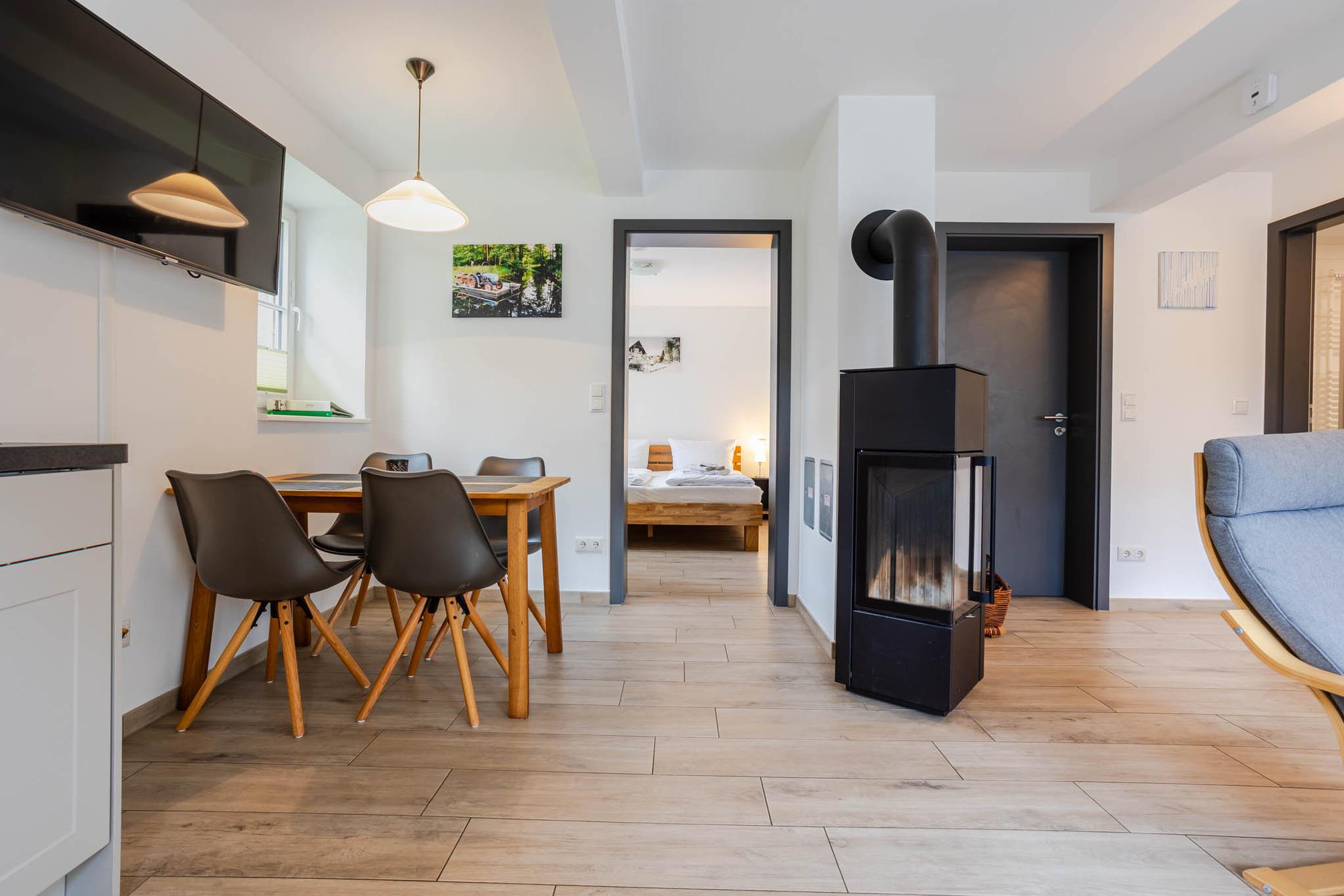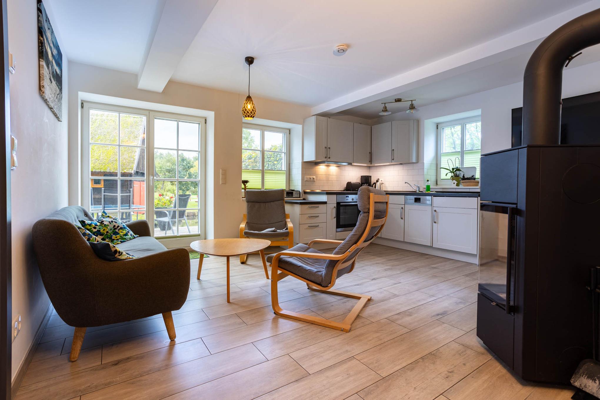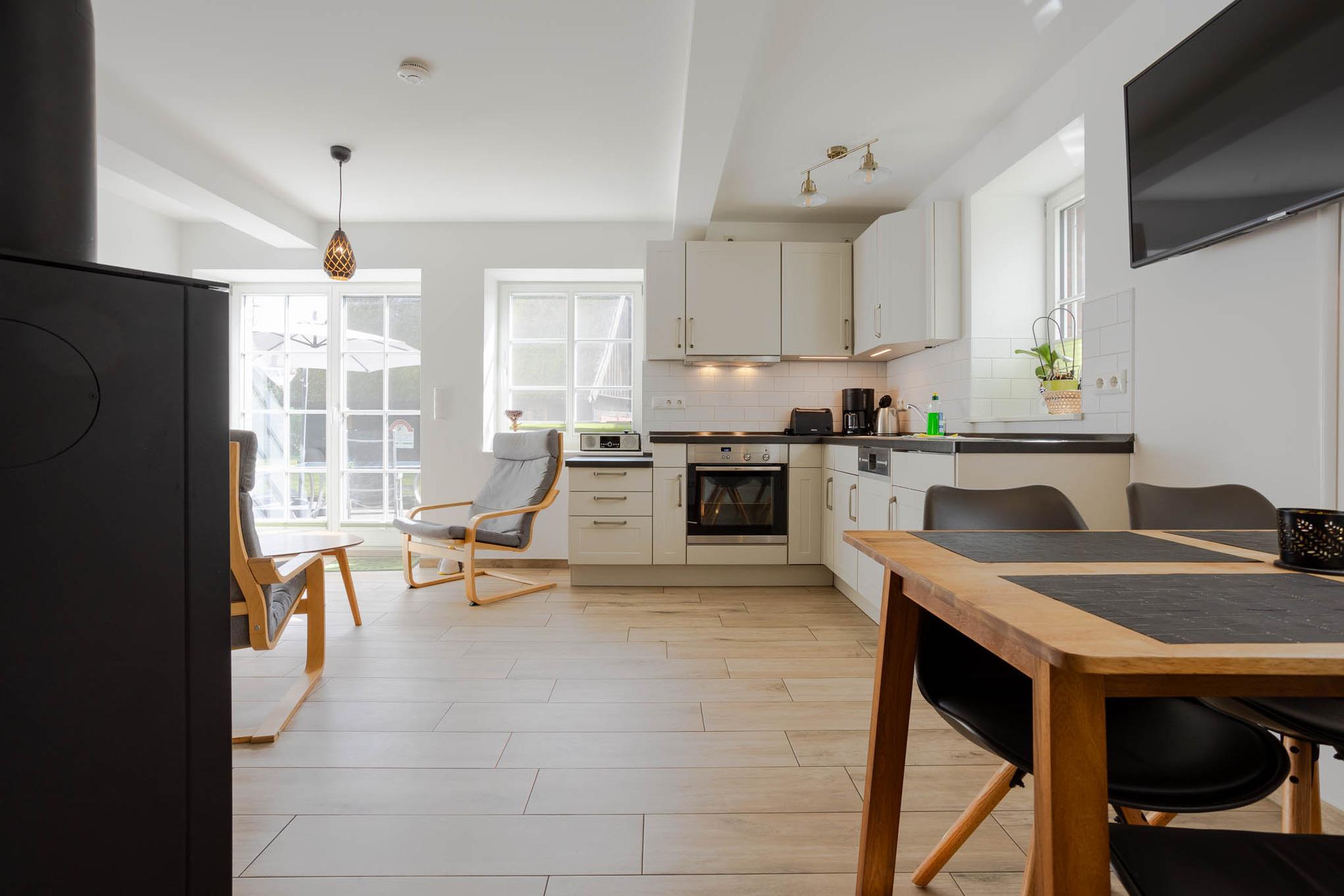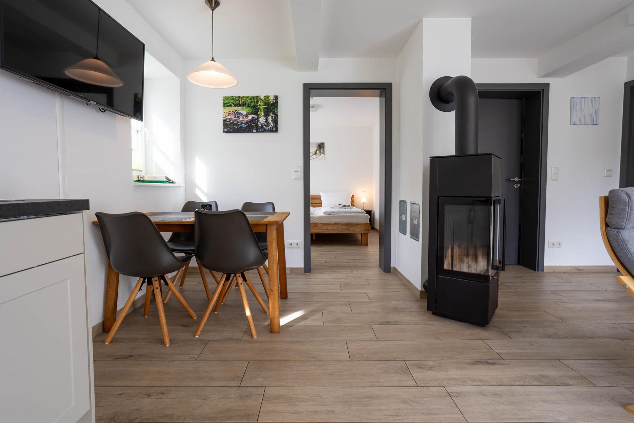 Der Name dieser Ferienwohnung für 4 Personen ist Programm. Bis zum Jahr 2003 standen in dieser Ferienunterkunft noch Rinder. Und dort, wo Sie heute Ihr Frühstück genießen, wurden Kälber aufgezogen. Ein absolutes Alleinstellungsmerkmal dieser Ferienwohnung am Wasser ist mit Sicherheit die sonnige Terrasse direkt am Dolzkefließ, die vom Wohnzimmer aus betreten werden kann. Zwei getrennte Schlafzimmer sorgen für Rückzugsräume und ein großes Duschbad für ein gewisses Wellnessfeeling. Alle Räume dieser großzügigen 3-Zimmer-Ferienwohnung werden über den Fußboden geheizt. Für einen Schuss Behaglichkeit sorgt ein Kamin und alle Fenster sowie die Terrassentür sind durch Insektengitter geschützt. Natürlich haben Sie auch Zugriff auf das Gäste-WLAN. Ein Stellplatz für Ihren PKW finden Sie direkt an der Ferienwohnung. Eine 11 kW Wallbox ist ebenfalls vorhanden und zusätzliche Parkplätze können in fussläufiger Entfernung angemietet werden.