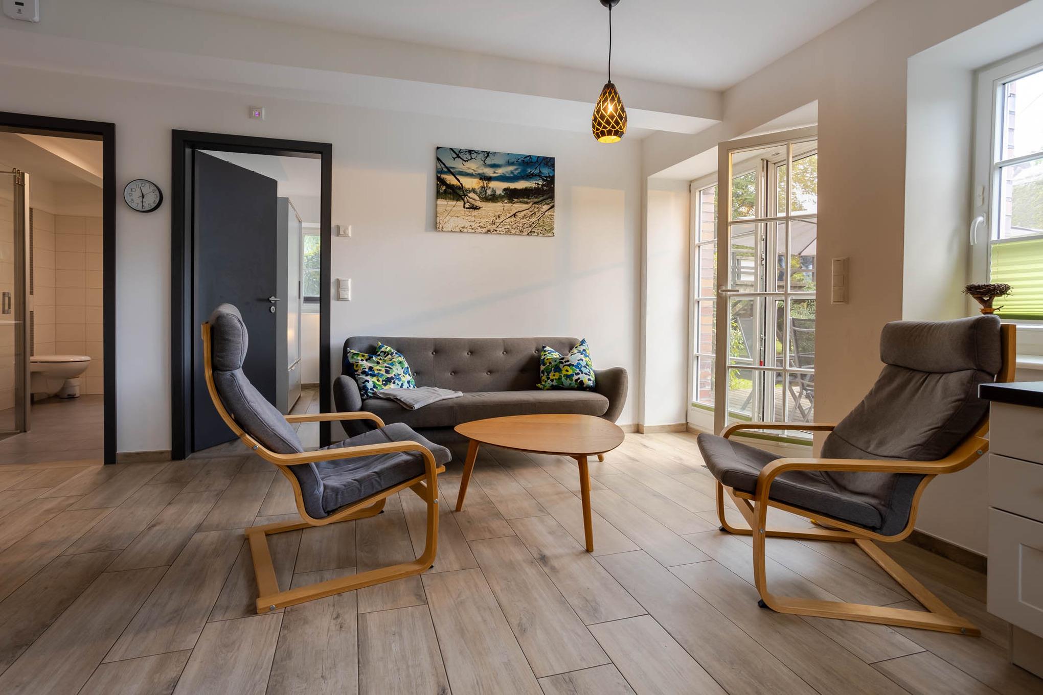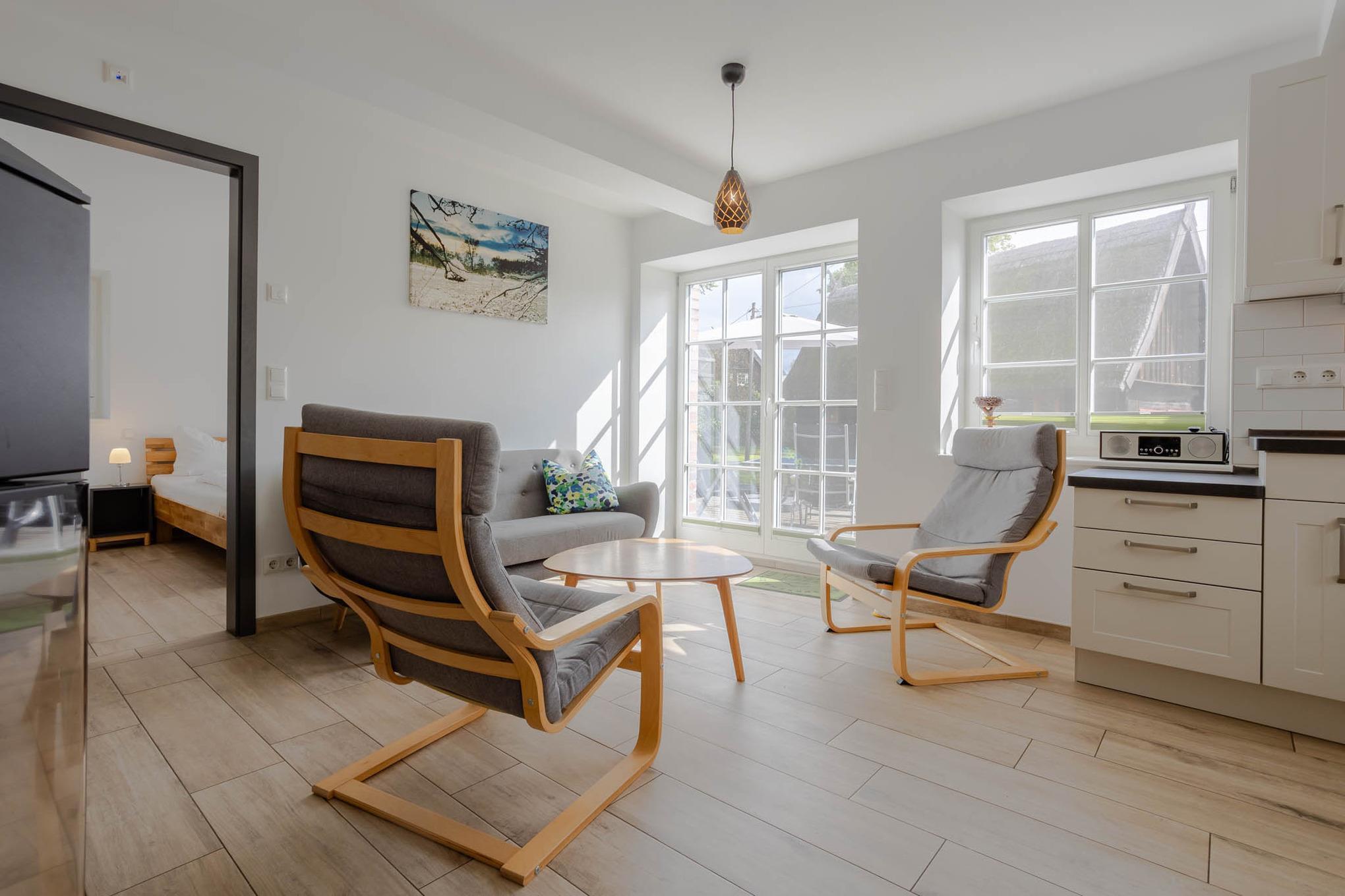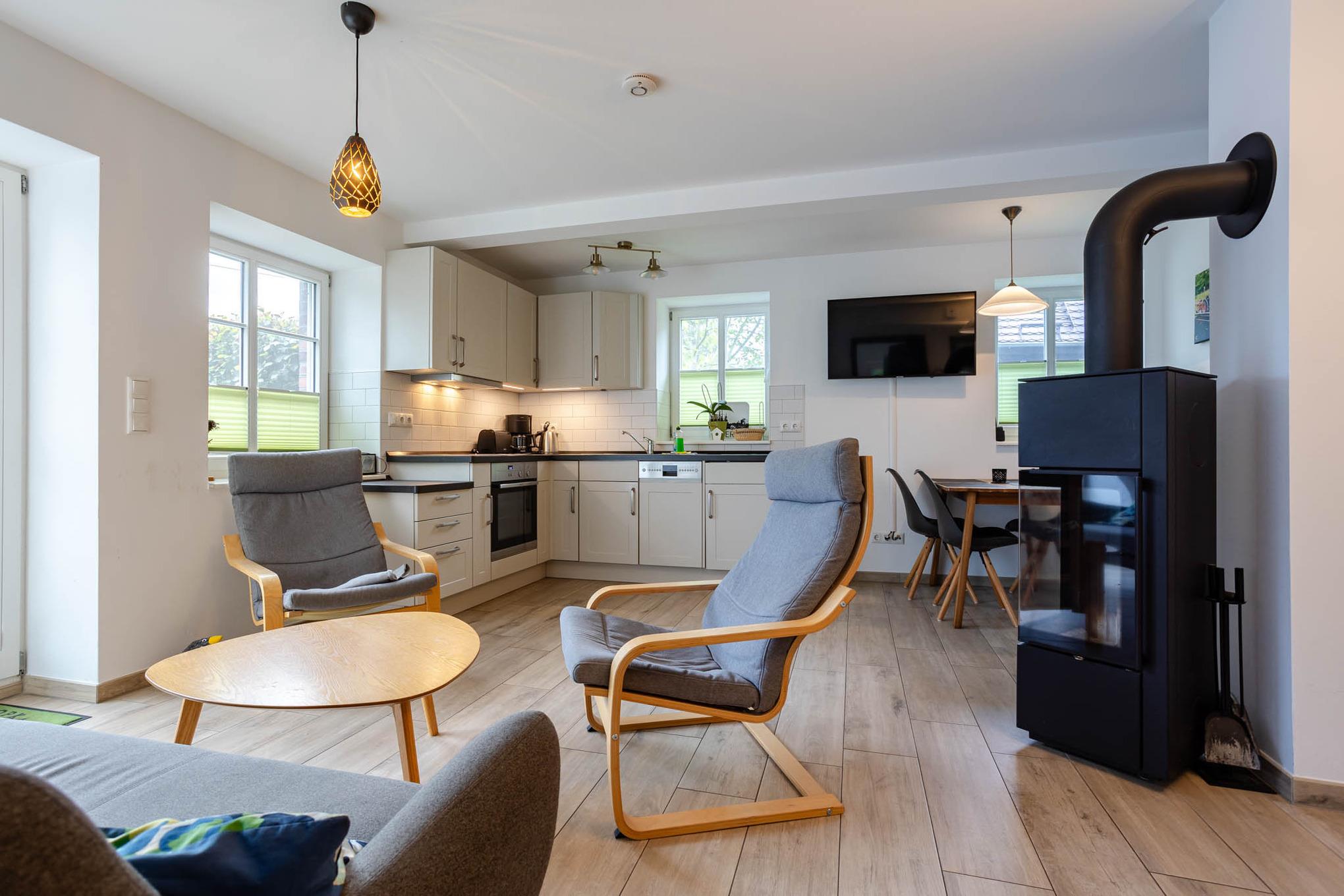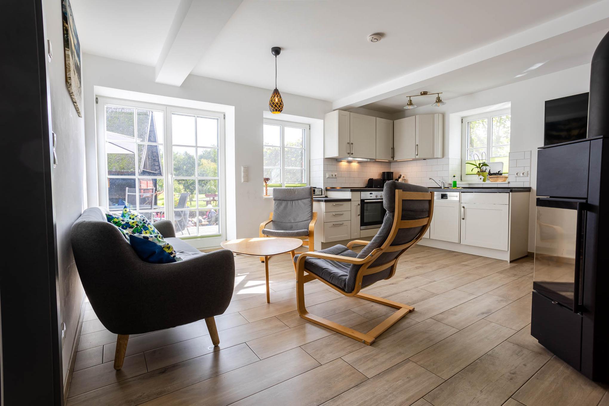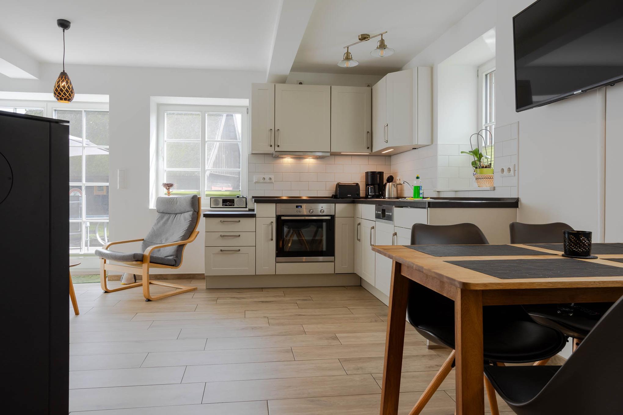 Der Name dieser Ferienwohnung für 4 Personen ist Programm. Bis zum Jahr 2003 standen in dieser Ferienunterkunft noch Rinder. Und dort, wo Sie heute Ihr Frühstück genießen, wurden Kälber aufgezogen. Ein absolutes Alleinstellungsmerkmal dieser Ferienwohnung am Wasser ist mit Sicherheit die sonnige Terrasse direkt am Dolzkefließ, die vom Wohnzimmer aus betreten werden kann. Zwei getrennte Schlafzimmer sorgen für Rückzugsräume und ein großes Duschbad für ein gewisses Wellnessfeeling. Alle Räume dieser großzügigen 3-Zimmer-Ferienwohnung werden über den Fußboden geheizt. Für einen Schuss Behaglichkeit sorgt ein Kamin und alle Fenster sowie die Terrassentür sind durch Insektengitter geschützt. Natürlich haben Sie auch Zugriff auf das Gäste-WLAN. Ein Stellplatz für Ihren PKW finden Sie direkt an der Ferienwohnung. Eine 11 kW Wallbox ist ebenfalls vorhanden und zusätzliche Parkplätze können in fussläufiger Entfernung angemietet werden.