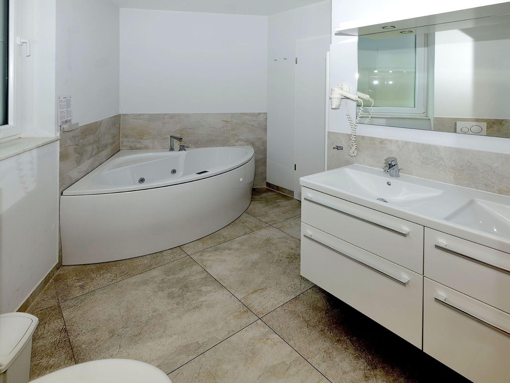 Die Wohnung ist stilvoll, hochwertig und modern eingerichtet. Ein besonderes Highlight ist ihr persönlicher Wellnessbereich mit Sauna, Whirlpool und Dampfbad mit integrierter Doppel-
