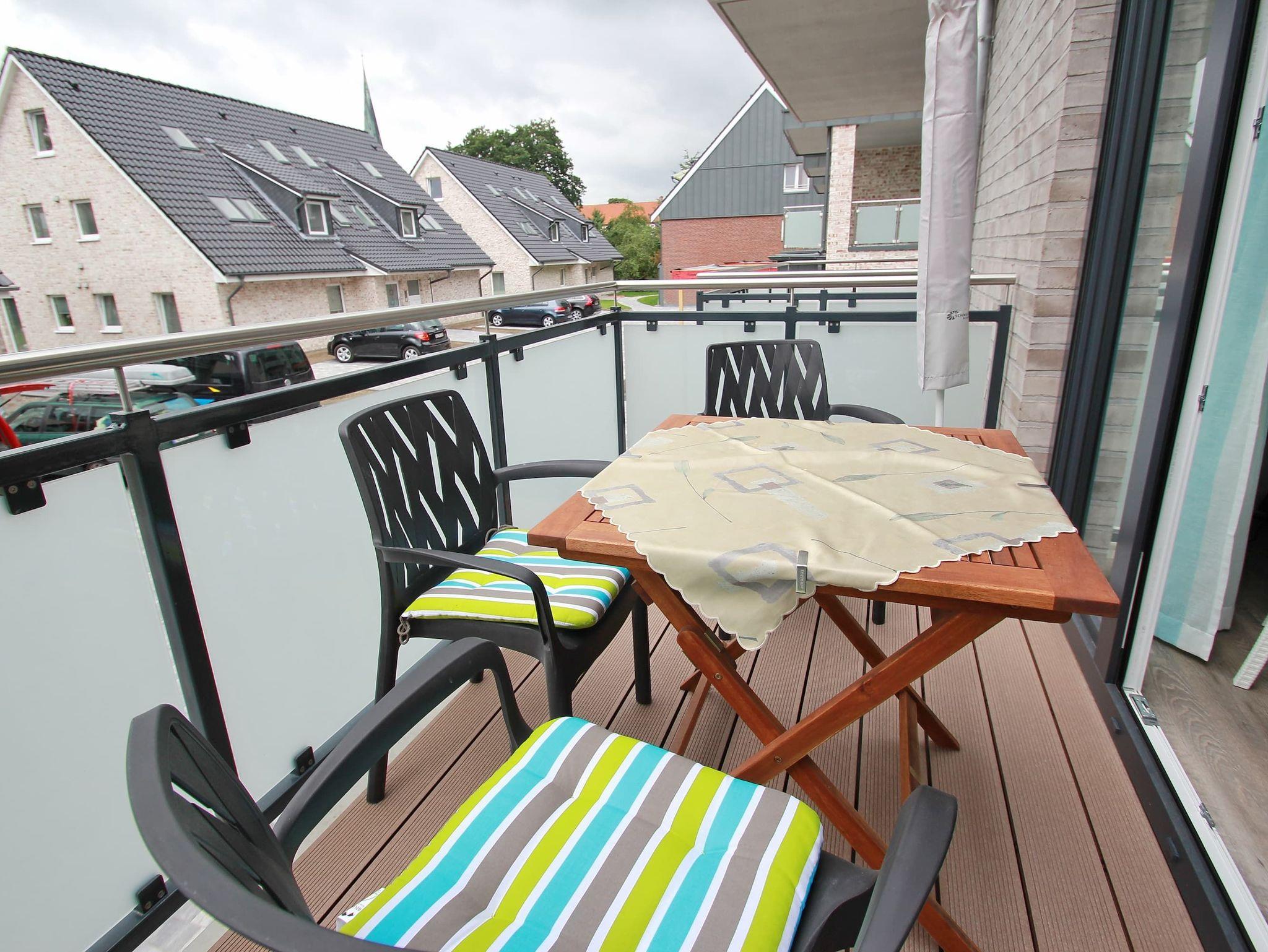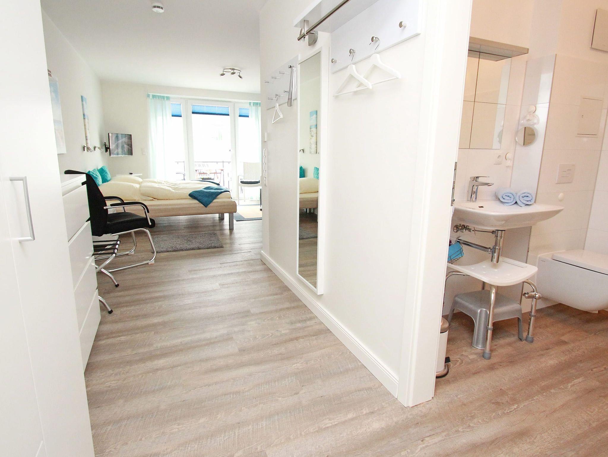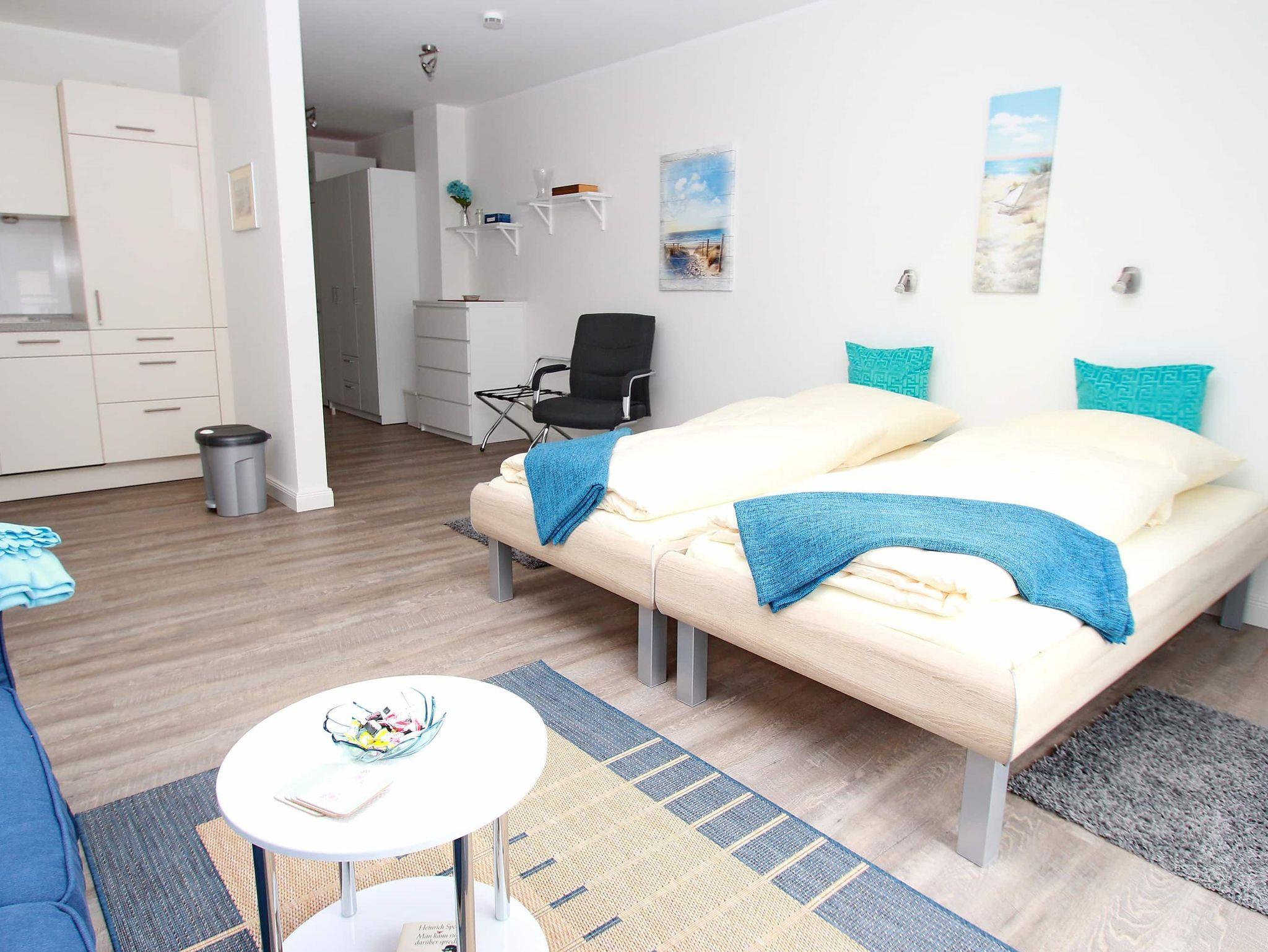 Dieses stufenlose, exklusive Appartement mit günstigen Übernachtungspreisen liegt zentral und ist gehbehindertenfreundlich. Im hellen Wohnraum des Neubaus befinden sich neben der offenen Einbauküche eine gemütliche Couch mit einem Couchtisch und ein Esstisch mit zwei Stühlen. Gegenüber stehen zwei bequeme Einzelbetten (je 90 cm x 190 cm). Im Flurbereich mit einer Garderobe und einem Kleiderschrank geht separat das moderne Duschbad ab. Rundum eine schöne, neue Wohneinheit mit sonnigem Balkon für junge und ältere Urlaubsgäste.
