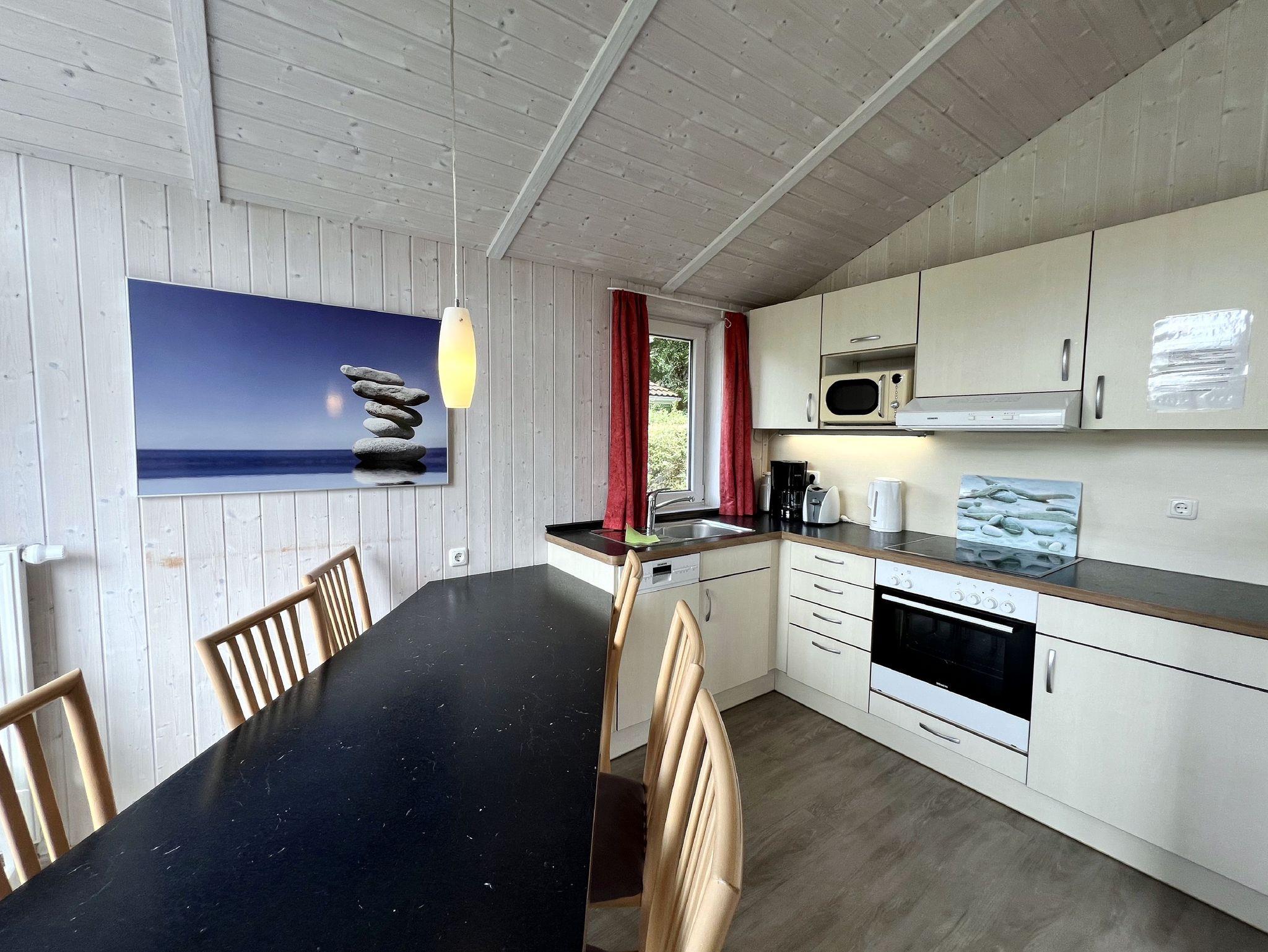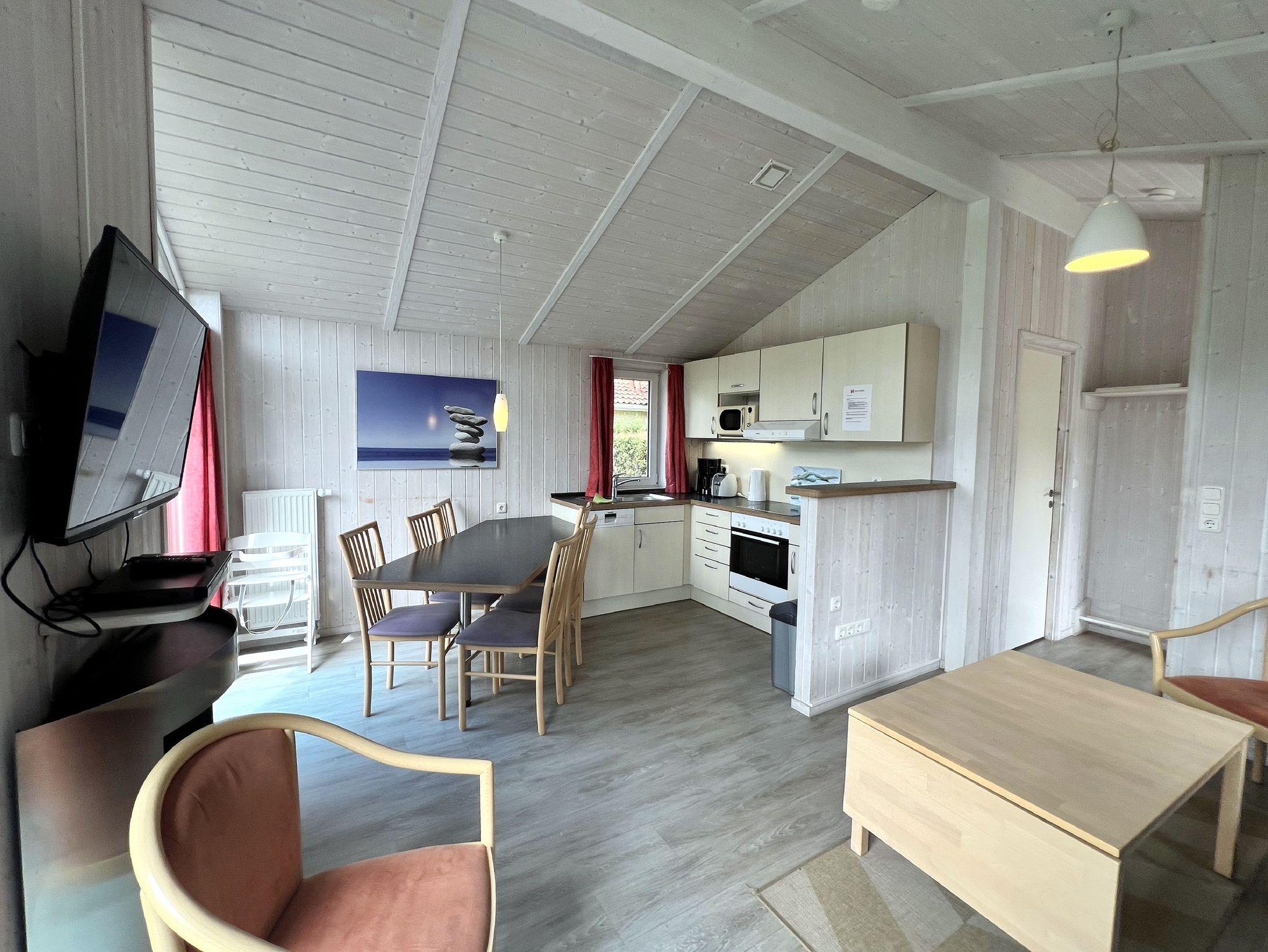 Das Wohnzimmer und die Küche liegen in offener Verbindung miteinander. Im Wohnzimmer finden Sie einen Bioethanolofen sowie den Ausgang auf die Terrasse. Das Ferienhaus bietet ausreichend Platz für bis zu 4 Personen und verfügt über 2 Schlafzimmer, ein Bad mit Dusche und Sauna sowie eine voll ausgestattete Küche.