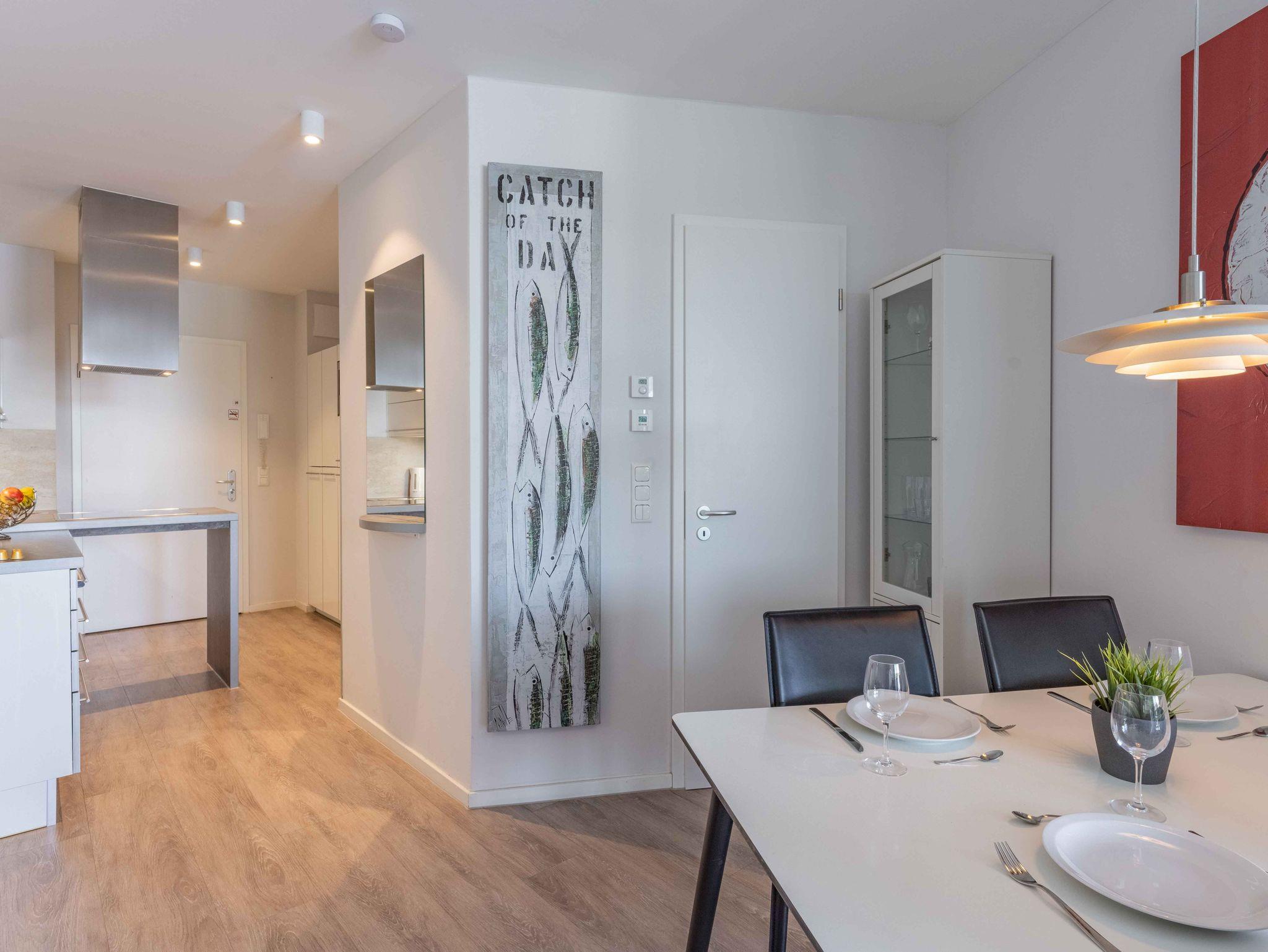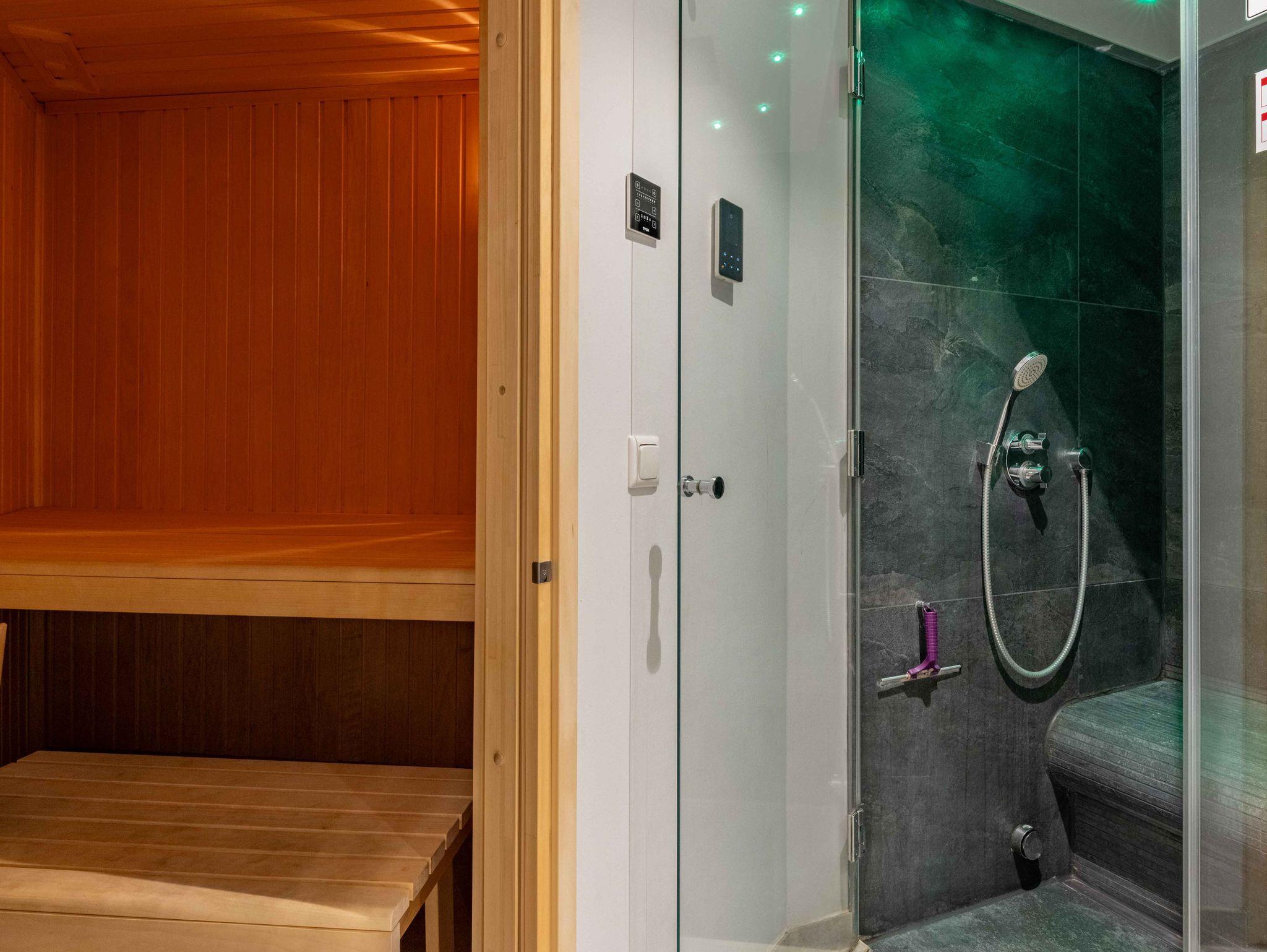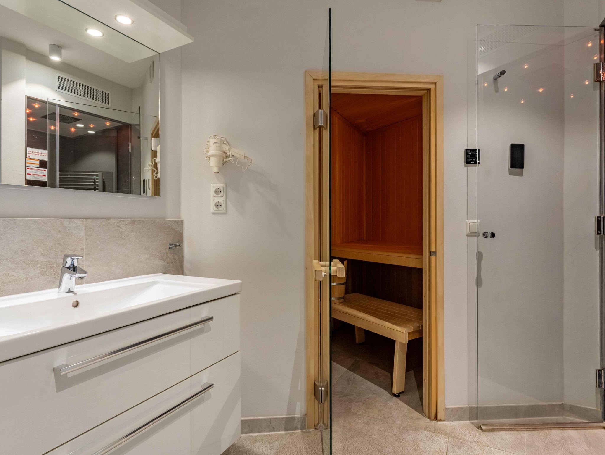Die Wohnung ist stilvoll, hochwertig und modern eingerichtet. Ein besonderes Highlight ist ihr persönlicher Wellnessbereich mit Sauna, Whirlpool und Dampfbad mit integrierter Doppel-