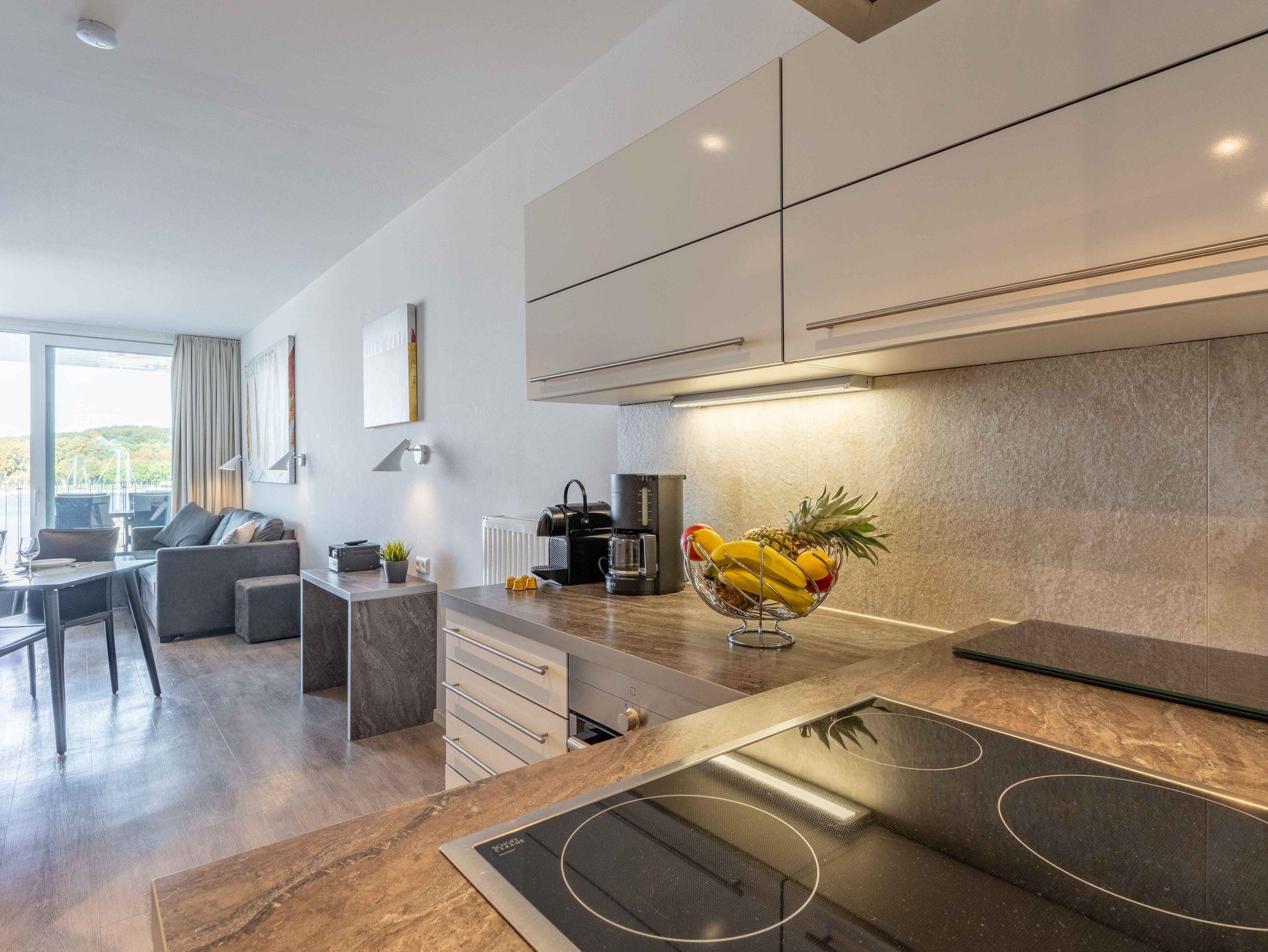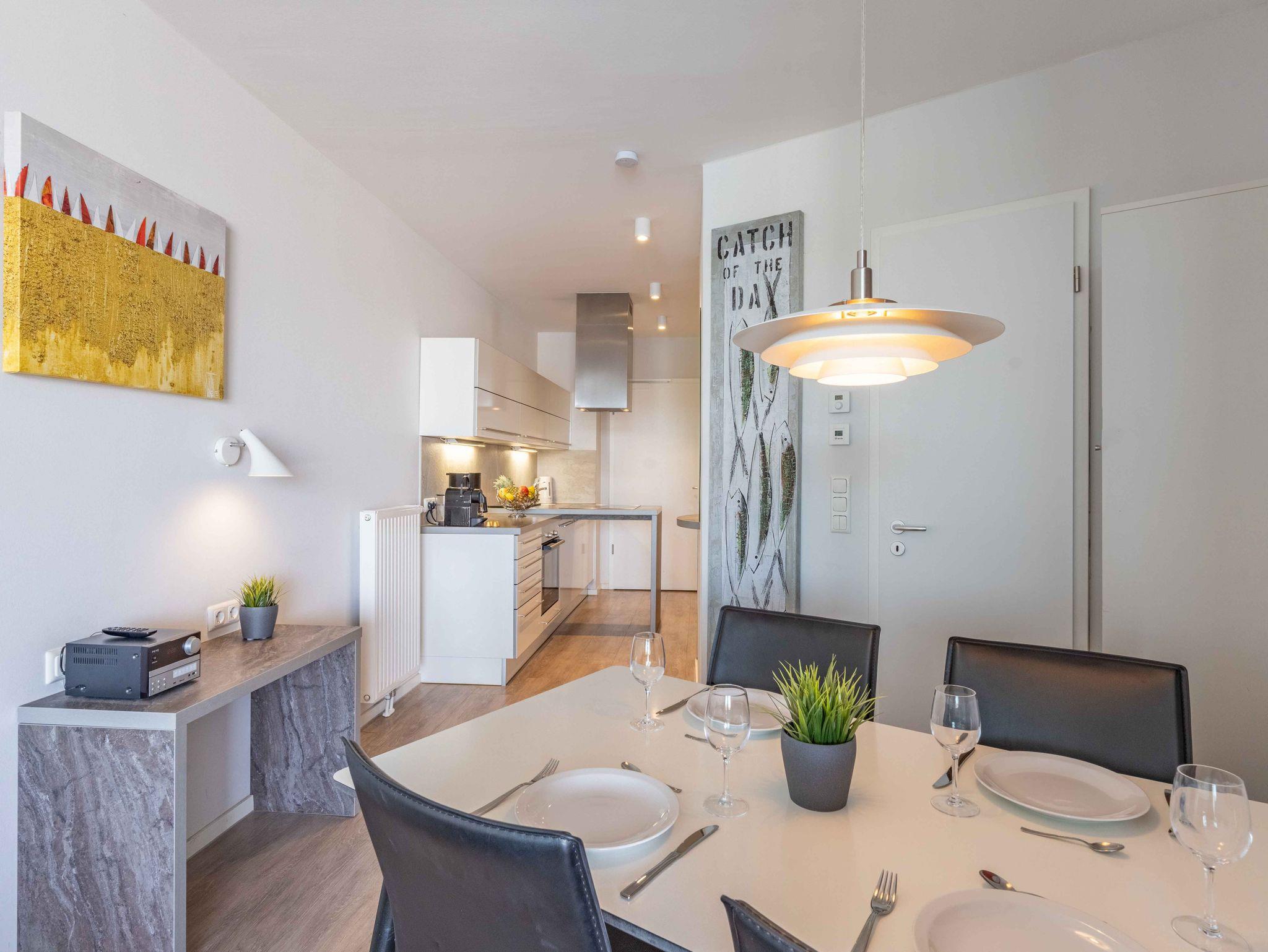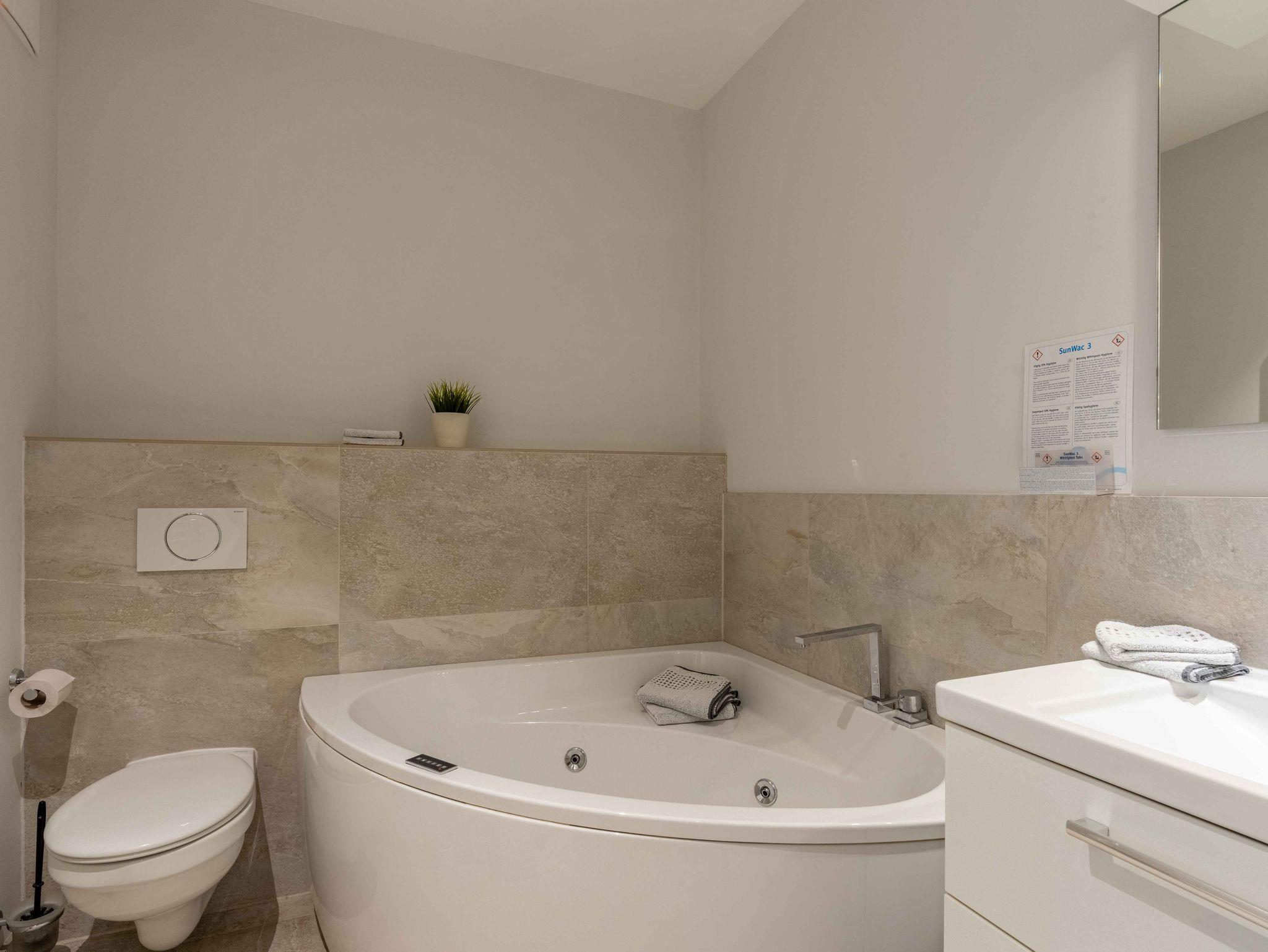Die Wohnung ist stilvoll, hochwertig und modern eingerichtet. Ein besonderes Highlight ist ihr persönlicher Wellnessbereich mit Sauna, Whirlpool und Dampfbad mit integrierter Doppel-
