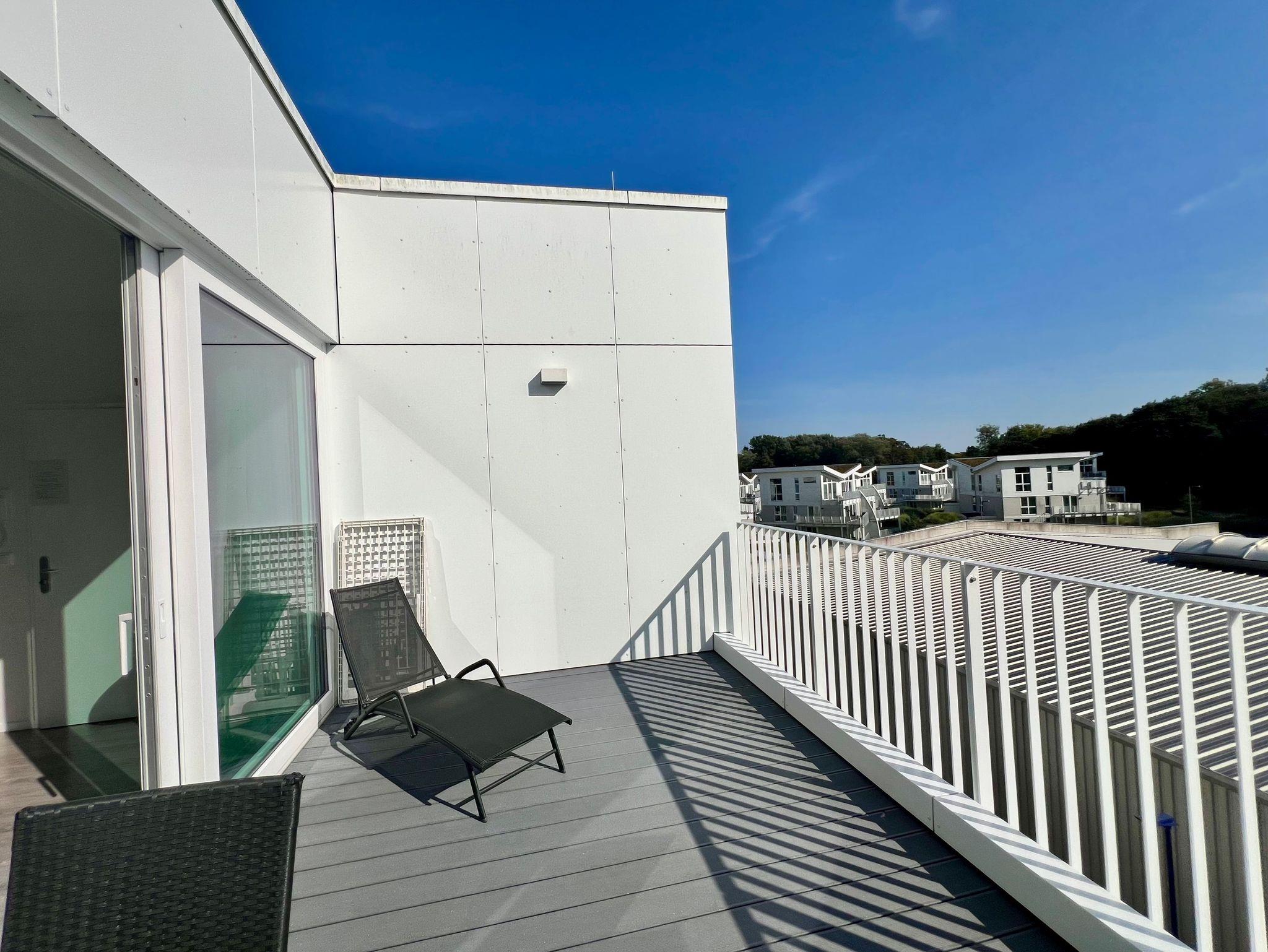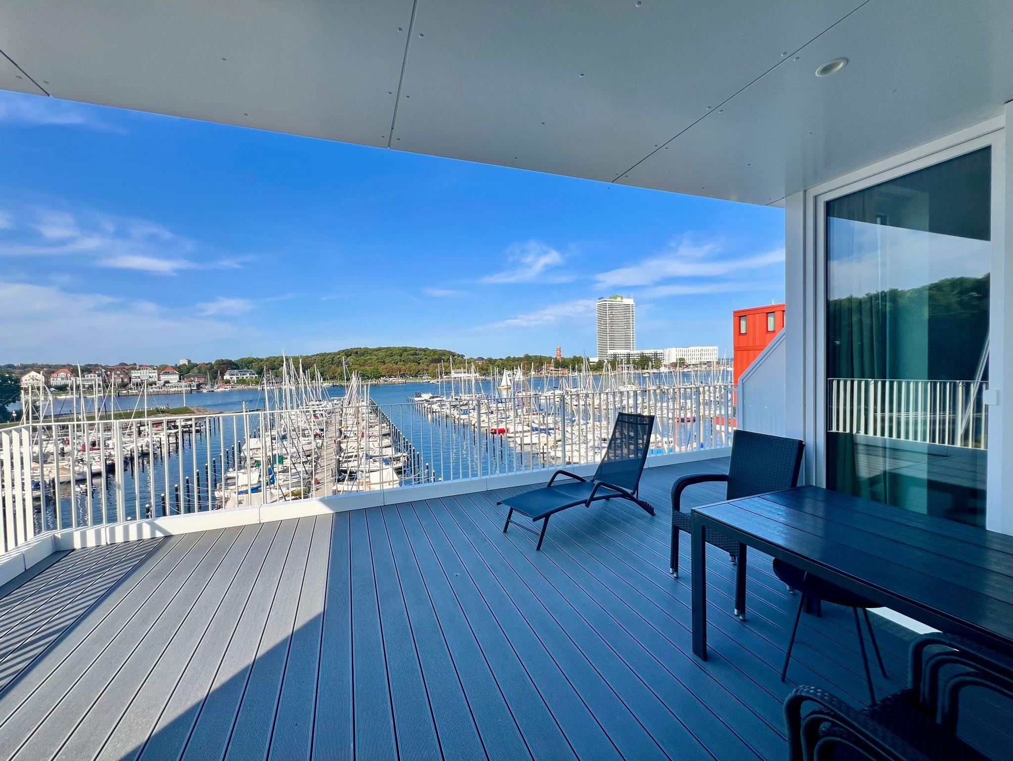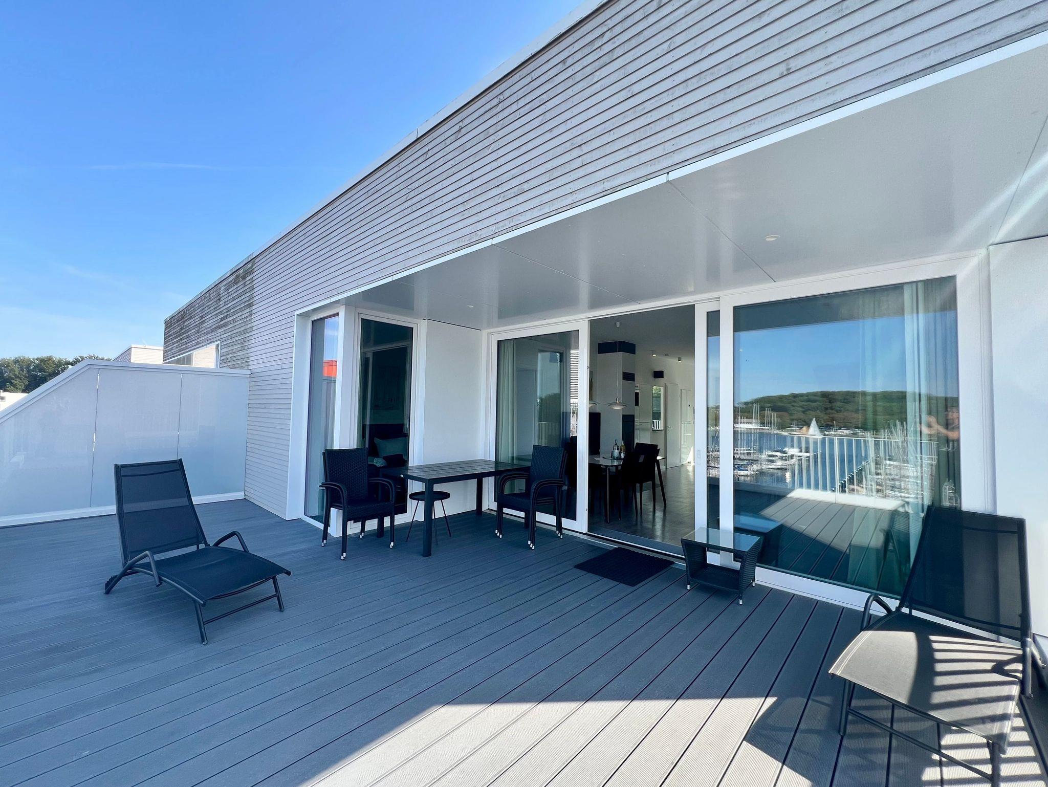 Auf der einen Terrasse können Sie in der Sonne im Windschatten frühstücken, auf der Terrasse zur Seeseite kann man sich auf der Sonnenliege an den vorbeigleitenden Ostsee-Fähren bei einem Sonnenbad erfreuen, um anschließend bei einem Sundowner den Sonnenuntergang vor der Skyline von Travemünde zu genießen.