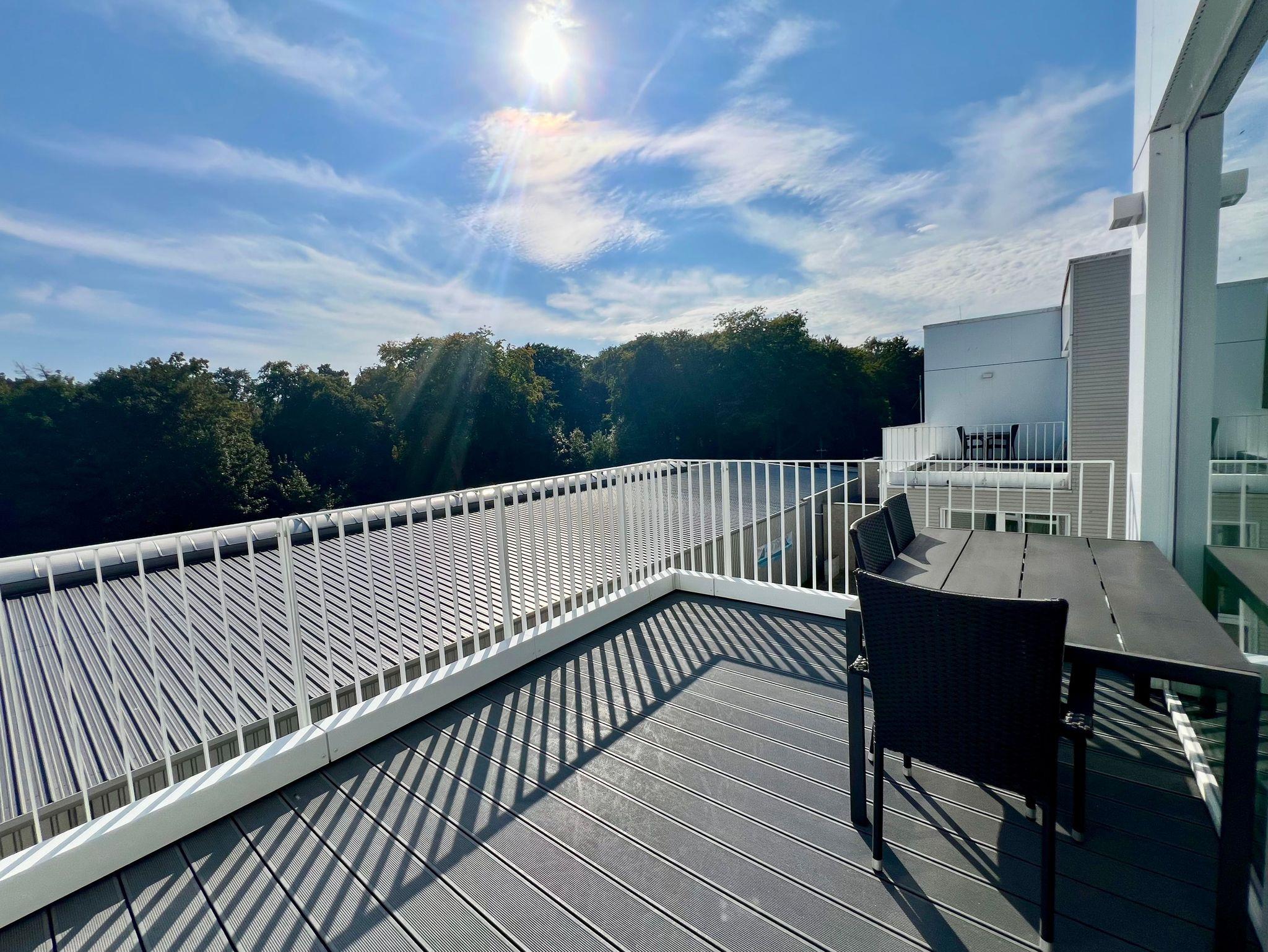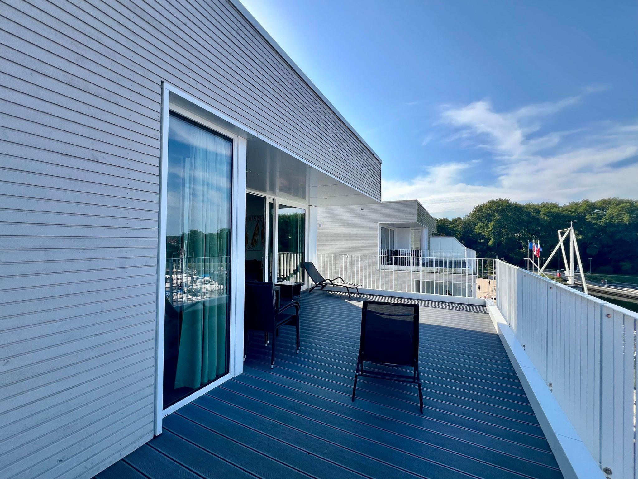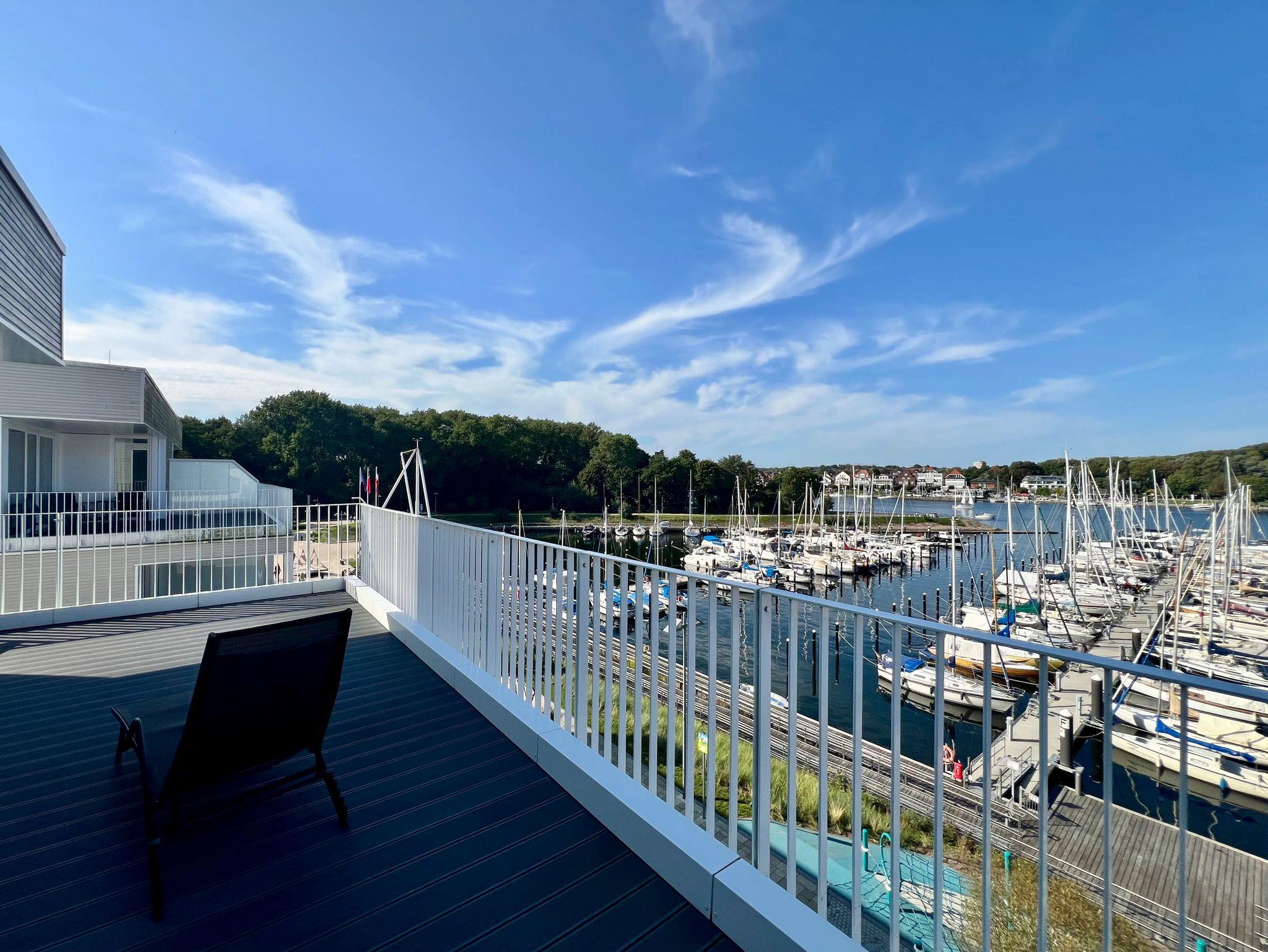 Auf der einen Terrasse können Sie in der Sonne im Windschatten frühstücken, auf der Terrasse zur Seeseite kann man sich auf der Sonnenliege an den vorbeigleitenden Ostsee-Fähren bei einem Sonnenbad erfreuen, um anschließend bei einem Sundowner den Sonnenuntergang vor der Skyline von Travemünde zu genießen.