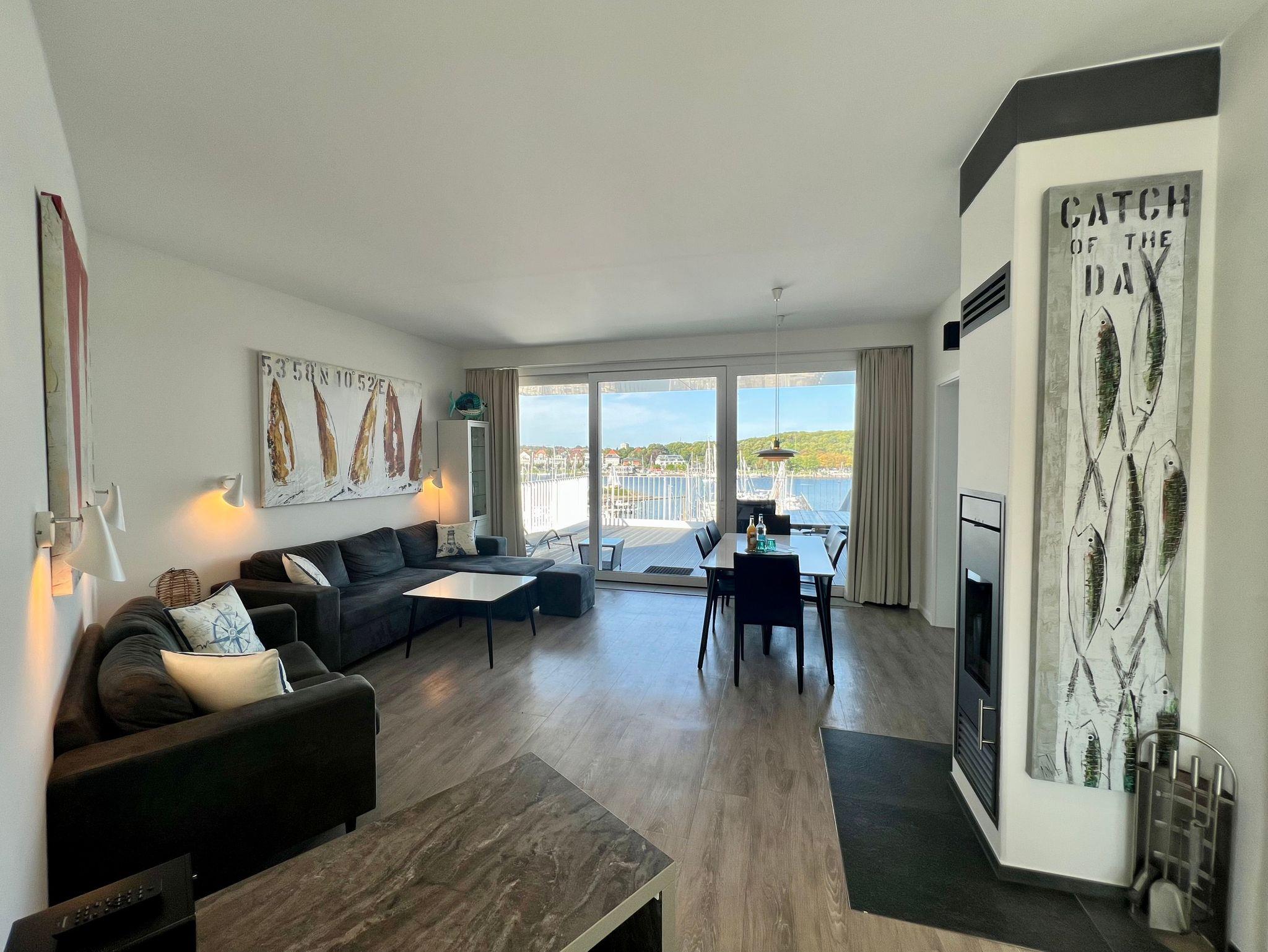 Regendusche. Im Wohnbereich sorgen am Abend die Flammen des Kamins für eine gemütliche Atmosphäre, ebenso wie die vorbeifahrenden großen Schiffe mit ihrer eindrucksvollen nächtlichen Beleuchtung.