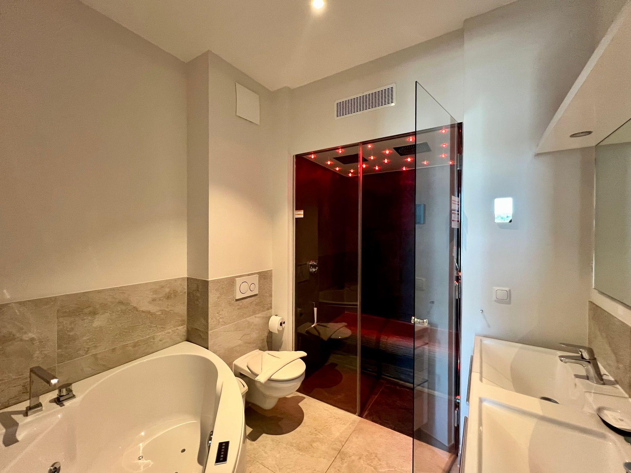 Die Wohnung ist stilvoll, hochwertig und modern eingerichtet. Ein besonderes Highlight ist ihr persönlicher Wellnessbereich mit Sauna, Whirlpool und Dampfbad mit integrierter Doppel-