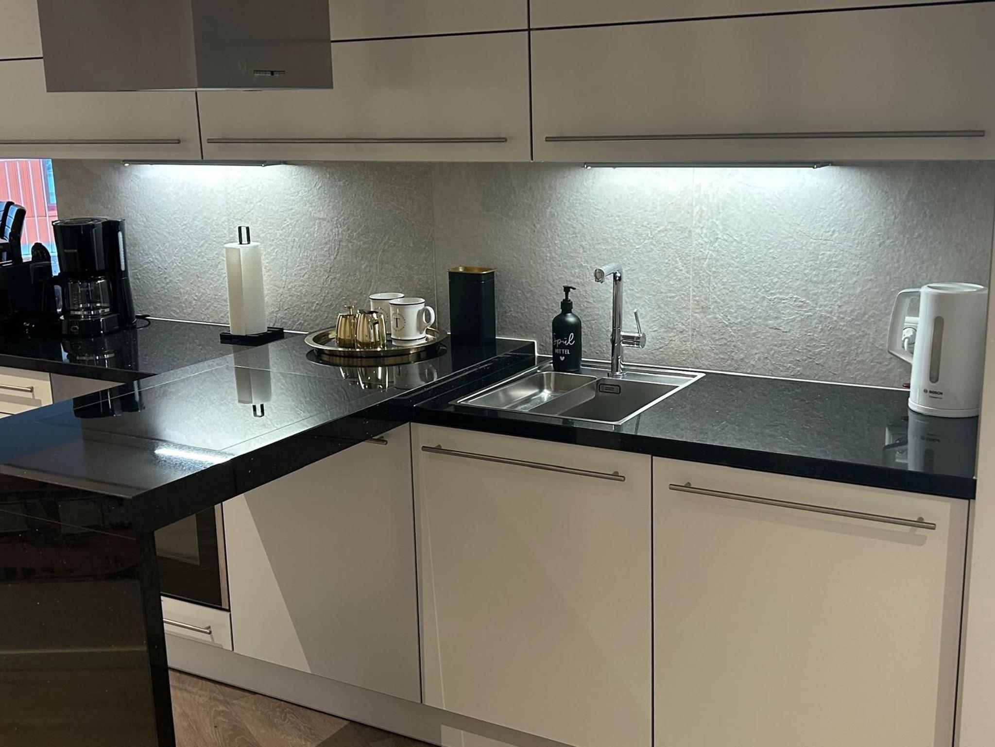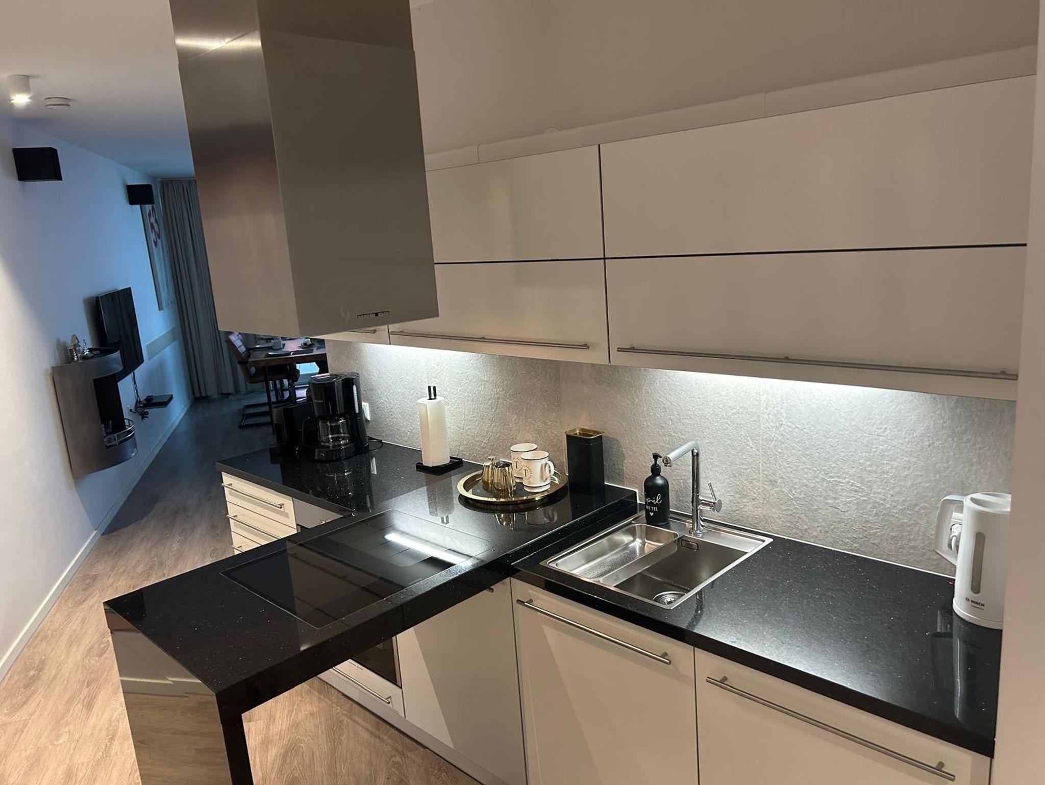 Die Wohnung ist stilvoll, hochwertig und modern eingerichtet. Ein besonderes Highlight ist ihr persönlicher Wellnessbereich mit Sauna, Whirlpool und Dampfbad mit integrierter Doppel-