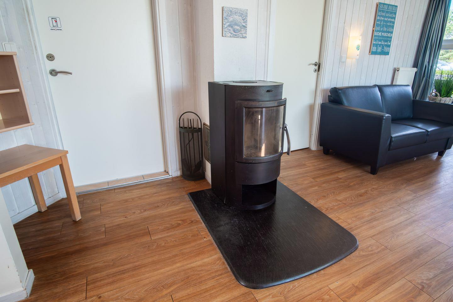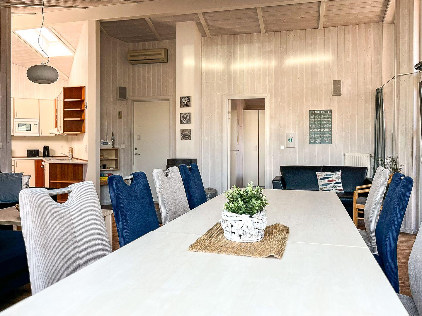 Der offene Wohn- und Essbereich ist der perfekte Ort, um zusammenzukommen. Ein modernes Sofa und ein einladender Essbereich schaffen eine gemütliche Atmosphäre. Der Kaminofen sorgt für wohlige Wärme, während der Flachbild-TV, das Radio mit CD-Spieler und der DVD-Player für Unterhaltung sorgen. Große Fenster mit Vorhängen garantieren eine angenehme Privatsphäre.