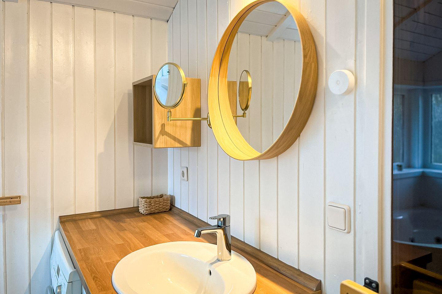 Das Badezimmer bietet eine Sauna, einen Whirlpool (für bis zu 2 Personen), eine bodengleiche Dusche, ein WC und ein Waschbecken.