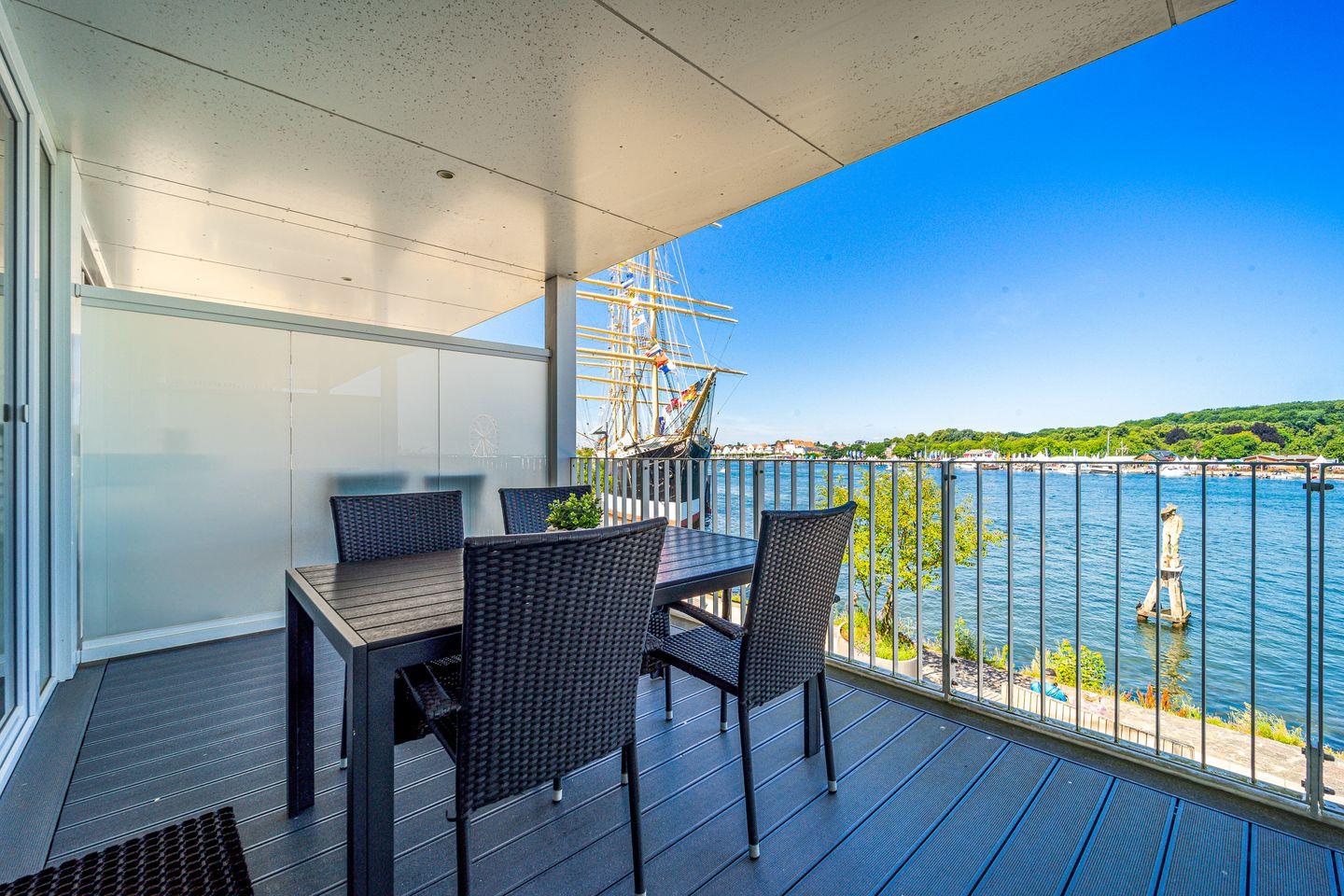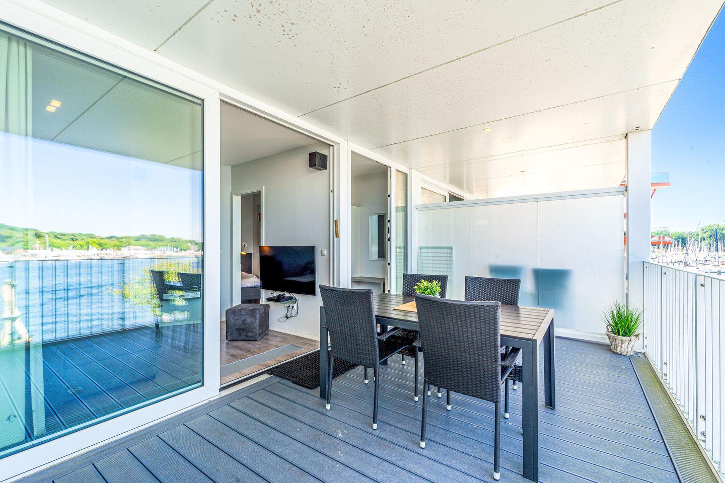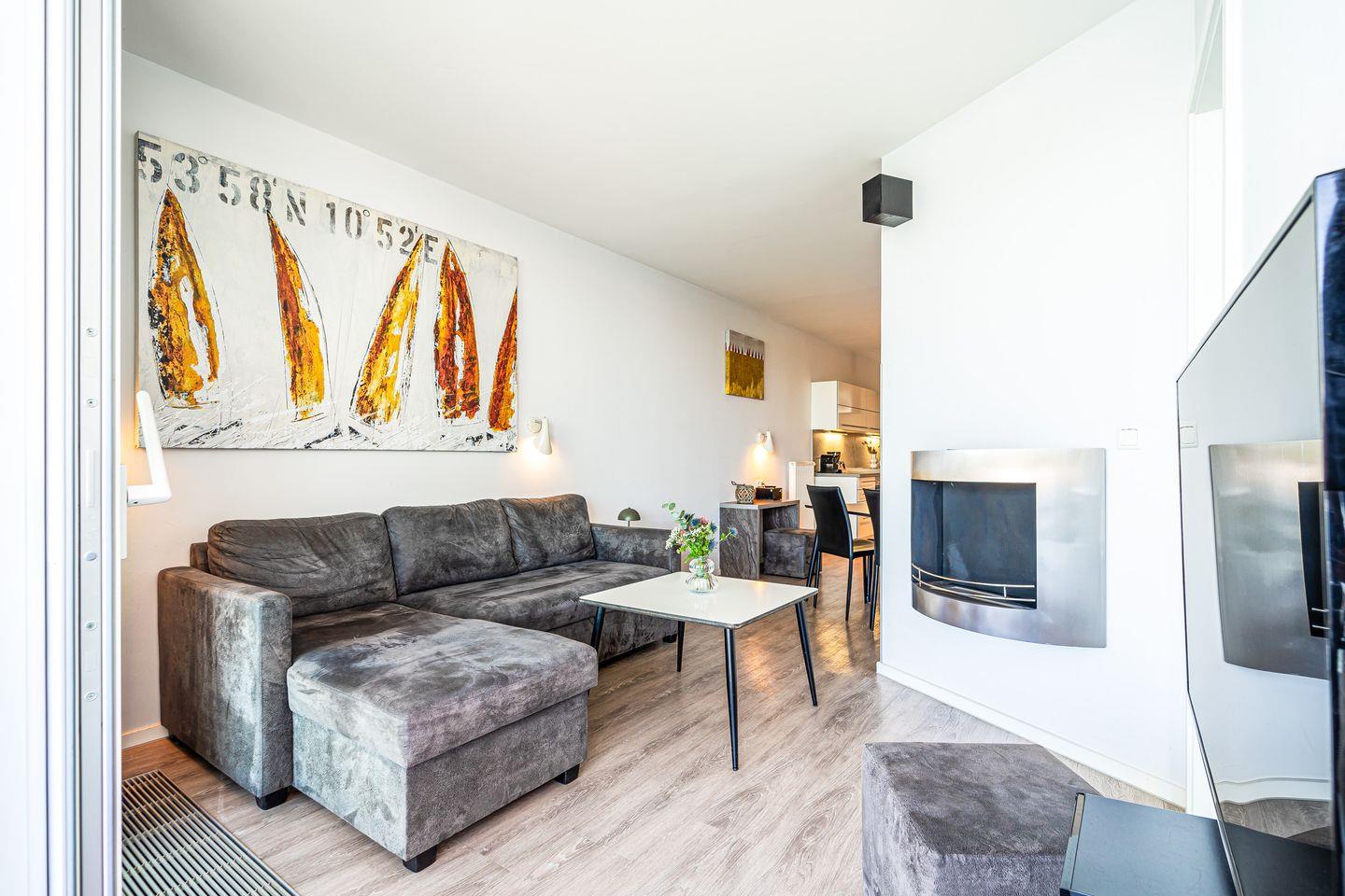 Der Wohnbereich ist hochwertig eingerichtet mit Sofa, Sesseln, HiFi-Anlage, Blu-ray-Player und zwei Flachbild-TVs. Ein besonderes Highlight ist der Bioethanolkamin, der abends für eine warme und behagliche Atmosphäre sorgt. Das Sofa lässt sich bei Bedarf in zwei bequeme Schlafplätze verwandeln. Durch die großen Fenster kannst Du jederzeit den traumhaften Panoramablick über den Segelhafen, die Travemündung, das Museumsschiff „Passat“ und die vorbeiziehenden Skandinavienfähren genießen.