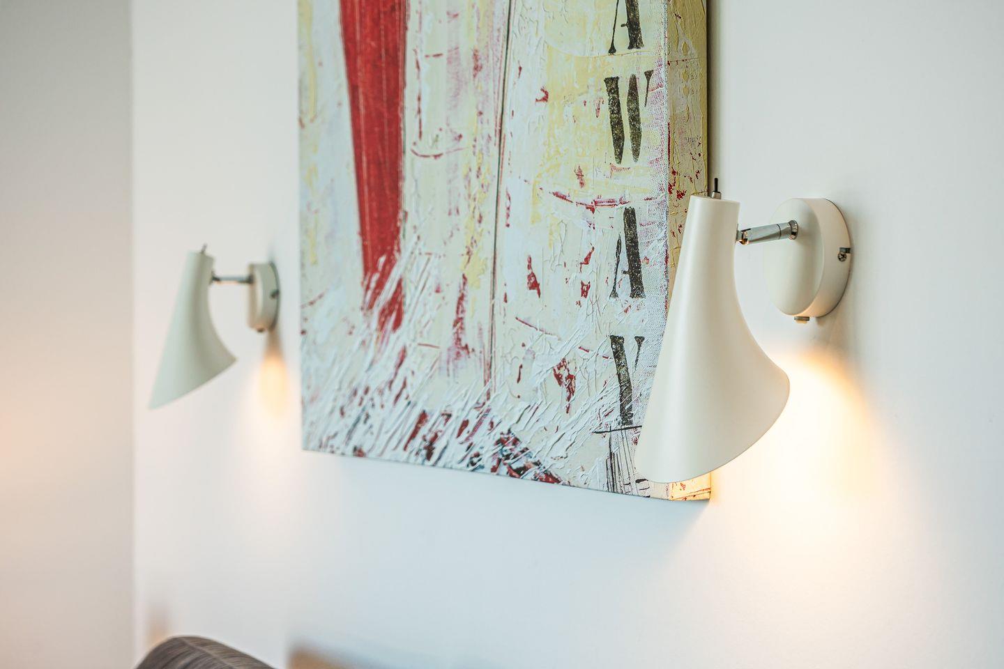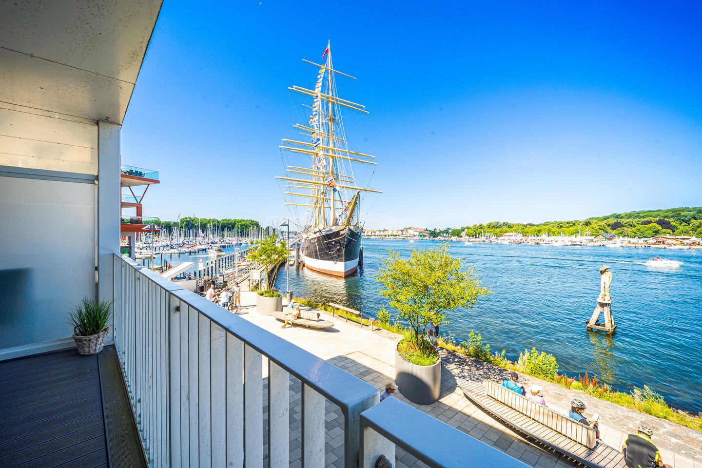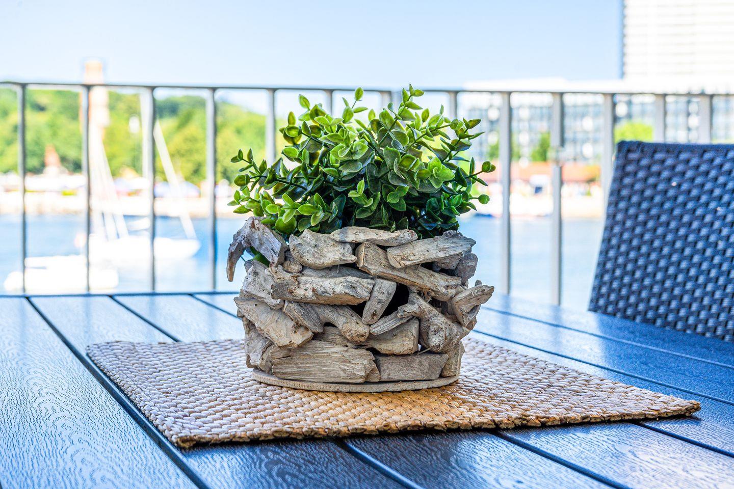 Der Wohnbereich ist hochwertig eingerichtet mit Sofa, Sesseln, HiFi-Anlage, Blu-ray-Player und zwei Flachbild-TVs. Ein besonderes Highlight ist der Bioethanolkamin, der abends für eine warme und behagliche Atmosphäre sorgt. Das Sofa lässt sich bei Bedarf in zwei bequeme Schlafplätze verwandeln. Durch die großen Fenster kannst Du jederzeit den traumhaften Panoramablick über den Segelhafen, die Travemündung, das Museumsschiff „Passat“ und die vorbeiziehenden Skandinavienfähren genießen.
