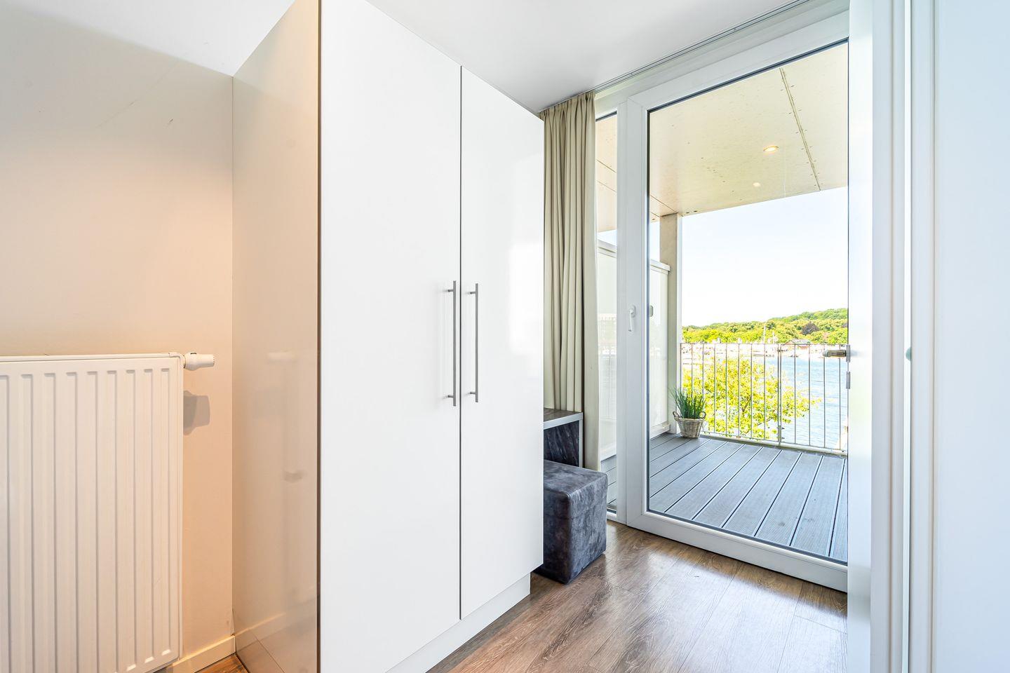 Das Schlafzimmer bietet ein komfortables Doppelbett sowie ausreichend Stauraum. Von hier aus hast Du ebenfalls einen wunderbaren Blick aufs Wasser – und dank einer eigenen Terrassentür gelangst Du direkt ins Freie. So kannst Du morgens die frische Meeresluft genießen oder den Abend entspannt mit Aussicht ausklingen lassen.
