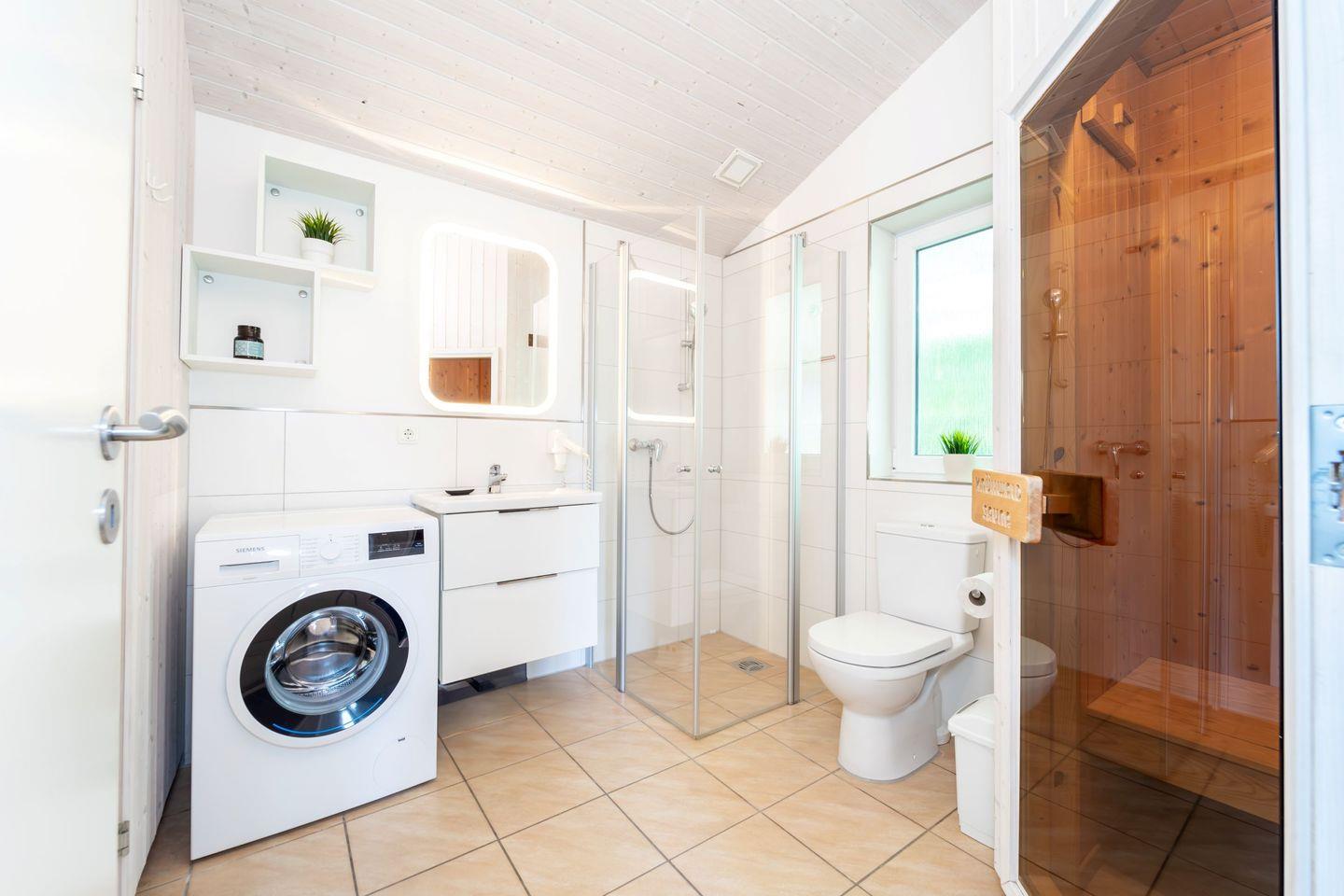 Im Badezimmer findest Du eine bodengleiche Dusche, WC, Waschbecken und einen Haartrockner. Auch die Waschmaschine ist hier untergebracht.