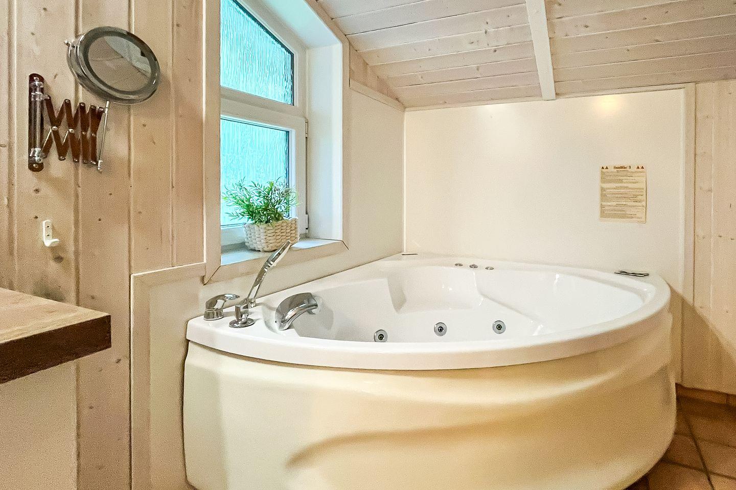 Das Badezimmer bietet eine Sauna, einen Whirlpool (für bis zu 2 Personen), eine bodengleiche Dusche, ein WC und ein Waschbecken.