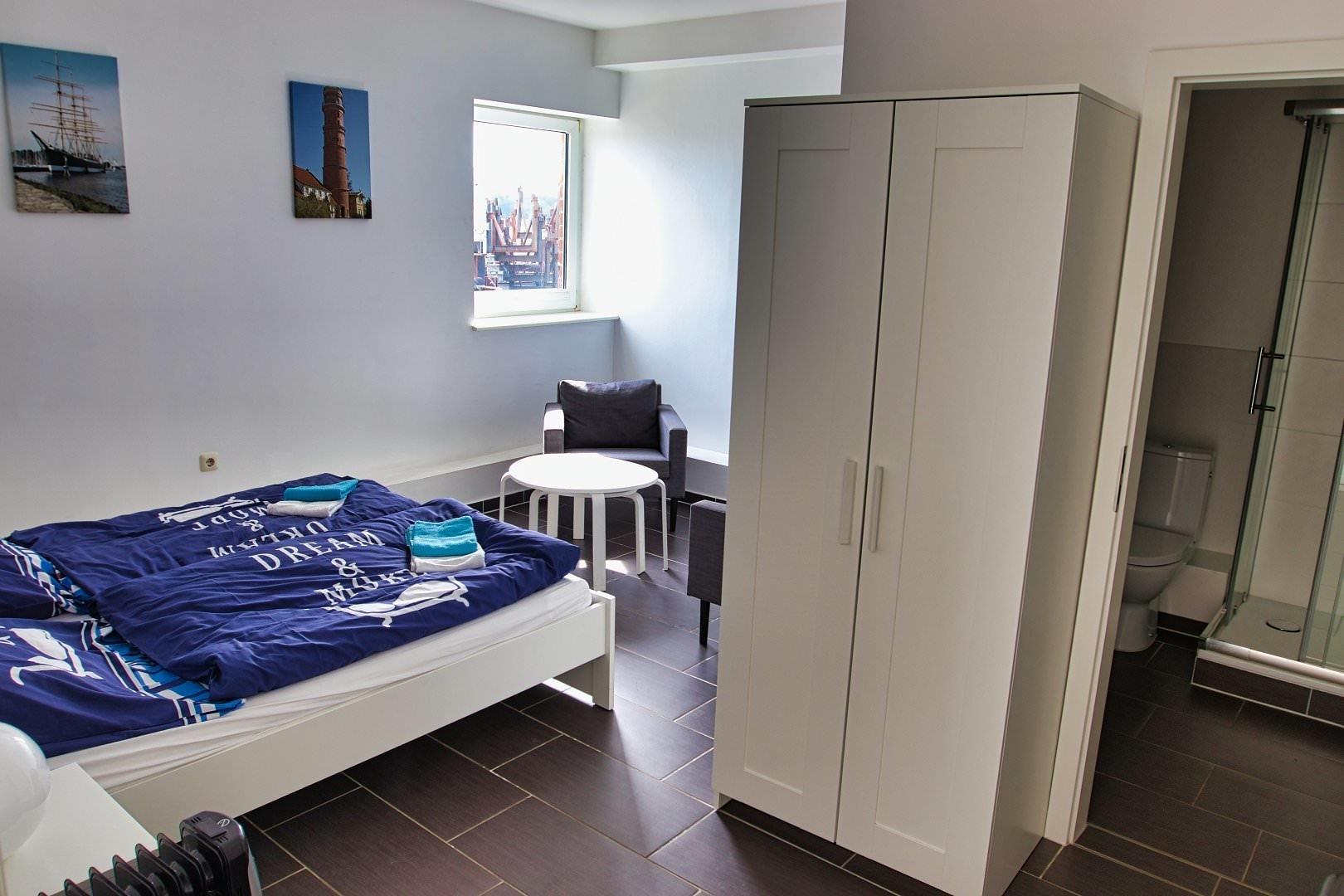 Die Zimmer sind eingerichtet mit einem Kleiderschrank inklusive ausziehbarem Schuhregal und großen Schubladen. Von der Unterkunft aus haben Sie einen schönen Blick auf die Trave und auf das Werftgeschehen, da die Unterkunft direkt vor dem Kranplatz liegt. Innerhalb der Woche werden hier Boote gekrant, was durchaus spannend sein kann, dies einmal aus direkter Nähe und ohne Gefahr zu beobachten. Ein schönes Doppelbett mit hochwertiger Matratze (zwei Härtegrade) komplettiert die Einrichtung. Im Zimmer befinden sich Kühlschrank und Wasserkocher. Eine Grundausstattung Geschirr kann ausgeliehen werden. Handtücher, Bettwäsche, Strom und Wasser sind im Preis inbegriffen.