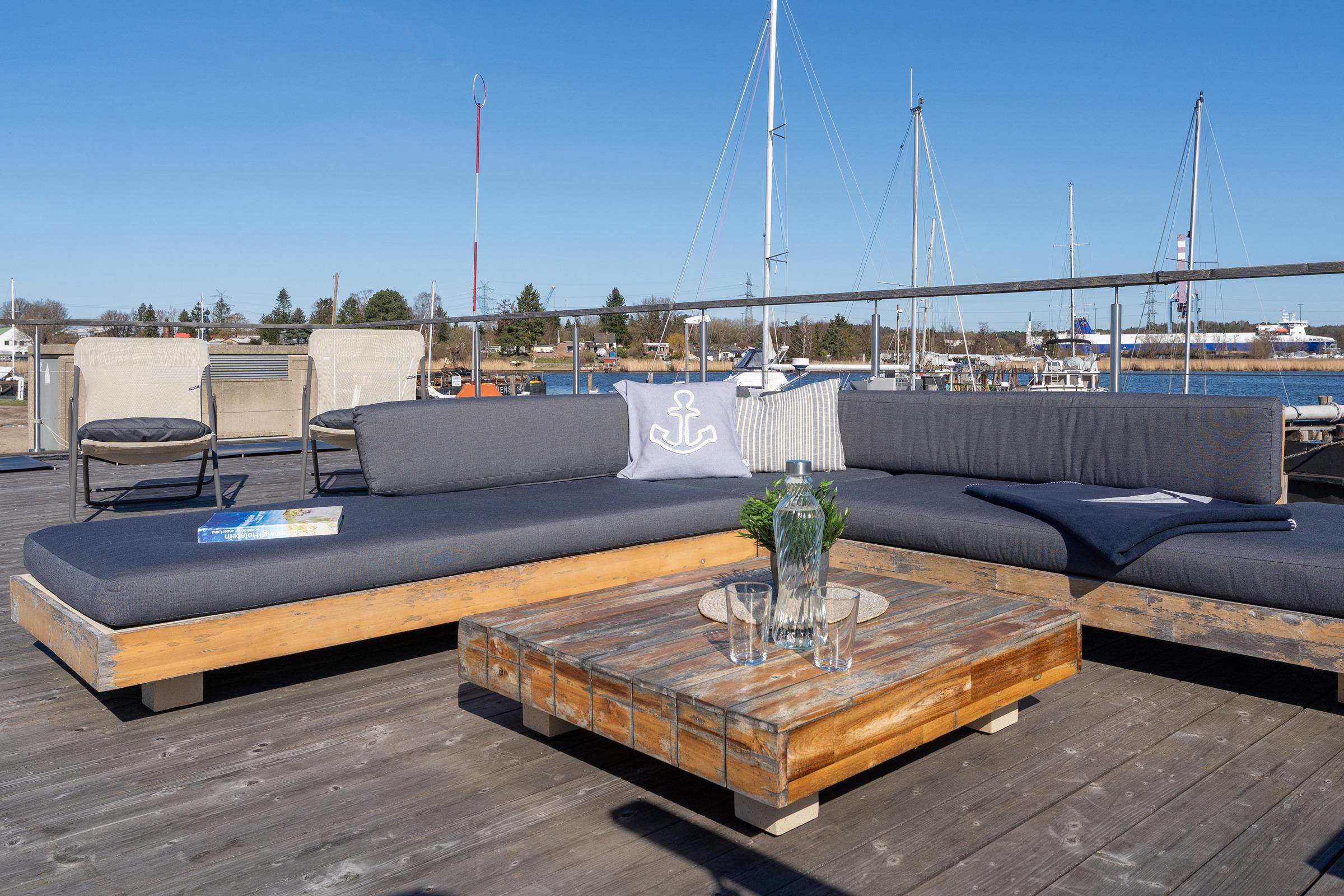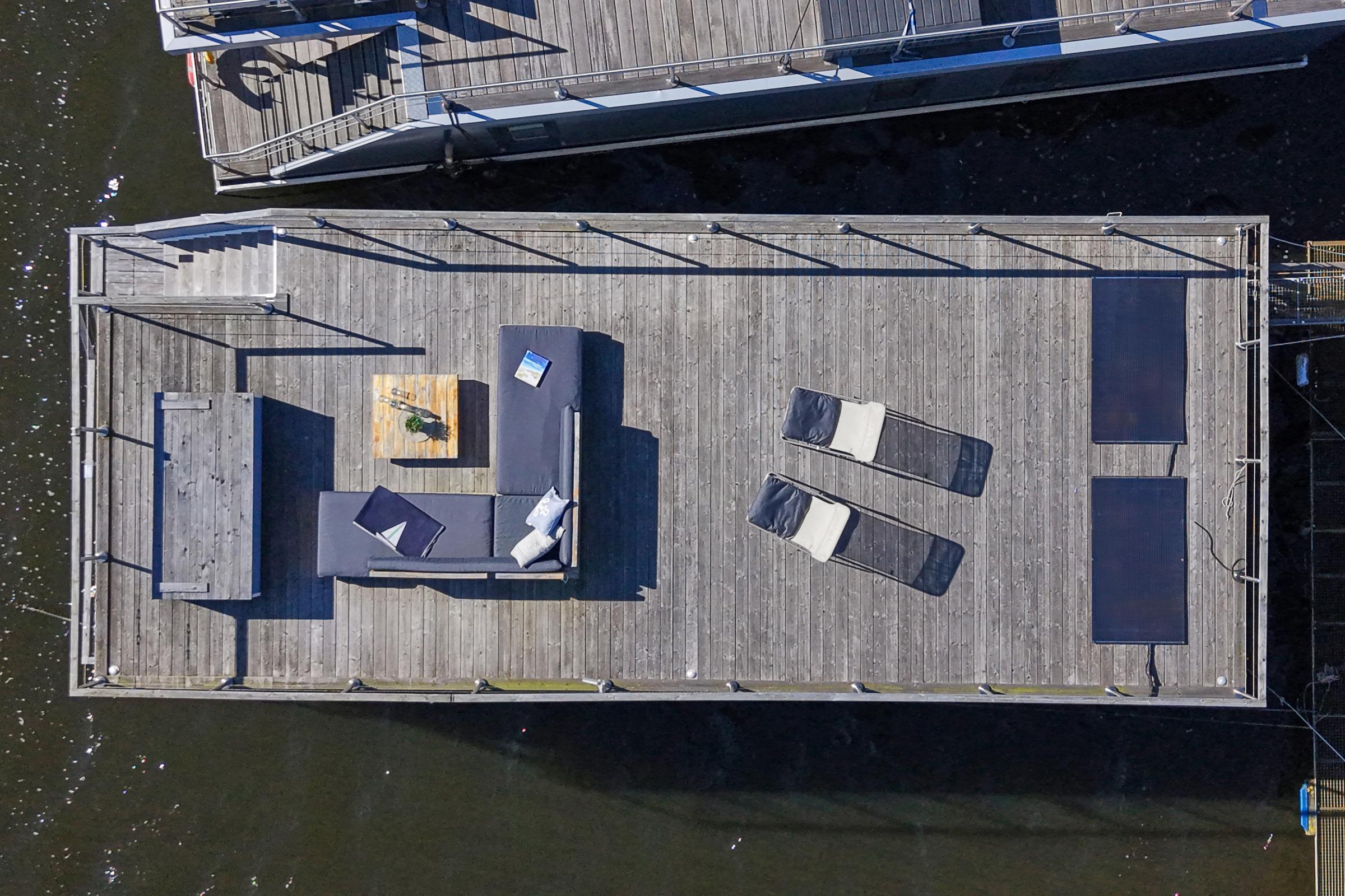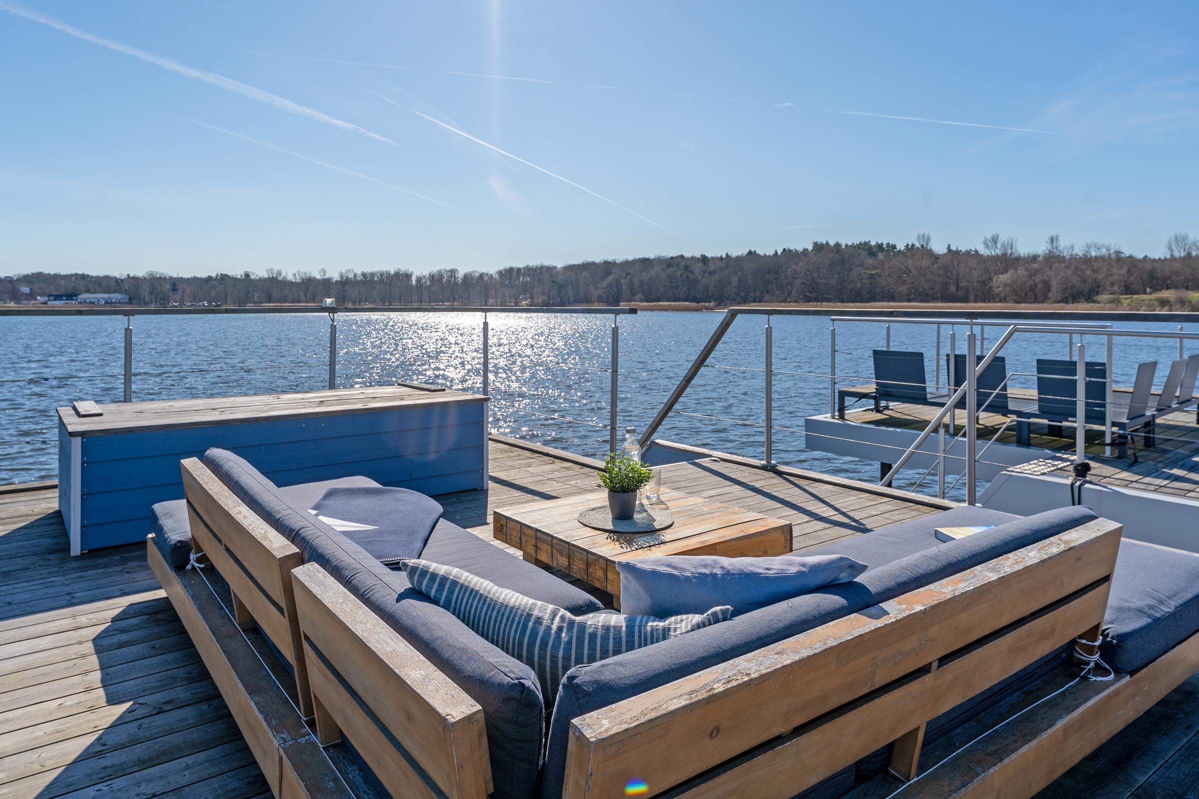 Beim Betreten des Hausboots gelangen Sie in den hellen Wohnbereich, der mit einer gemütlicher Sitzlandschaft, TV und WLAN zum Verweilen einlädt. Von hier aus öffnen sich die Türen zu einer der drei Terrassen, die teilweise überdacht sind und sich perfekt für entspannte Stunden an der frischen Luft eignen. Über eine Treppe gelangen Sie auf die Dachterrasse, von der Sie einen traumhaften Blick ins Grüne genießen können. Ein Grill steht ebenfalls bereit – gesellige Abende sind also garantiert.
