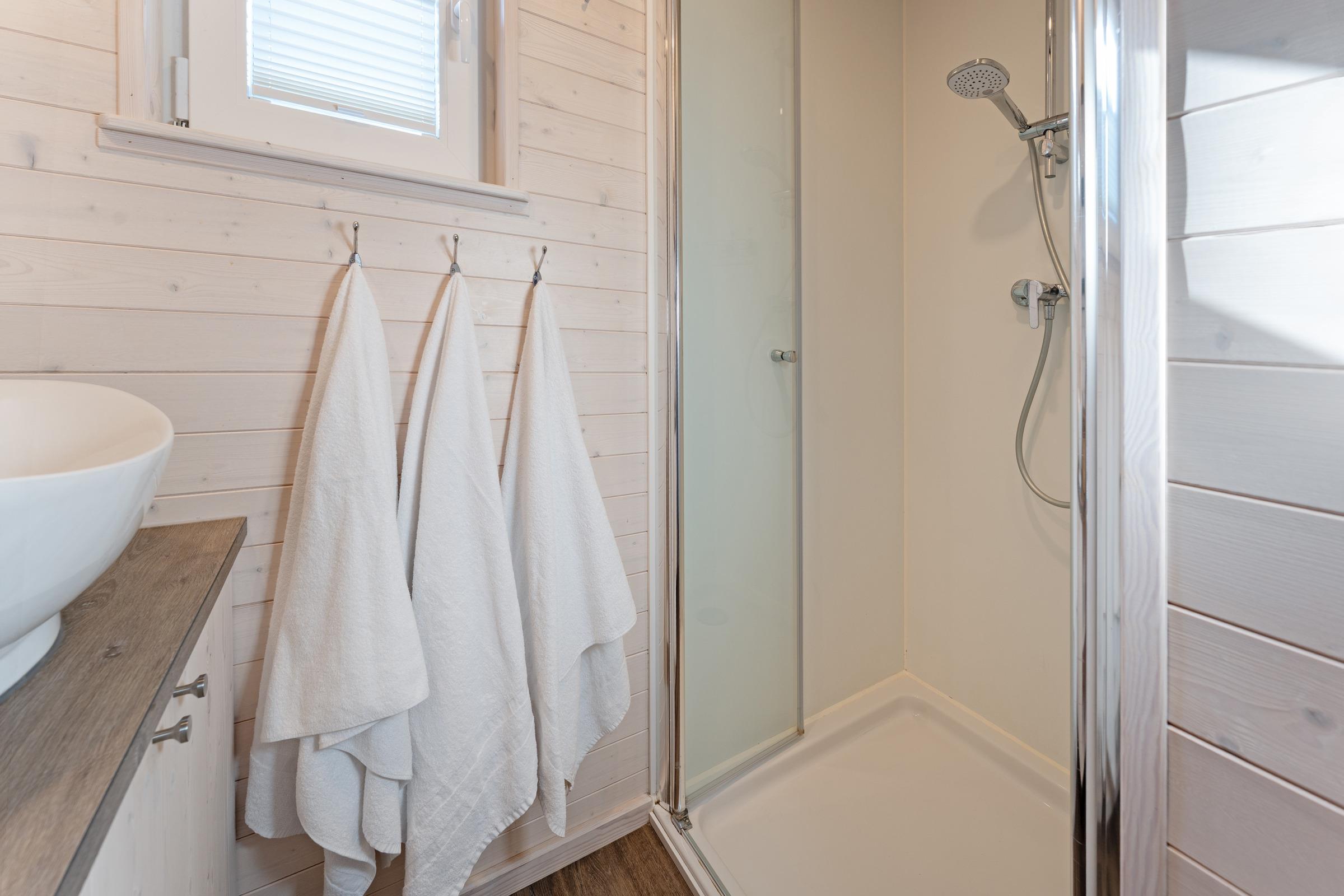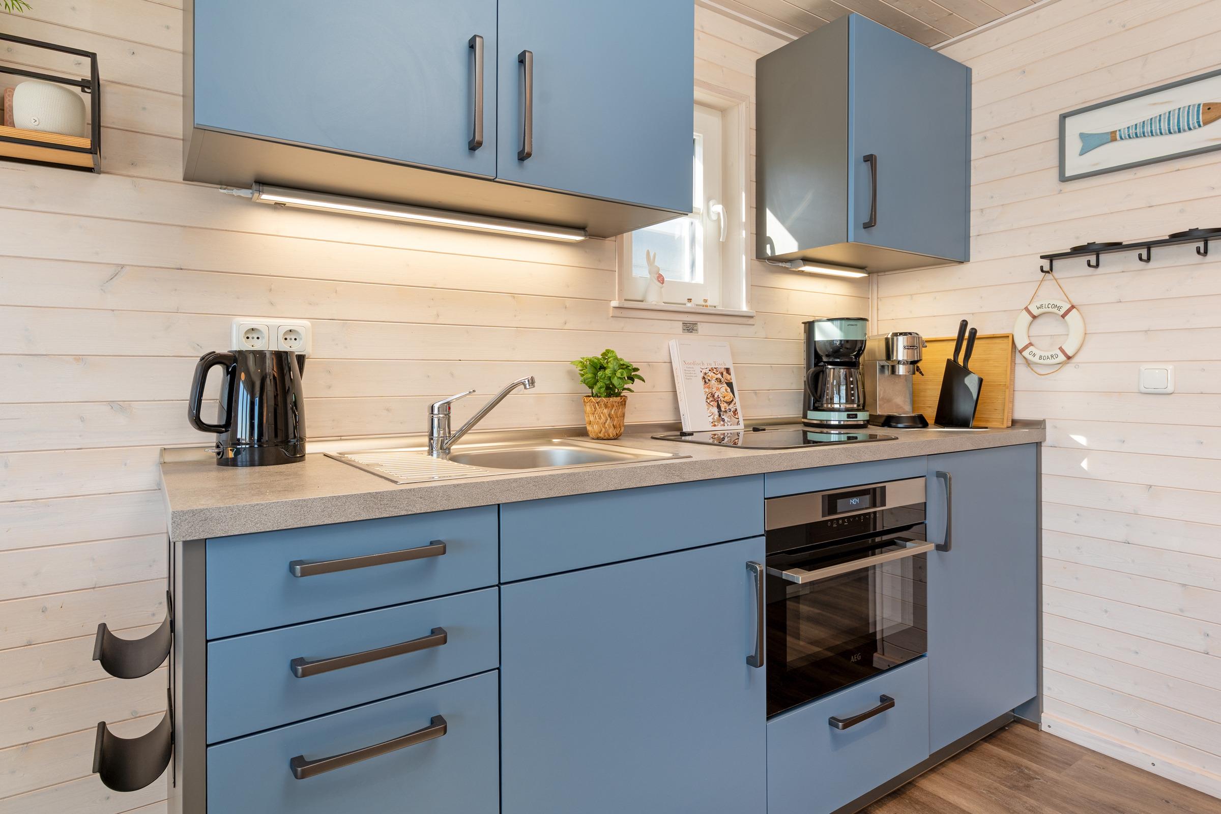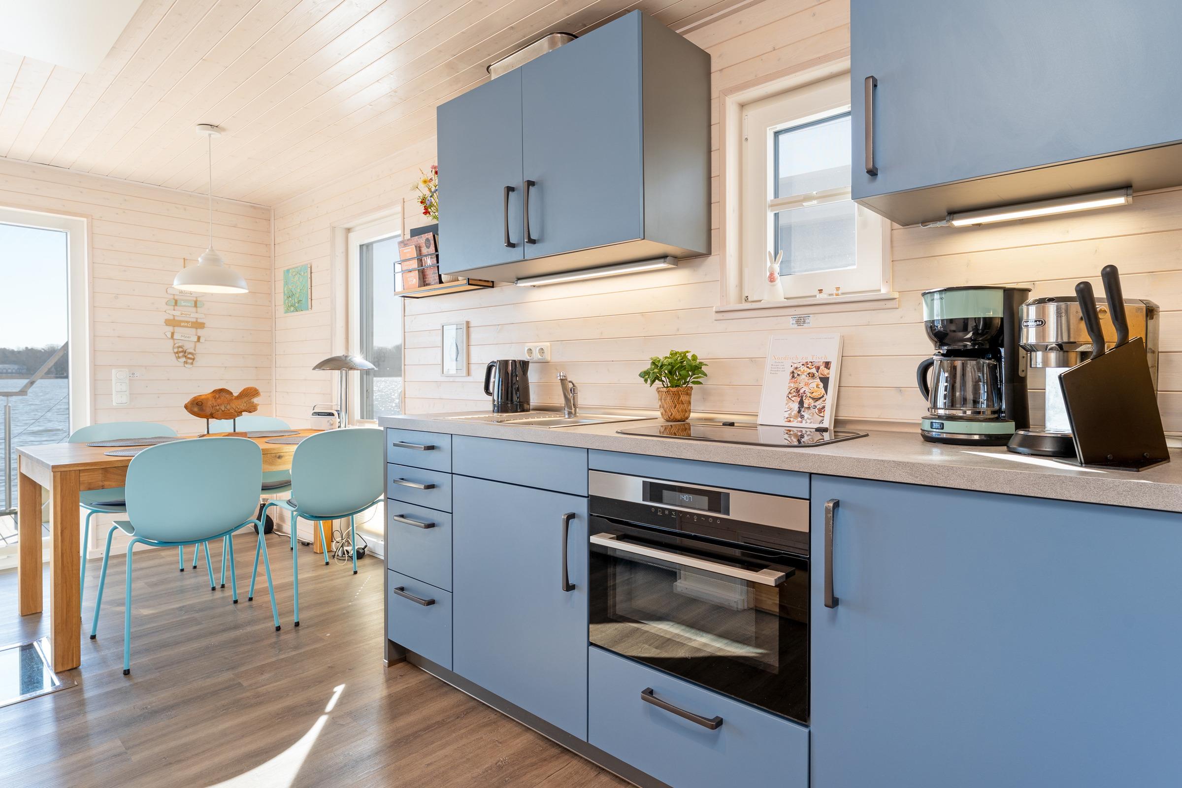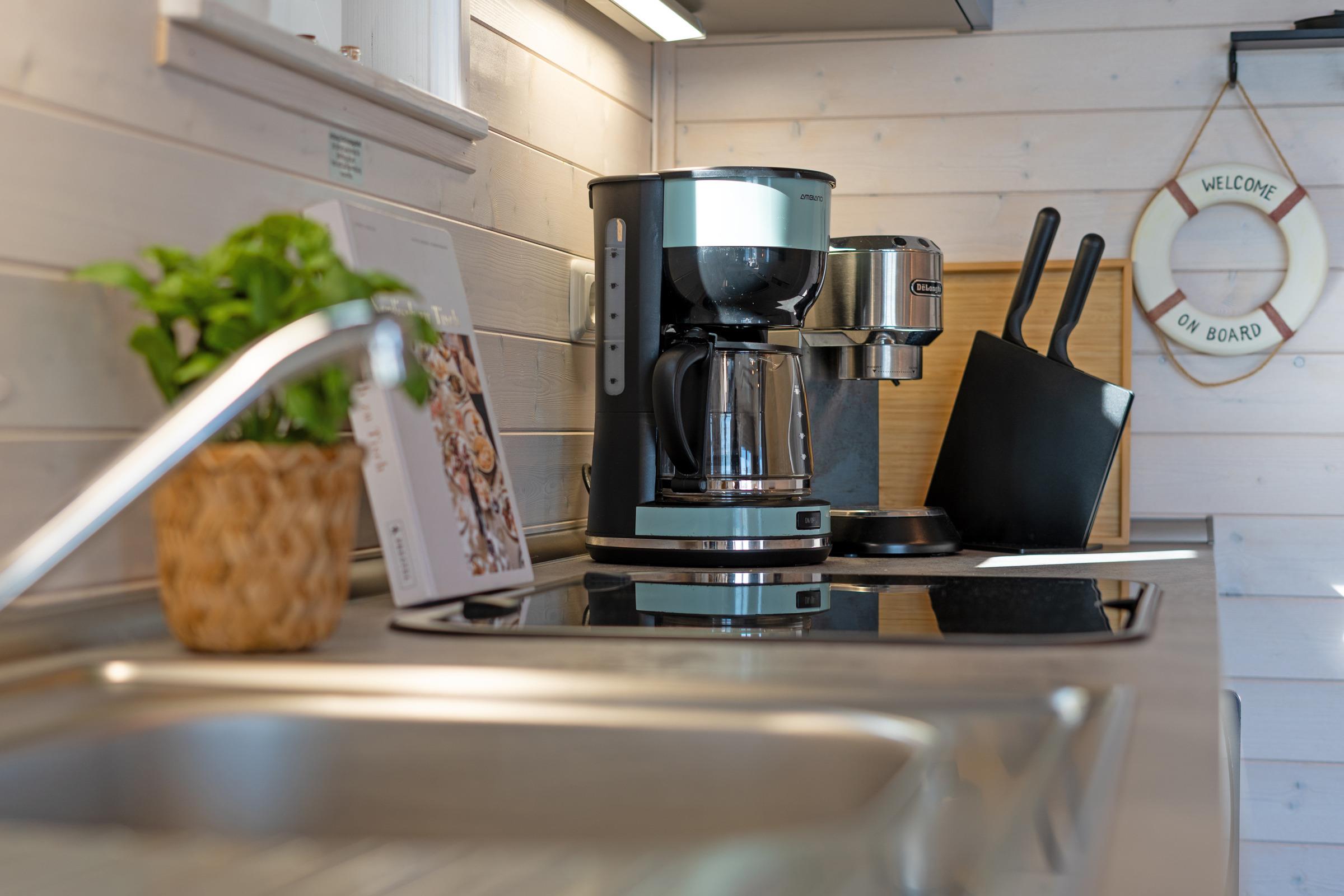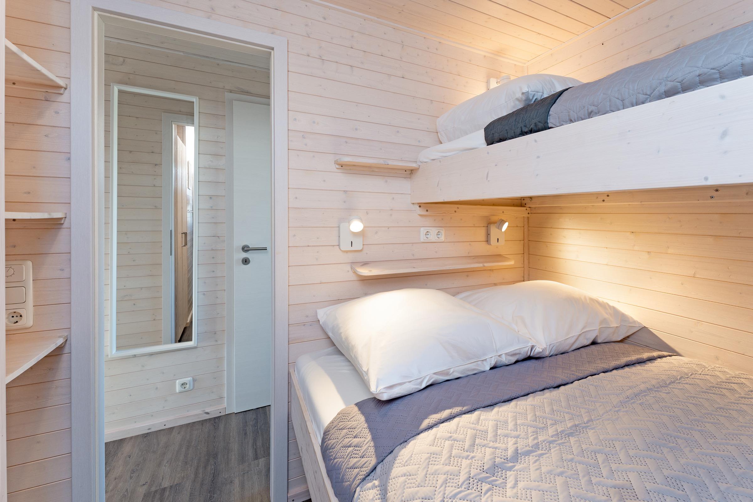 Drinnen geht es weiter mit der offenen Küche mit angrenzendem Essbereich. Diese ist bestens ausgestattet mit Gasherd, Kombigerät (Mikrowelle Backofen), Kühlschrank mit Gefrierfach, Siebträgermaschine, Wasserkocher und Toaster. Zwei separate Schlafzimmer sorgen für erholsamen Schlaf: Ein Schlafzimmer ist mit einem komfortablen Doppelbett ausgestattet, das zweite verfügt über ein Etagenbett und eignet sich ideal für Kinder oder Mitreisende. Das Badezimmer mit Regendusche und das WC befinden sich in separaten Räumen.