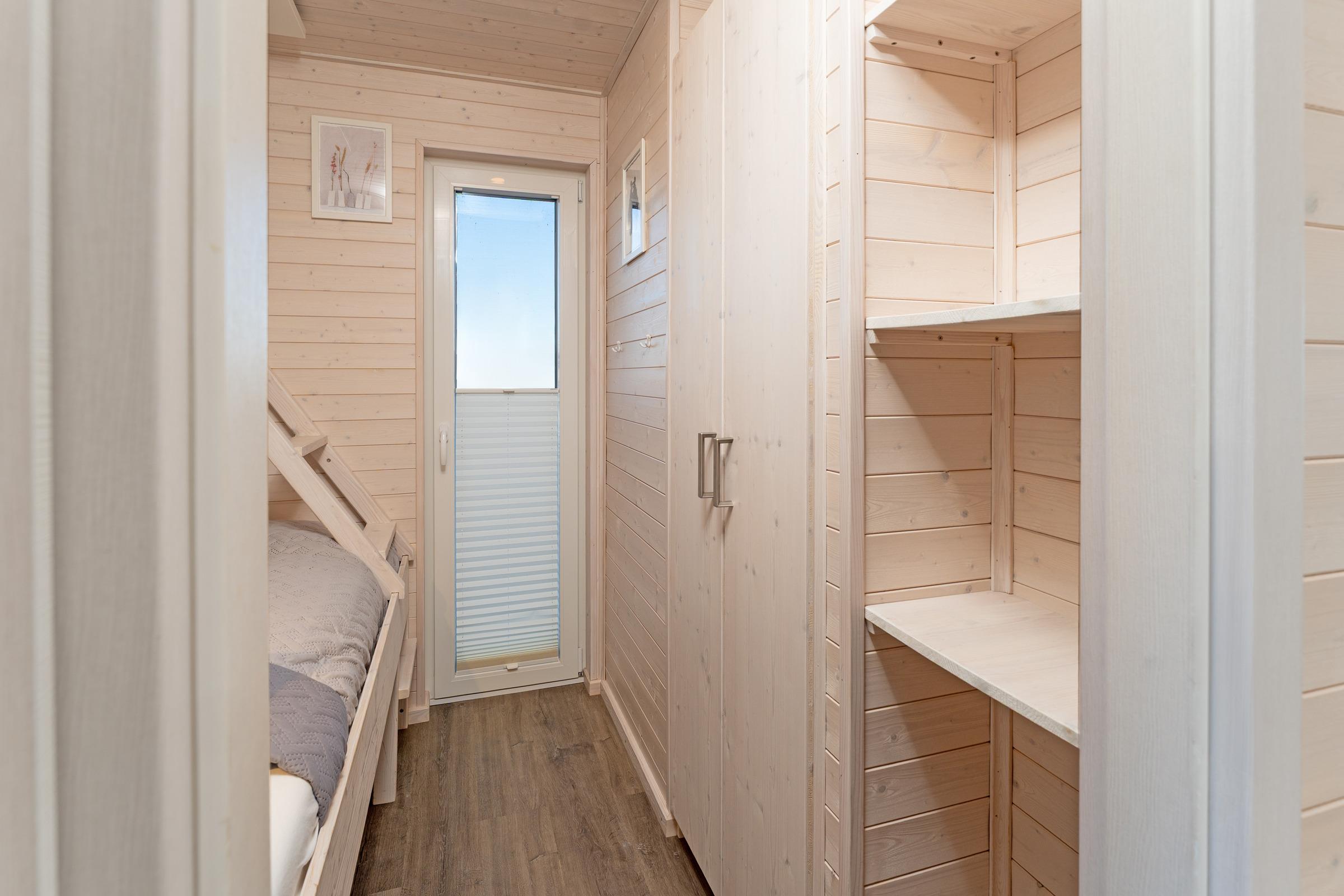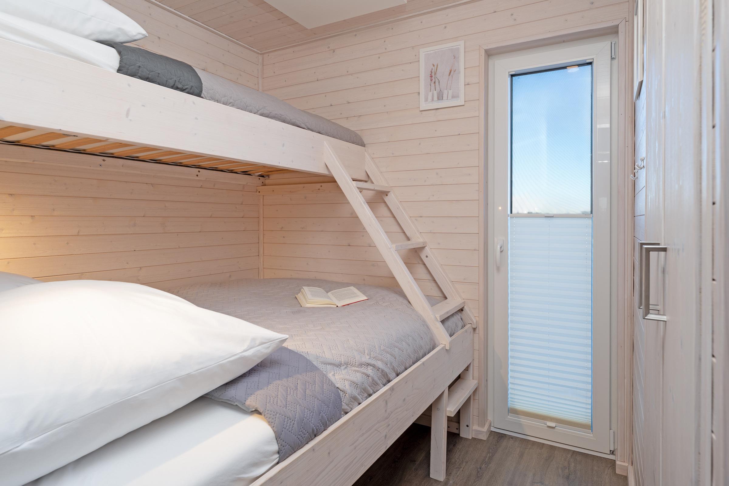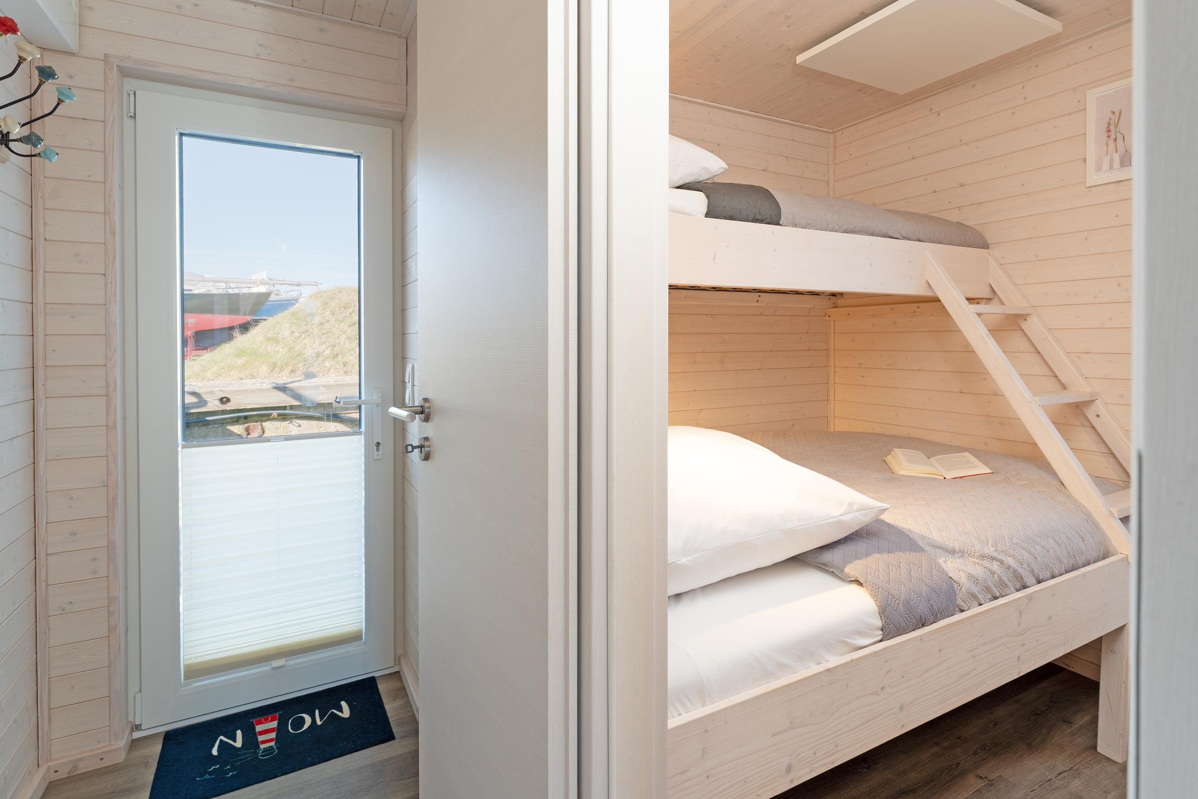 Schlafzimmer 2: 1 Etagenbett (2x 80x200 cm unten und 80x200cm oben), Kleiderschrank, Verdunkelung: Plissee, kein Platz für ein Babybett vorhanden