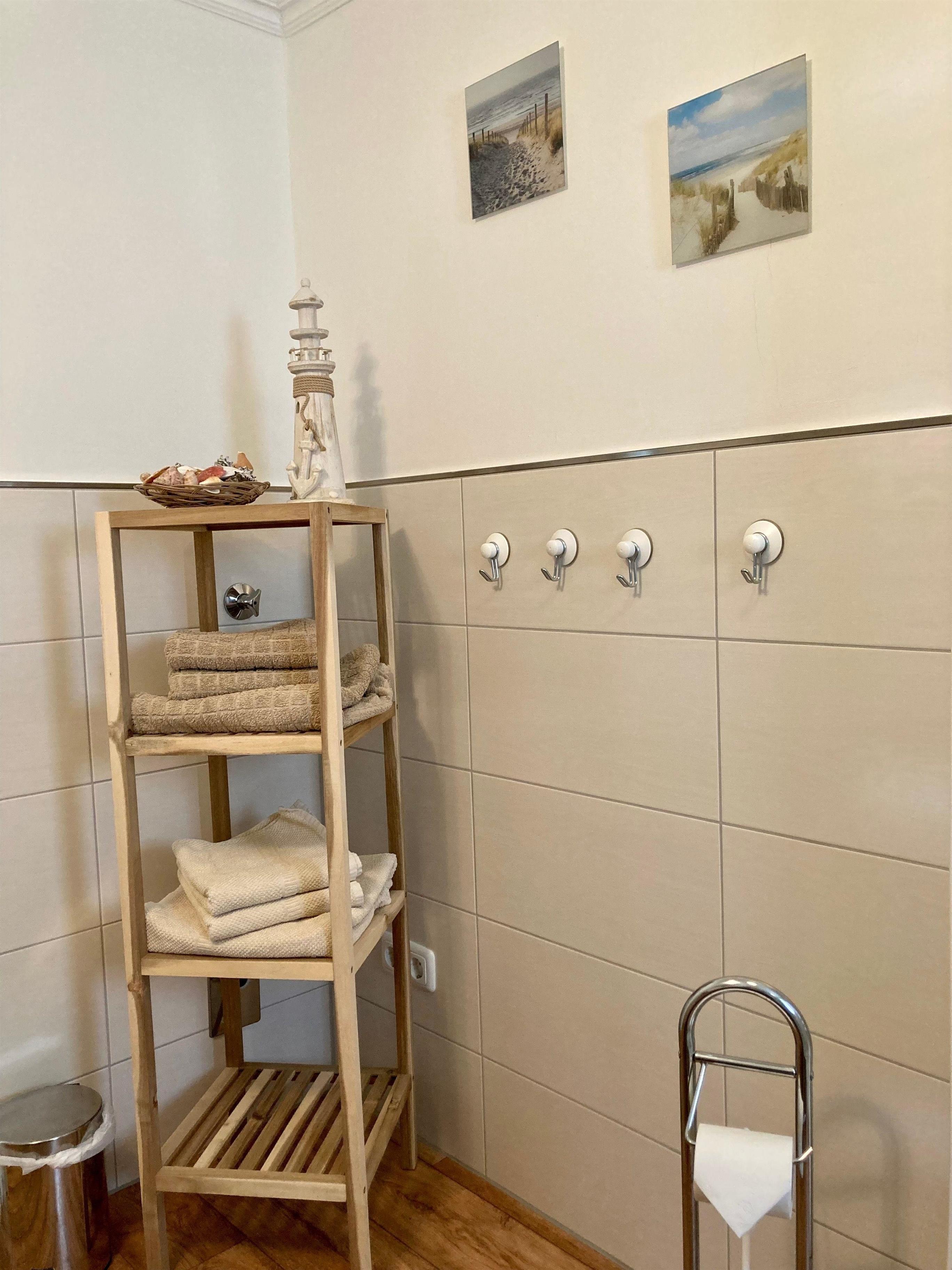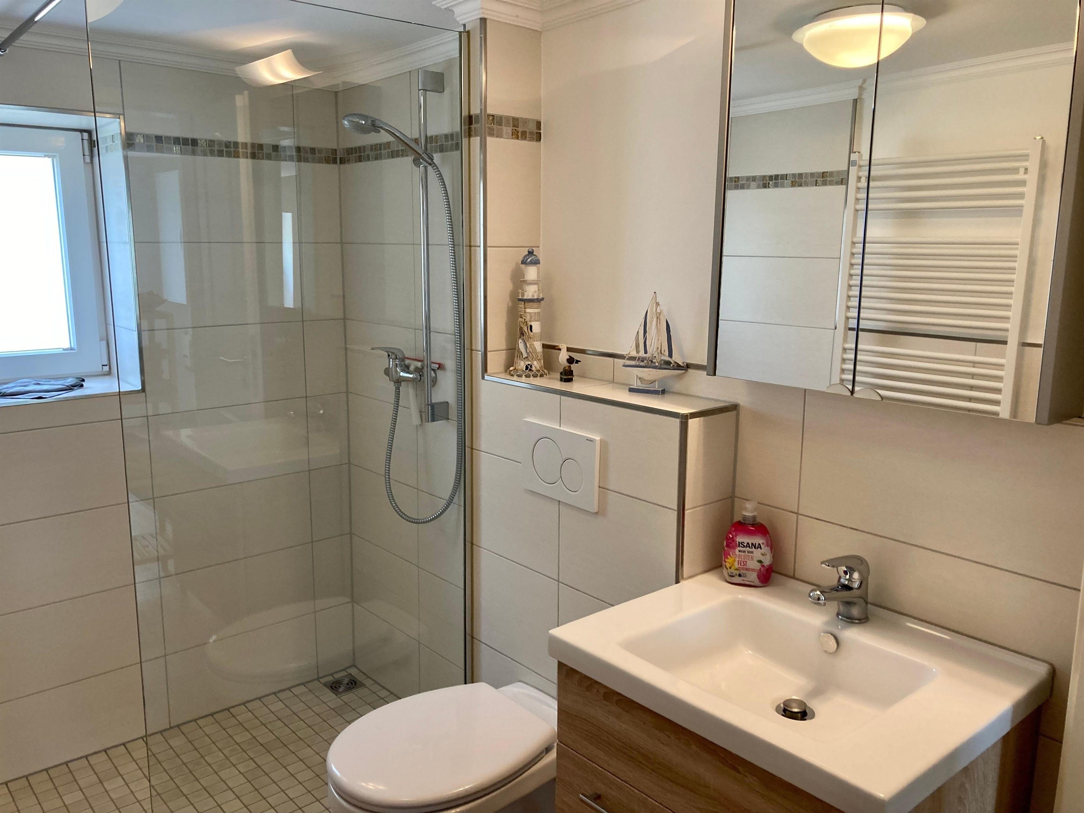 Ein Hochstuhl ist vorhanden. Ein Tageslichtbad mit großzügiger moderne bodengleiche Dusche;