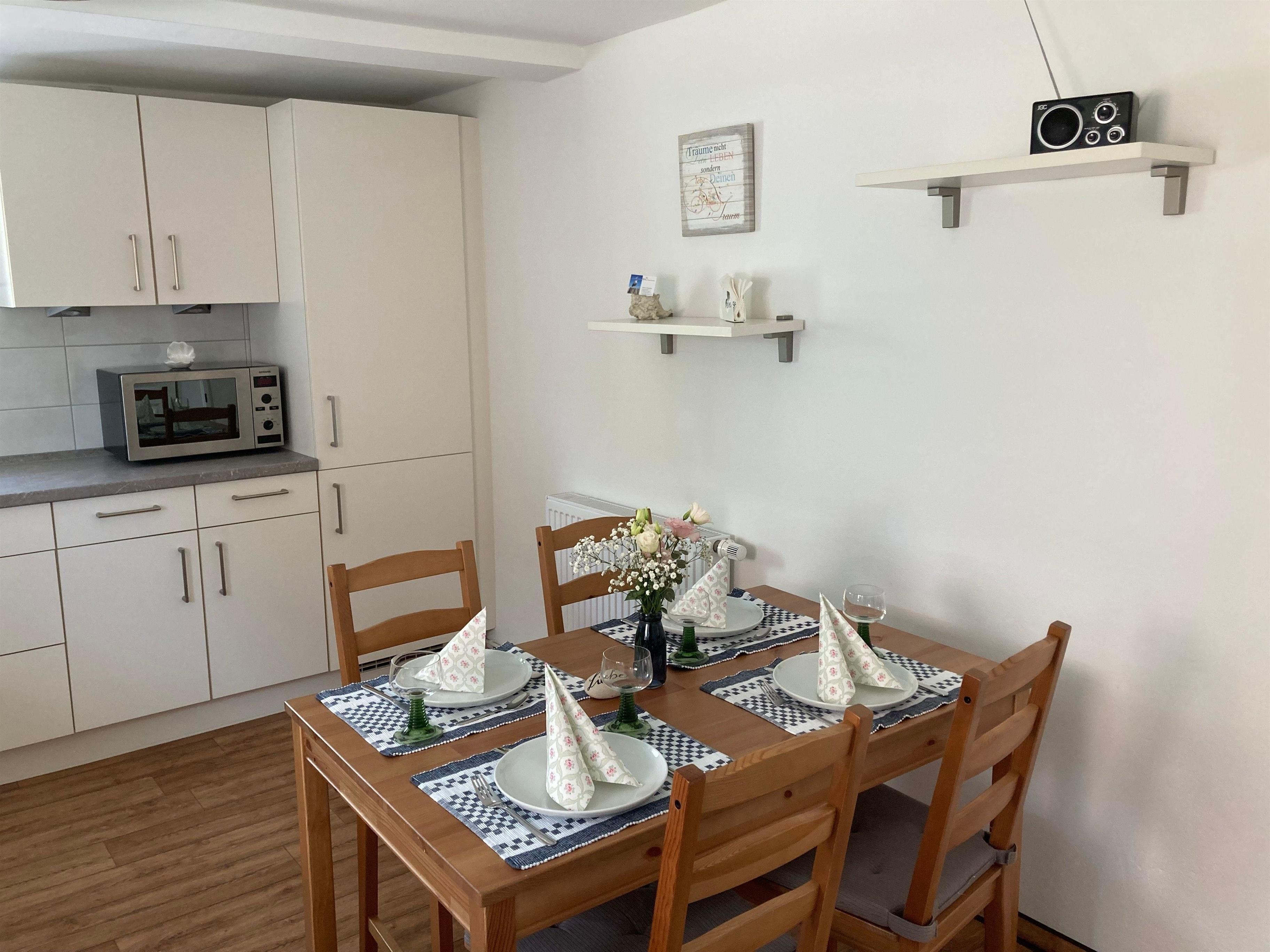 Im Sommer steht eine Sitzecke mit Tisch und Stühlen zur Verfügung.