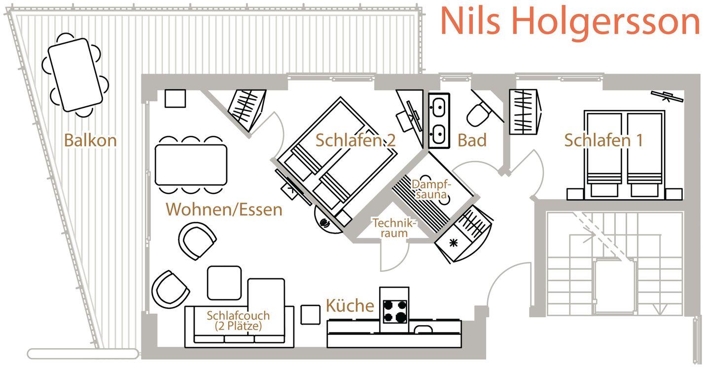 Die Ferienwohnung „Nils Holgersson“ auf dem Priwall in Travemünde bietet auf 67 m² Platz für bis zu sechs Gäste und eignet sich ideal für Familien. Sie verfügt über zwei Schlafzimmer, eine moderne offene Küche, ein gemütliches Wohnzimmer mit Ethanol-Kamin und einen überdachten Balkon. Der feine Sandstrand ist nur 250 Meter entfernt, diverse Einkaufsmöglichkeiten und Restaurants befinden sich in fußläufiger Nähe.