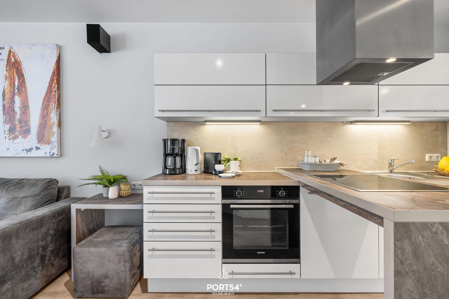 Die offene Küche ist komplett ausgestattet: Ceranherd, Backofen, Mikrowelle, Geschirrspüler, Kühlschrank mit Gefrierfach, Nespresso-Maschine, Kaffeemaschine, Wasserkocher, Toaster sowie sämtliches Koch- und Essgeschirr – perfekt für Snacks oder umfangreiche Mahlzeiten.