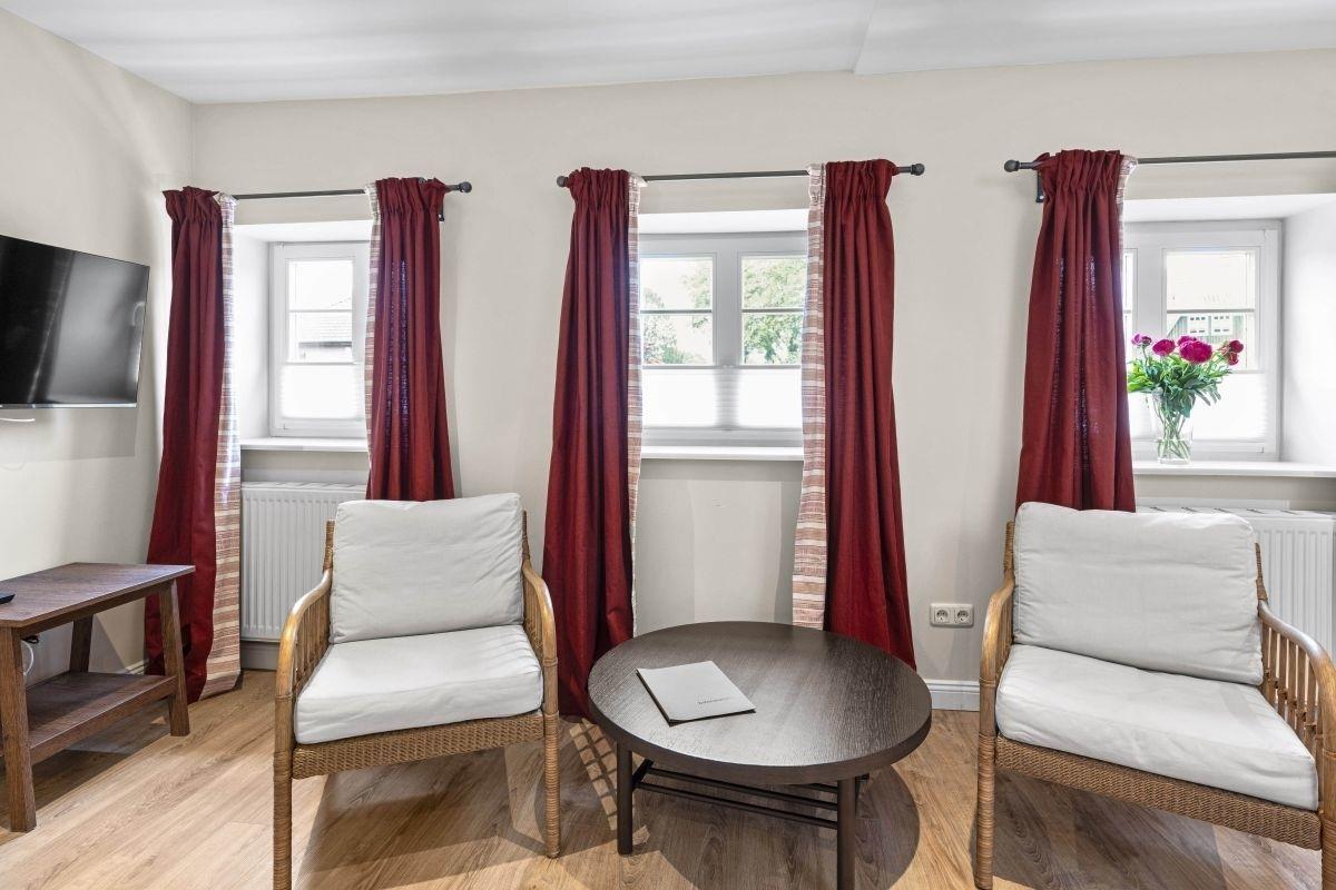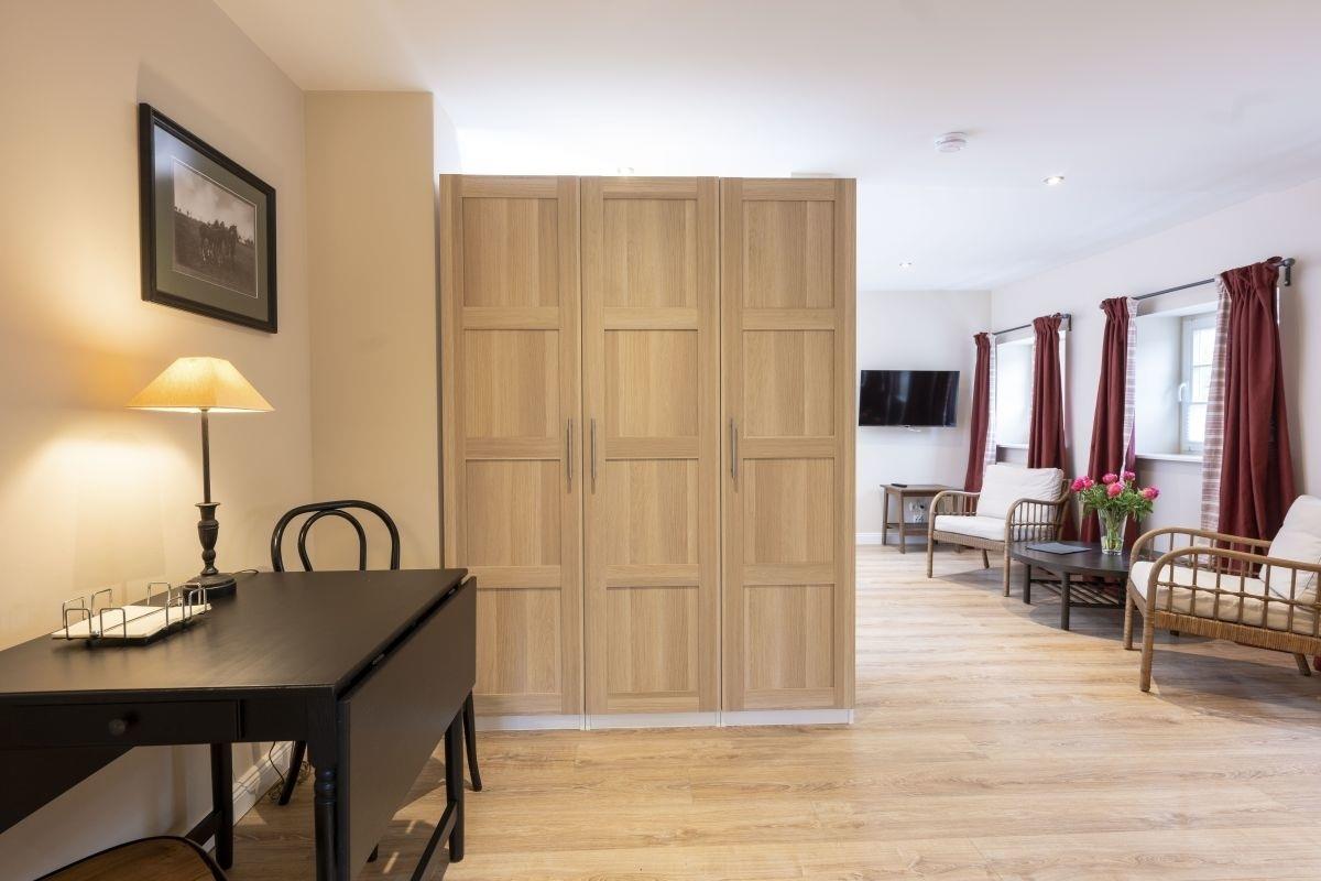 Die Ferienappartements 15a und 15b sind gemütlich eingerichtet und verfügen jeweils über ein Wohn-/Schlafzimmer und eine Einbauküche mit Essbereich. Im Wohn-/Schlafzimmer befindet sich ein großer Schrank und ein Flachbild-TV.