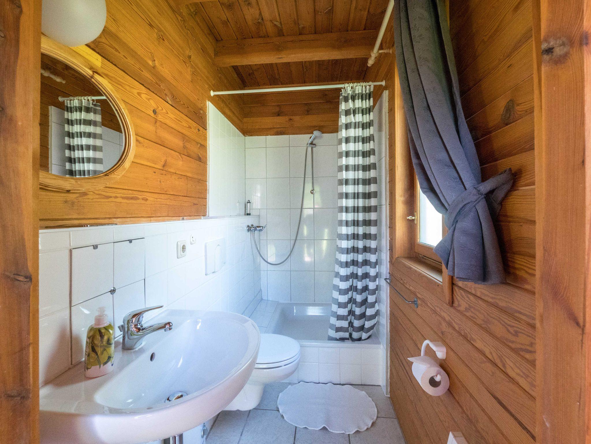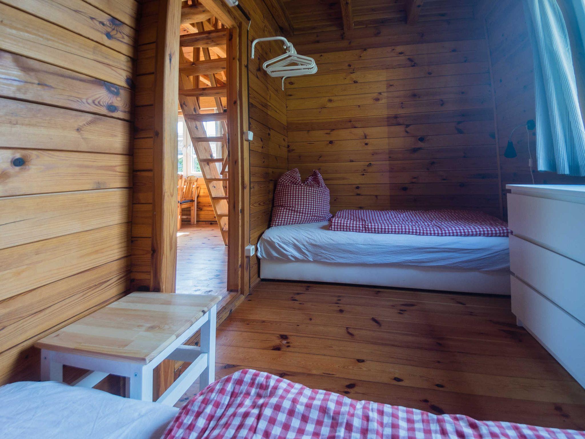 Es gibt ein Doppelbett in der offenen Schlafgalarie im oberen Bereich und ein kleines Schlafzimmer mit zwei Einzelbetten. Der obere Bereich ist über eine Raumspartreppe zu erreichen. Der Wohnraum im Erdgeschoss ist mit Nachtspeicherheizung, Couch, TV, WLAN und einem Esstisch mit 4 Stühlen ausgestattet.