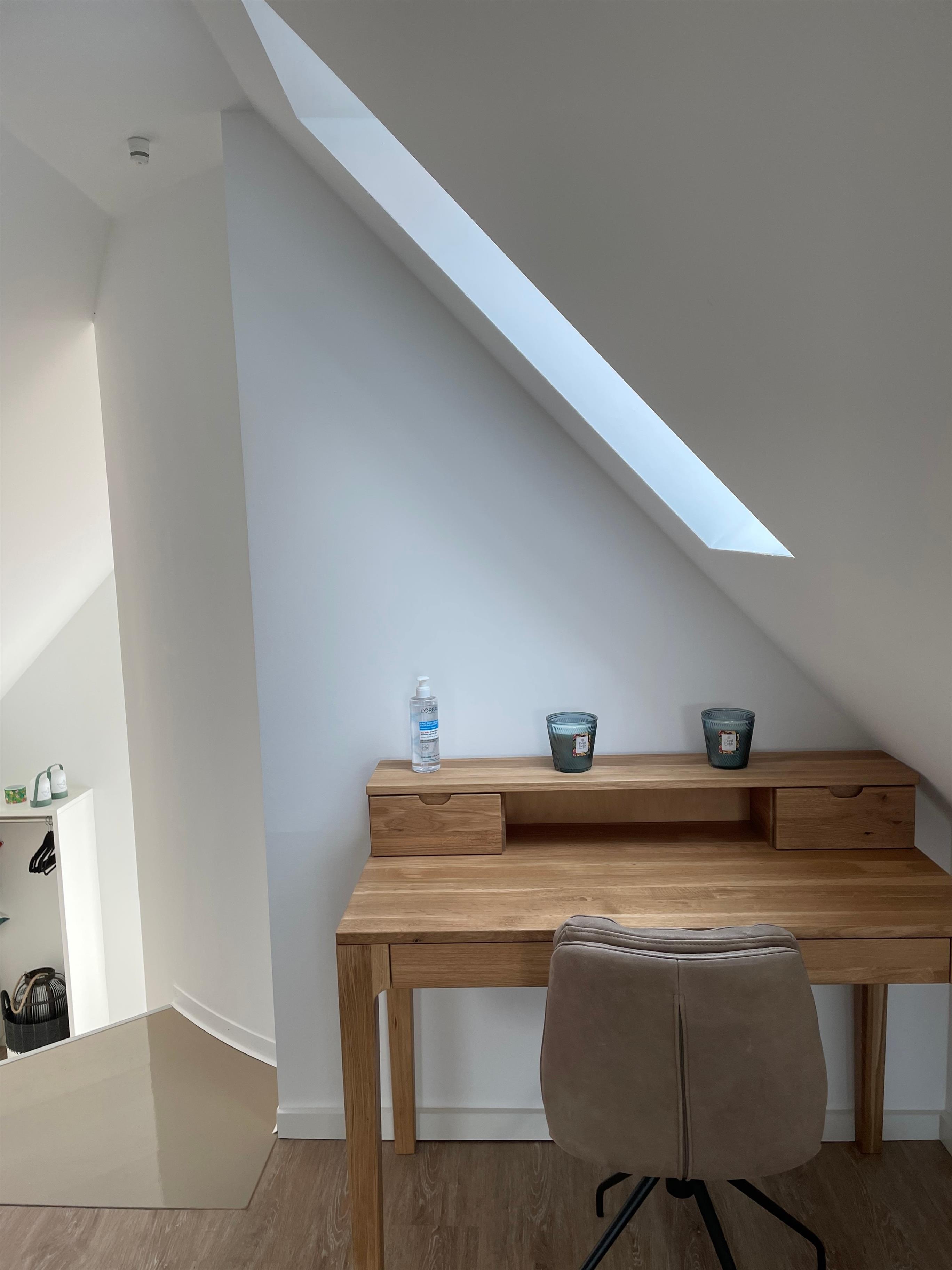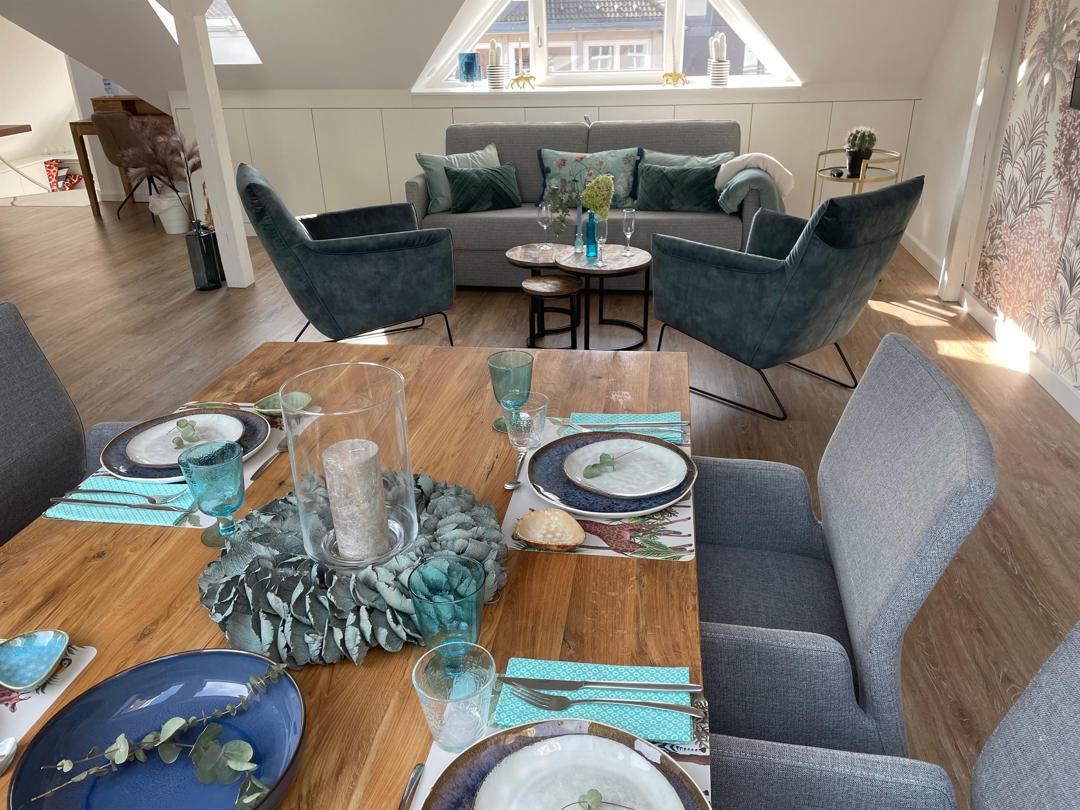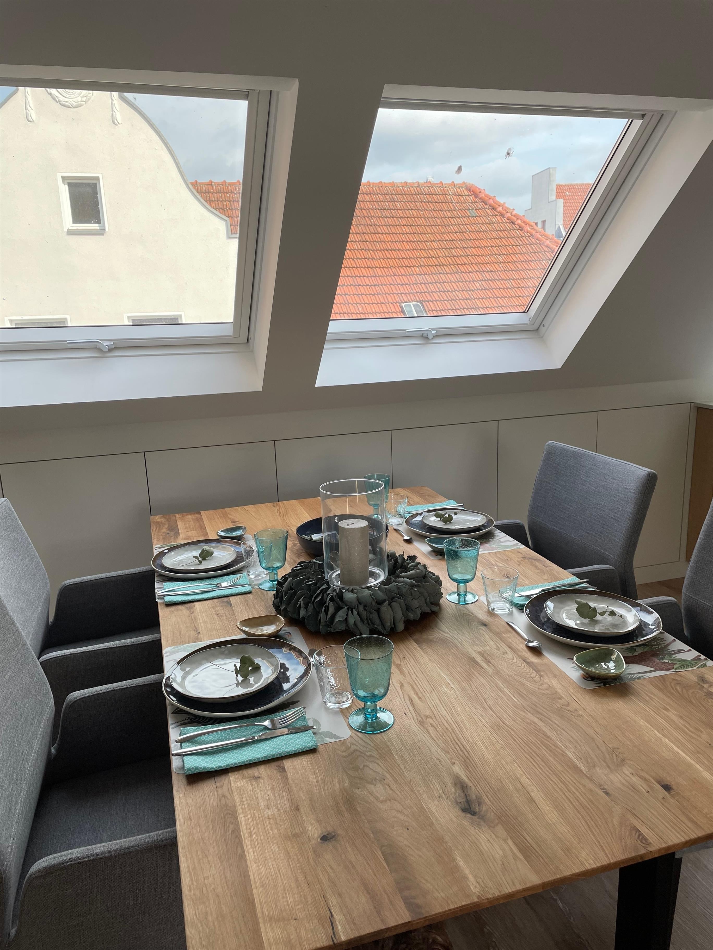 Die Dachwohnung wurde 2021 vollständig neu renoviert und möbliert. Es handelt sich um eine Loft Wohnung mitten im Herzen von Lüdinghausen, direkt am Kirchplatz gelegen. Der Wohnbereich ist offen mit voll ausgestatteter Küche, Essbereich und Wohnzimmer mit Flachbildfernseher (Smart TV). Das Doppelbett befindet sich auf einer Empore die über eine Raumspartreppe zu Erreichen ist. Die Benutzung der Treppe ist auf eigene Gefahr und empfiehlt sich nicht für kleine Kinder und Menschen die eingeschränkt mobil sind. Alternativ dient ein Sofa im Wohnzimmerbereich als Schlafmöglichkeit für zwei Personen. Ein Hund kann optional gegen eine einmalige Gebühr von 25 € hinzu gebucht werden.
