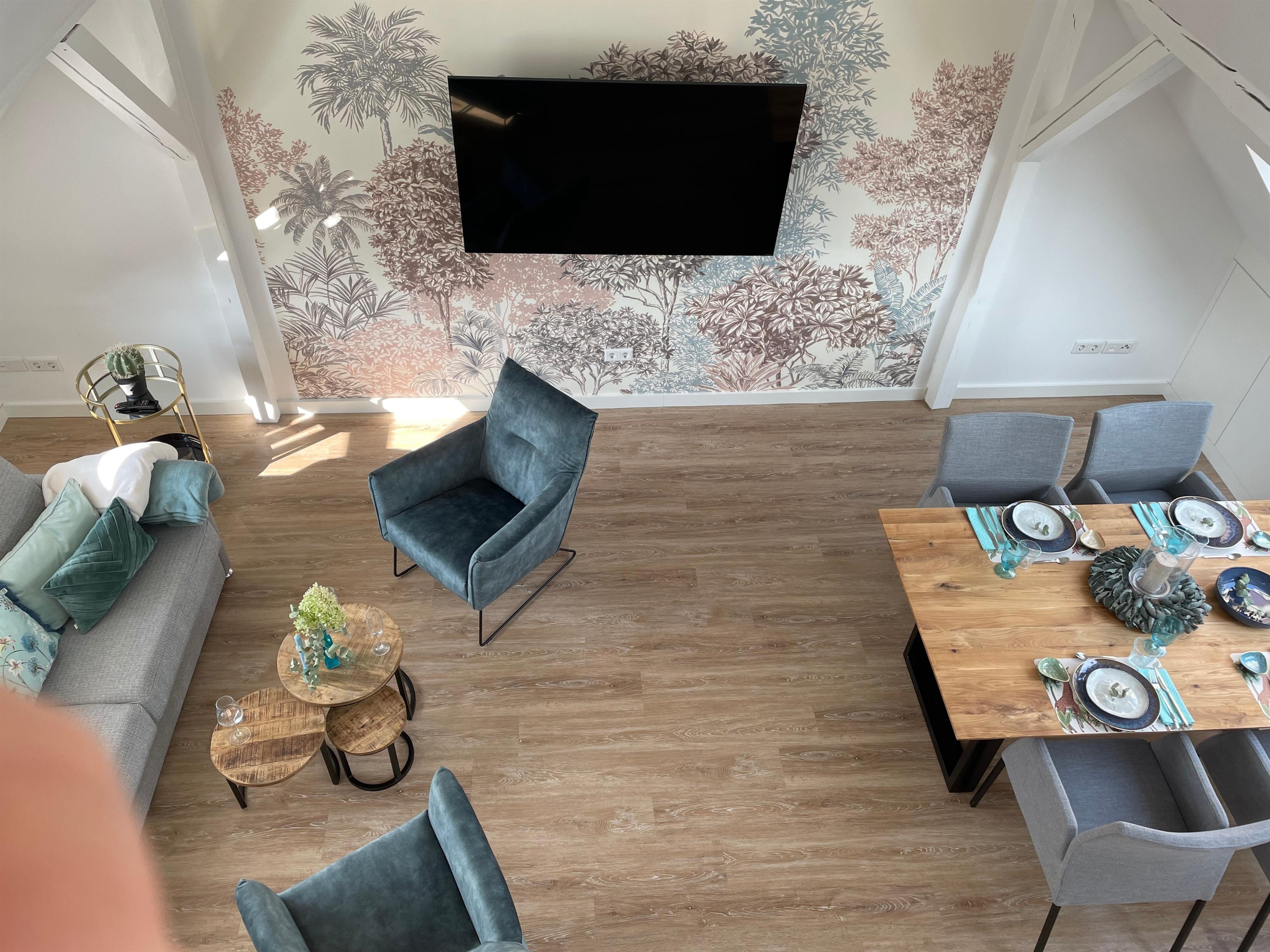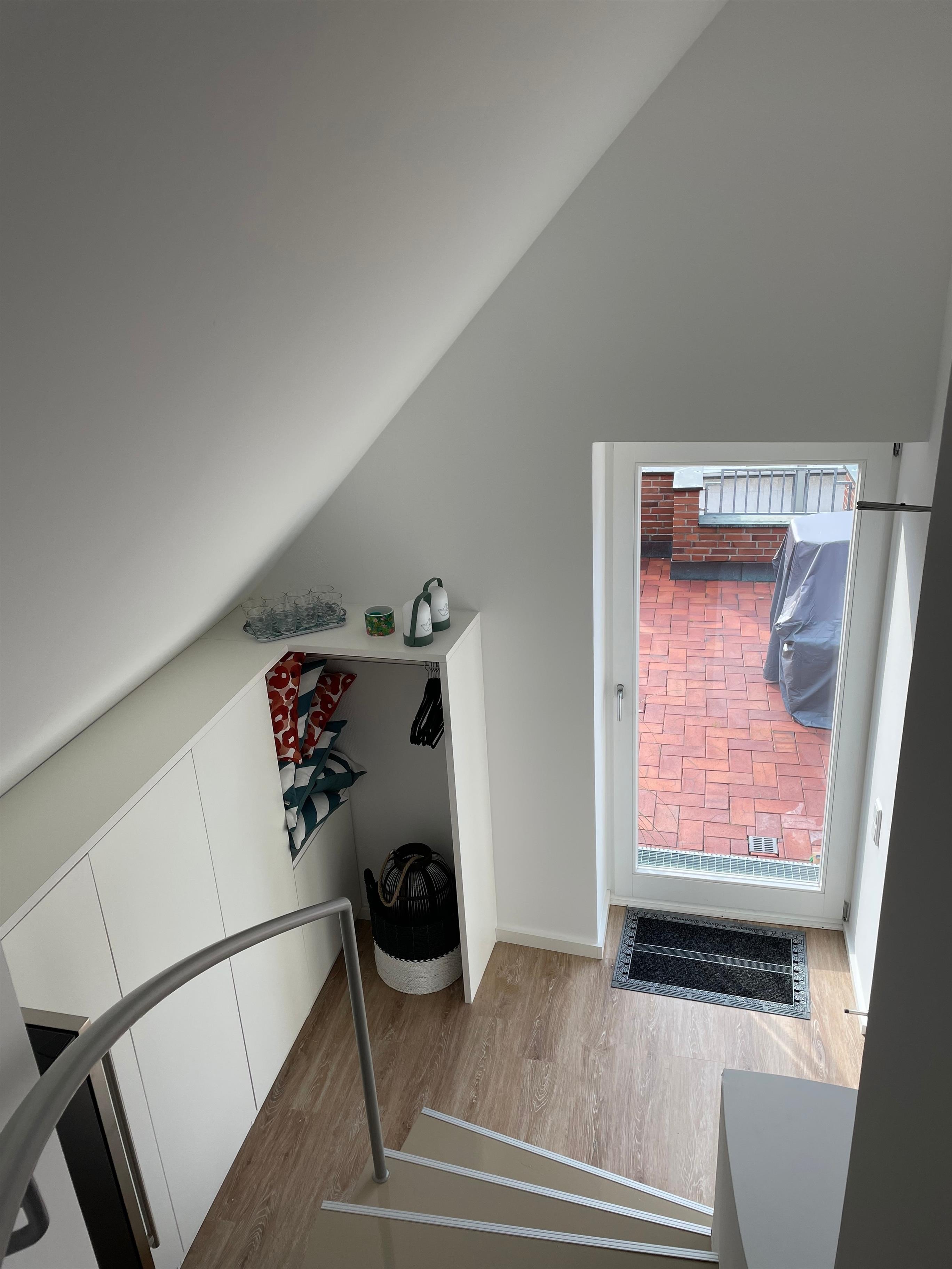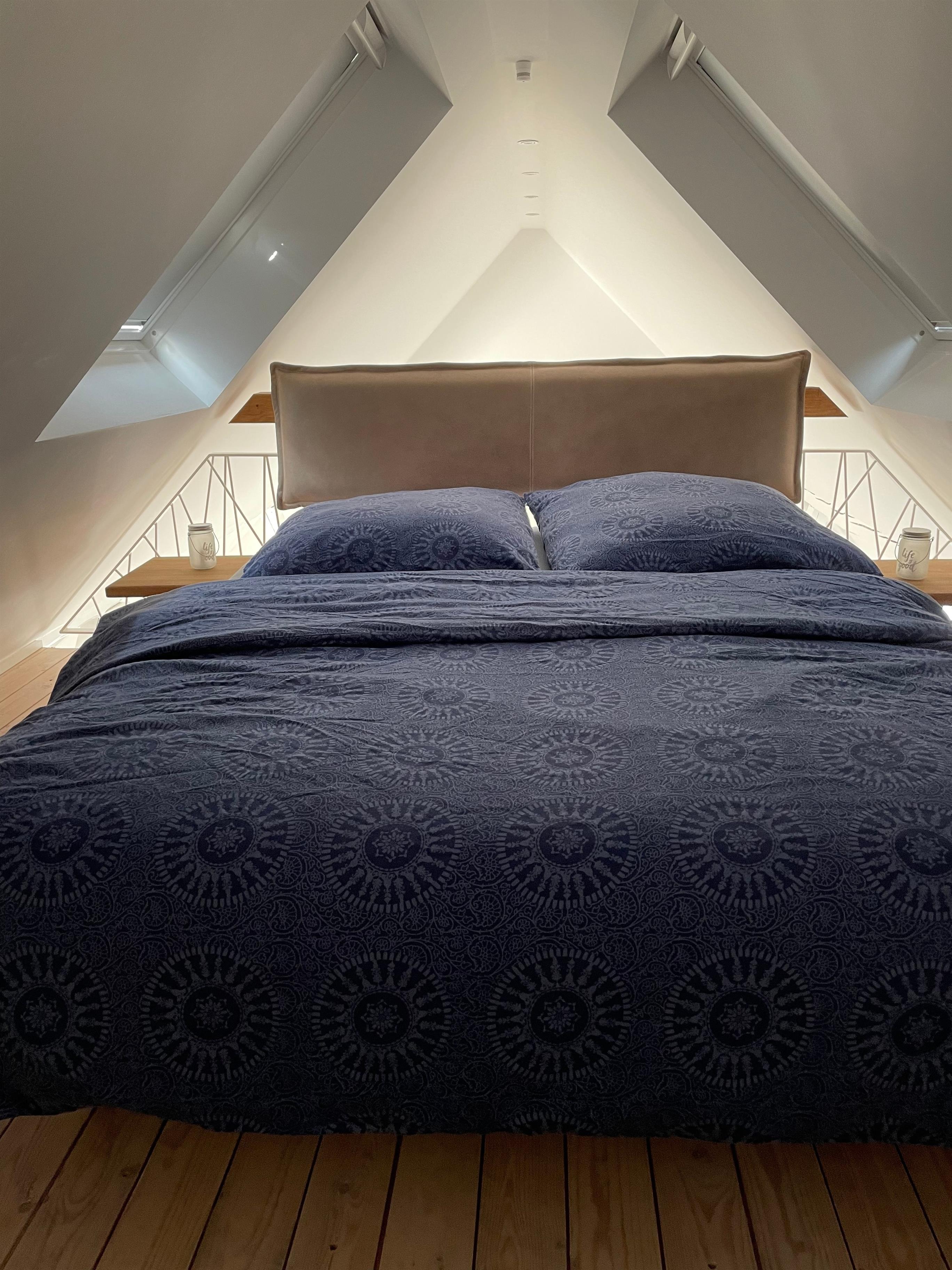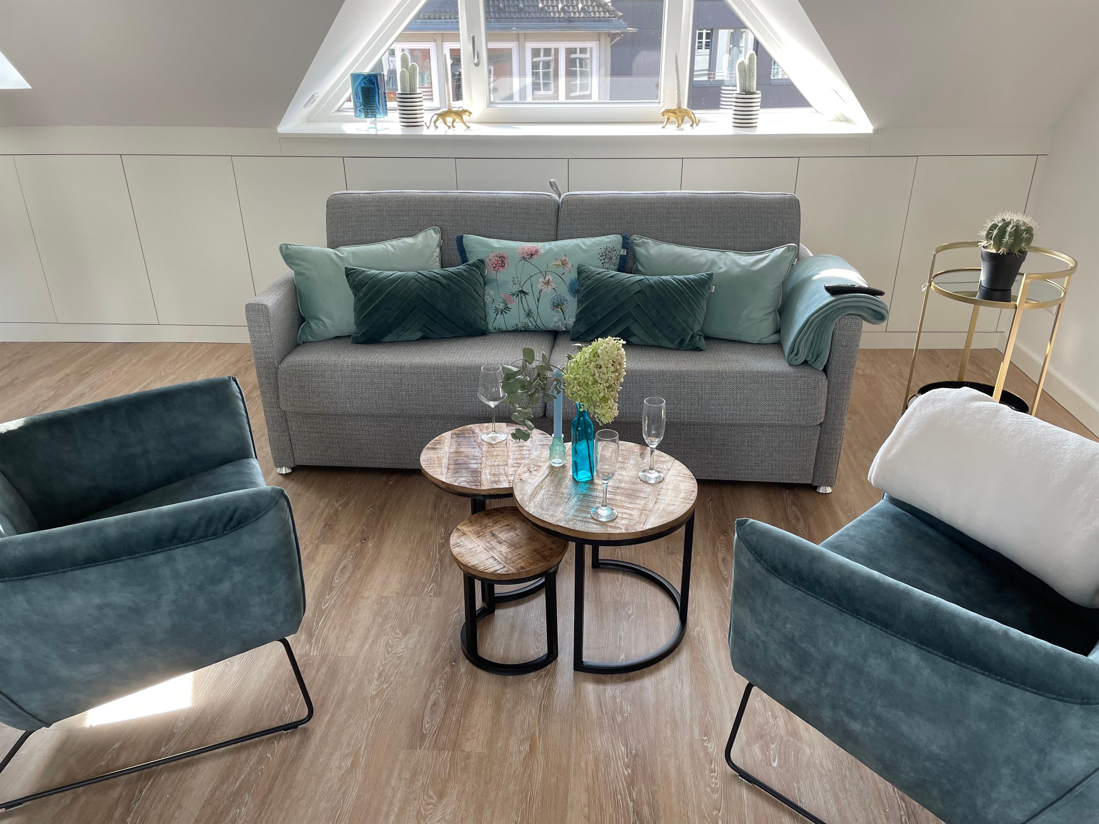 Die Dachwohnung wurde 2021 vollständig neu renoviert und möbliert. Es handelt sich um eine Loft Wohnung mitten im Herzen von Lüdinghausen, direkt am Kirchplatz gelegen. Der Wohnbereich ist offen mit voll ausgestatteter Küche, Essbereich und Wohnzimmer mit Flachbildfernseher (Smart TV). Das Doppelbett befindet sich auf einer Empore die über eine Raumspartreppe zu Erreichen ist. Die Benutzung der Treppe ist auf eigene Gefahr und empfiehlt sich nicht für kleine Kinder und Menschen die eingeschränkt mobil sind. Alternativ dient ein Sofa im Wohnzimmerbereich als Schlafmöglichkeit für zwei Personen. Ein Hund kann optional gegen eine einmalige Gebühr von 25 € hinzu gebucht werden.