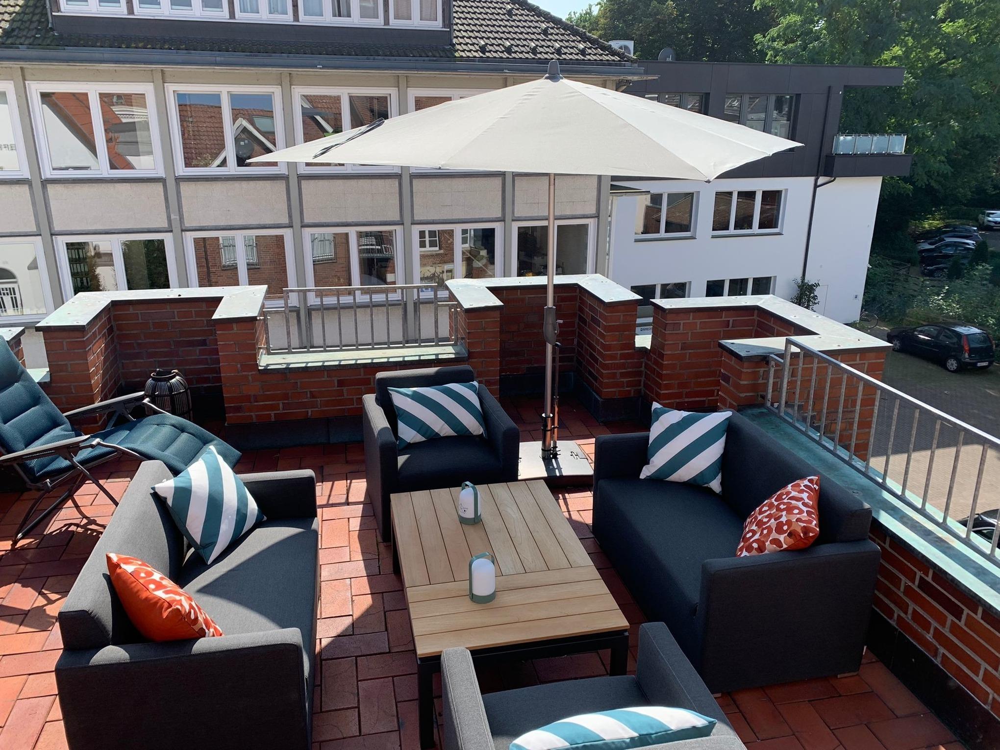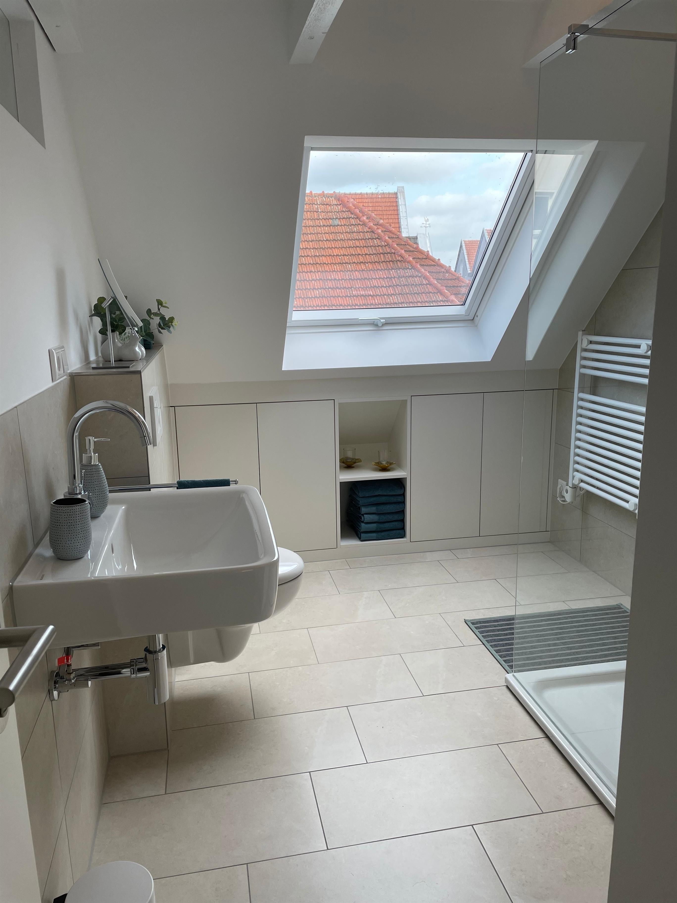 Das Badezimmer verfügt über eine bodengleiche Dusche. Eine großzügig Dachterasse mit Loungegarnitur und zwei bequemen Liegestühlen laden zum relaxen ein.