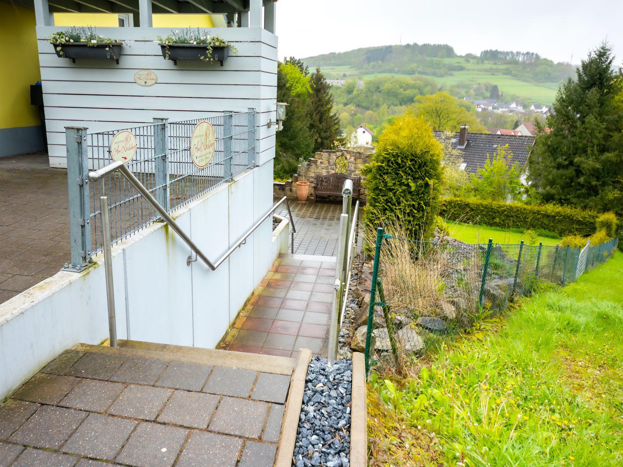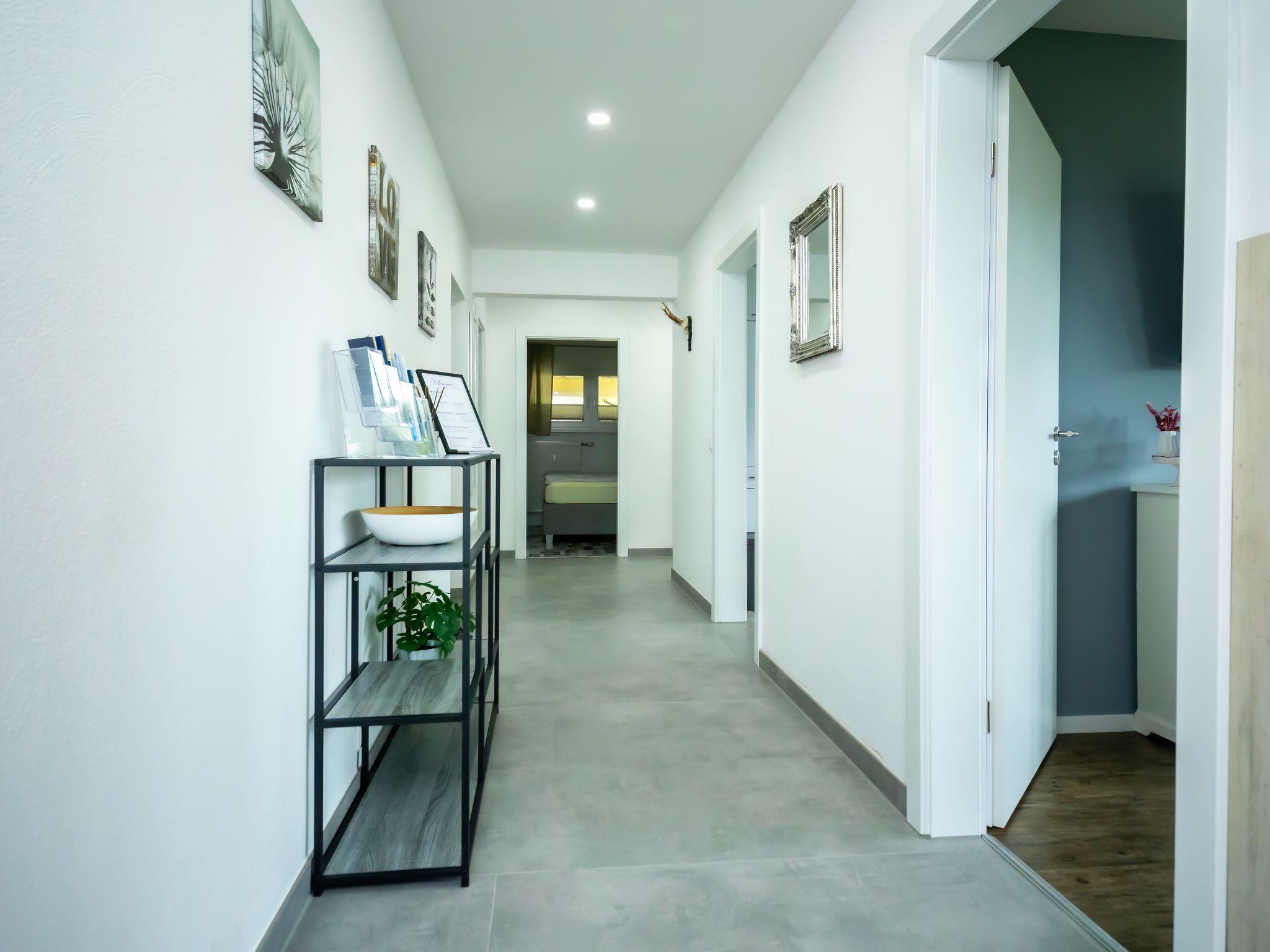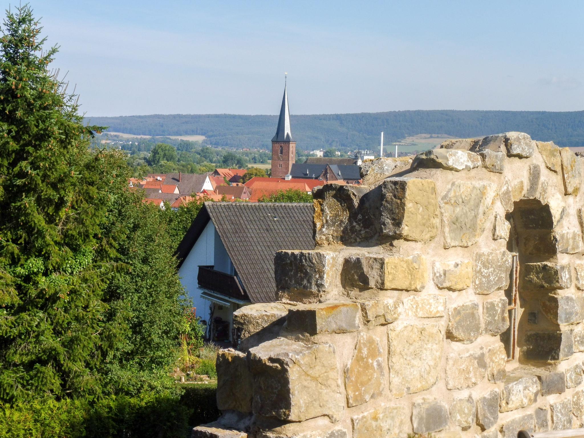 Modern 3-family house semi-detached, surrounded by trees and meadows. Above Lügde (Altstadt), on the outskirts, 800 m from the centre, in a quiet position on a slope, 100 m from the edge of the forest, 8 km from the lake, 1 km from the river, in a cul-de-sac. Stepped path (18 steps) to the house. Parking on the premises. Shop 1 km, grocery 1 km, supermarket 1 km, restaurant 800 m, bakery 1 km, café 800 m, bus stop 300 m, railway station "Lügde" 300 m, outdoor swimming pool 3 km, indoor swimming pool 5 km, thermal baths 5 km, lake Schiedersee 8 km. Golf course (18 hole) 1.5 km, walking paths from the house 200 m. Nearby attractions: Stadtmauer, Wehrtürme, Altstadt Lügde, Schloss Hämelschenburg 12 km, Externsteine Bad Meinberg 30 km, Hermannsdenkmal 40 km. Please note: car recommended.