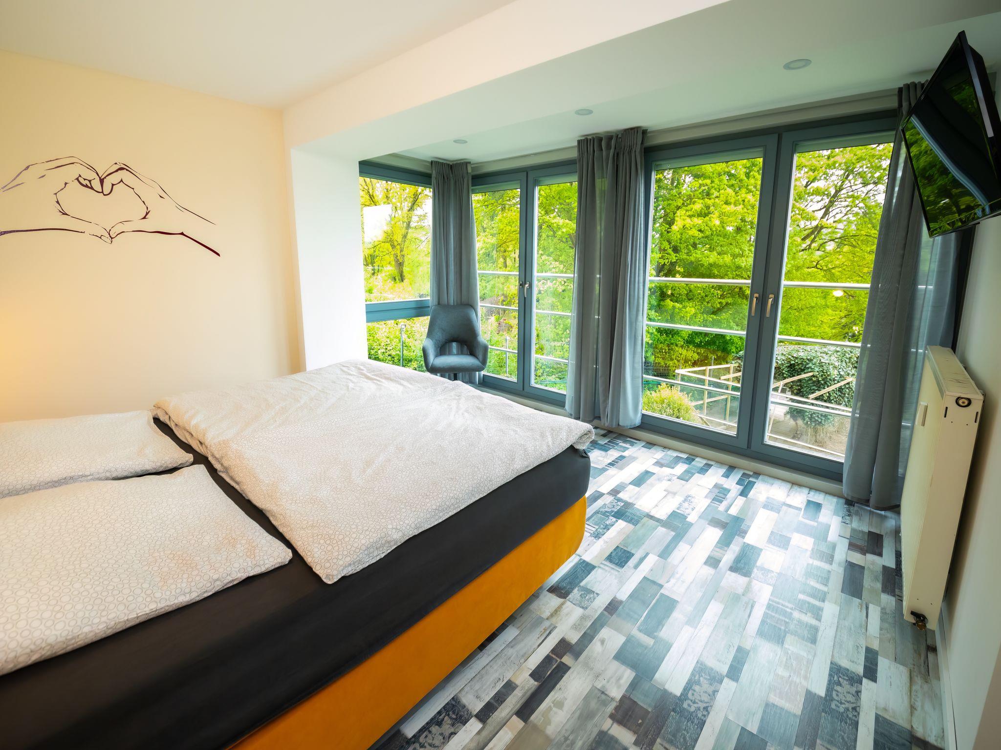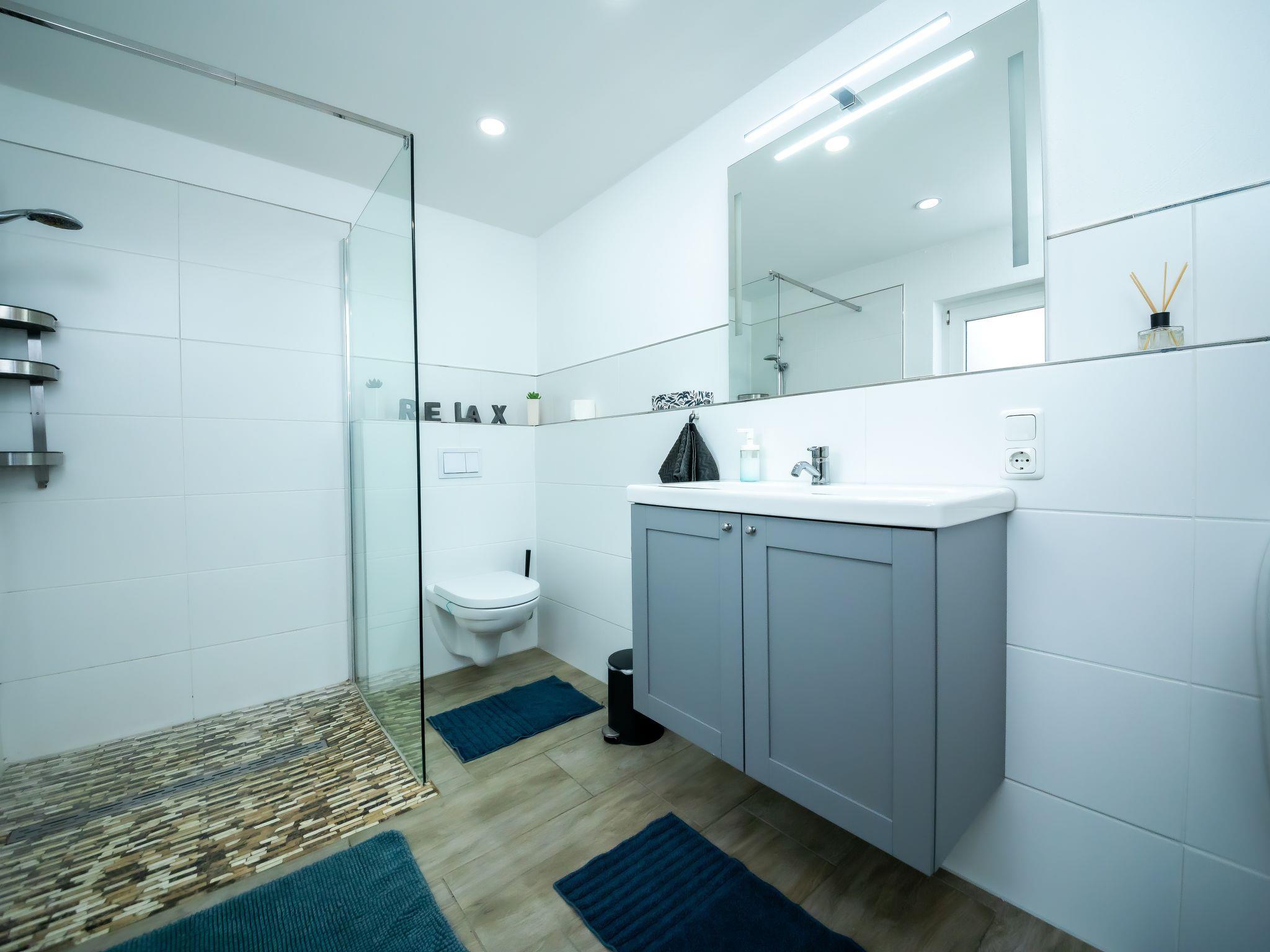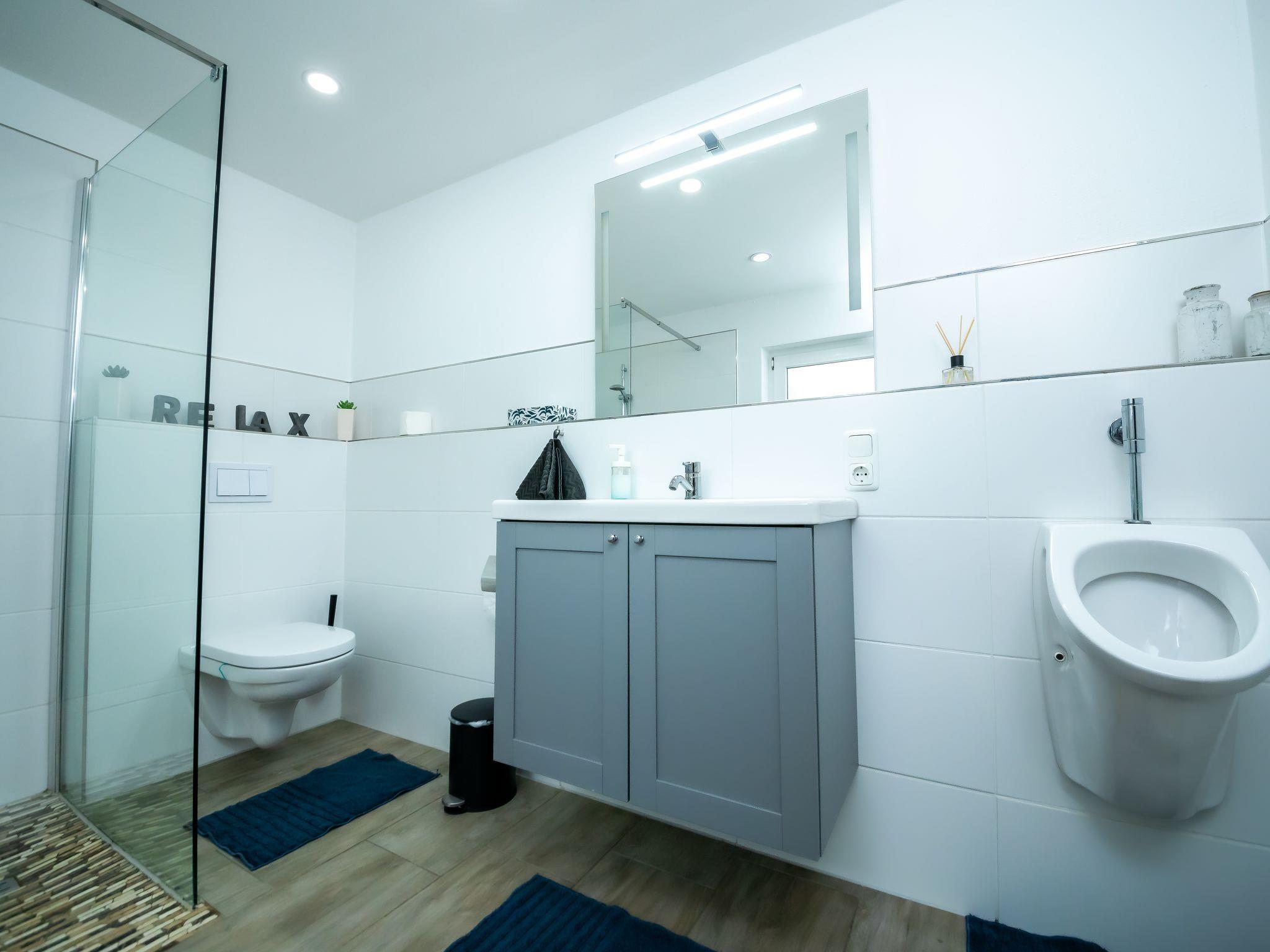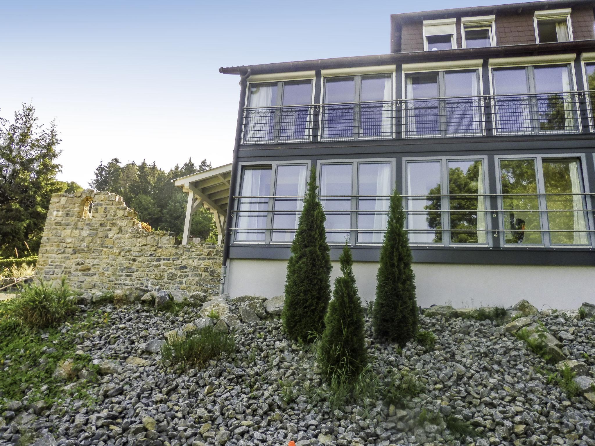 Modern 3-family house semi-detached, surrounded by trees and meadows. Above Lügde (Altstadt), on the outskirts, 800 m from the centre, in a quiet position on a slope, 100 m from the edge of the forest, 8 km from the lake, 1 km from the river, in a cul-de-sac. Stepped path (18 steps) to the house. Parking on the premises. Shop 1 km, grocery 1 km, supermarket 1 km, restaurant 800 m, bakery 1 km, café 800 m, bus stop 300 m, railway station "Lügde" 300 m, outdoor swimming pool 3 km, indoor swimming pool 5 km, thermal baths 5 km, lake Schiedersee 8 km. Golf course (18 hole) 1.5 km, walking paths from the house 200 m. Nearby attractions: Stadtmauer, Wehrtürme, Altstadt Lügde, Schloss Hämelschenburg 12 km, Externsteine Bad Meinberg 30 km, Hermannsdenkmal 40 km. Please note: car recommended.