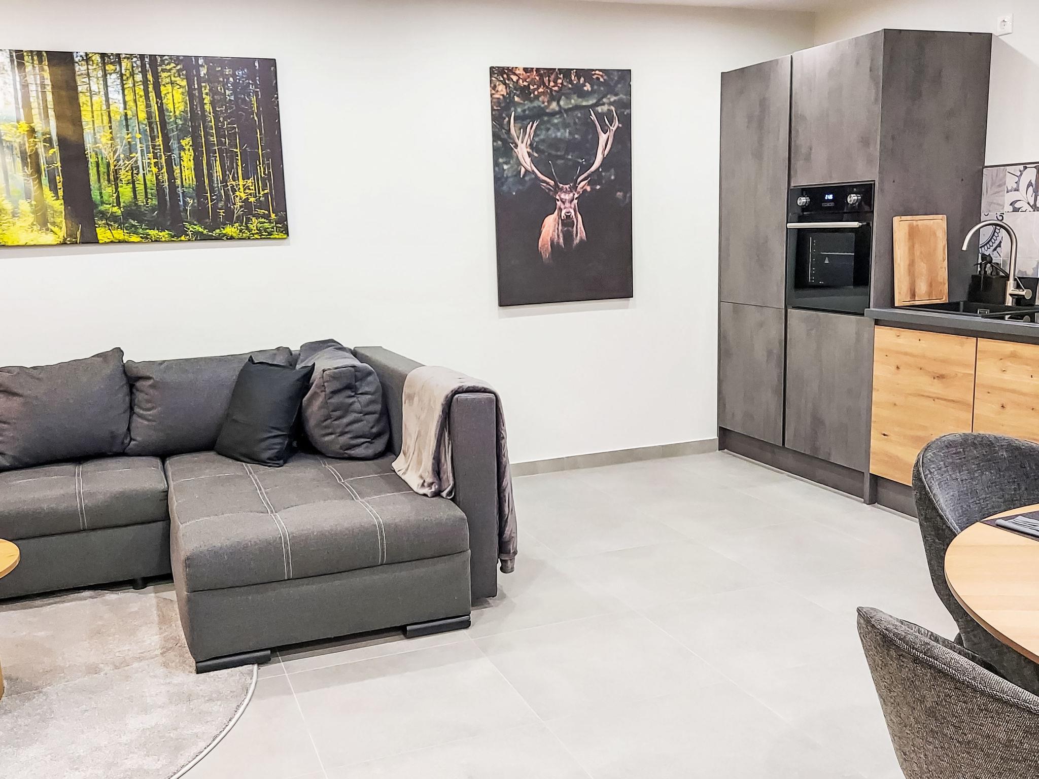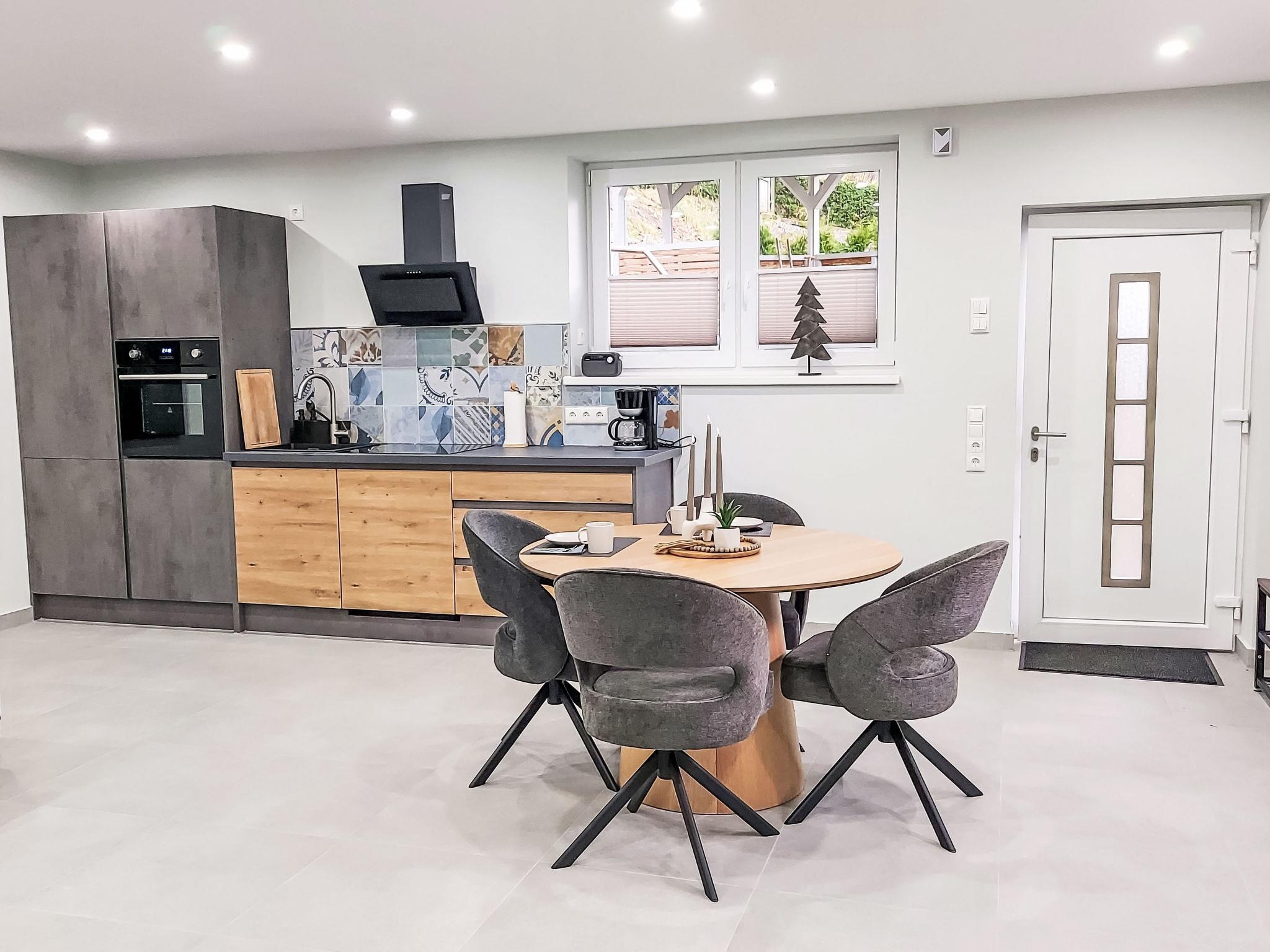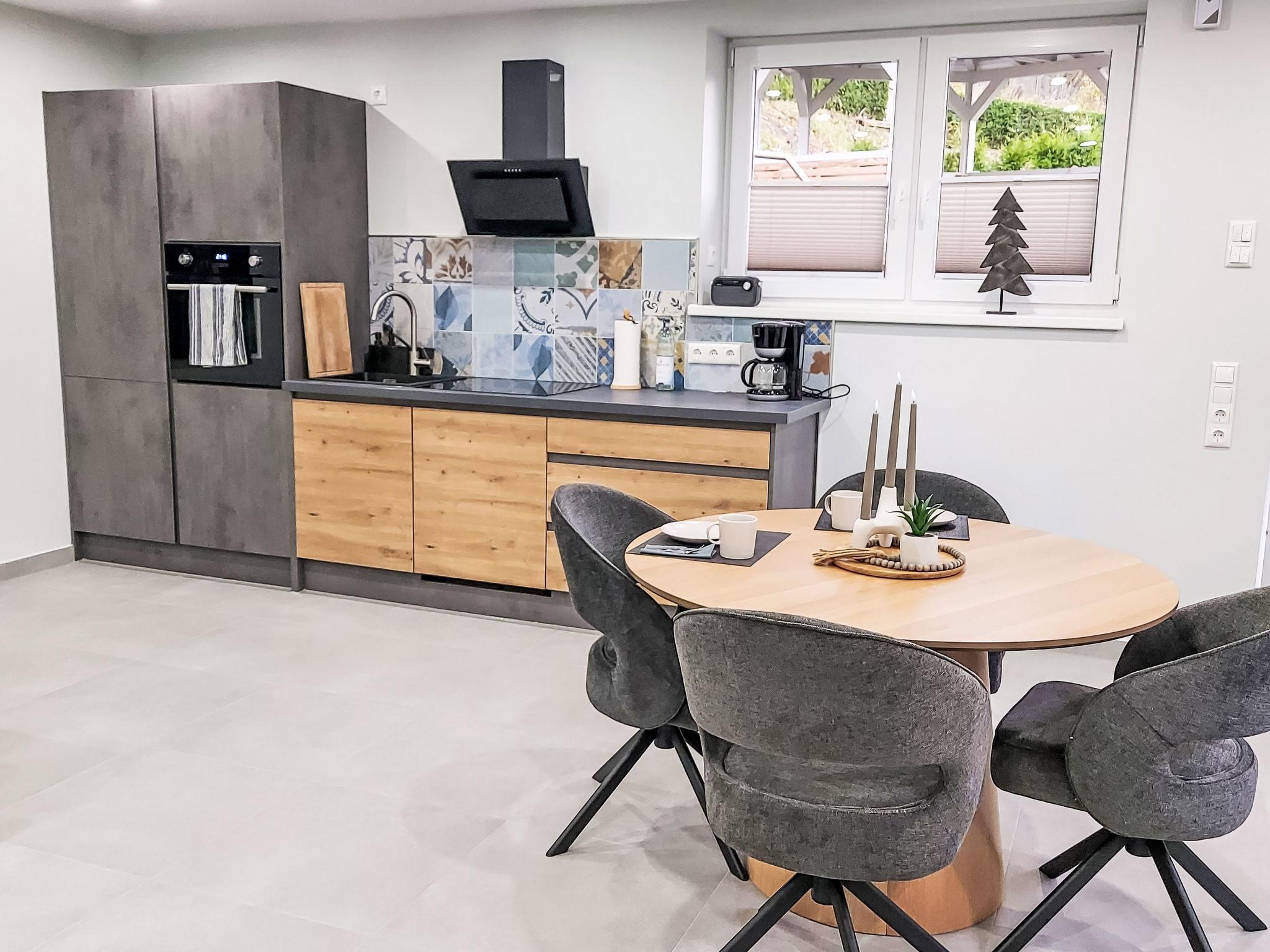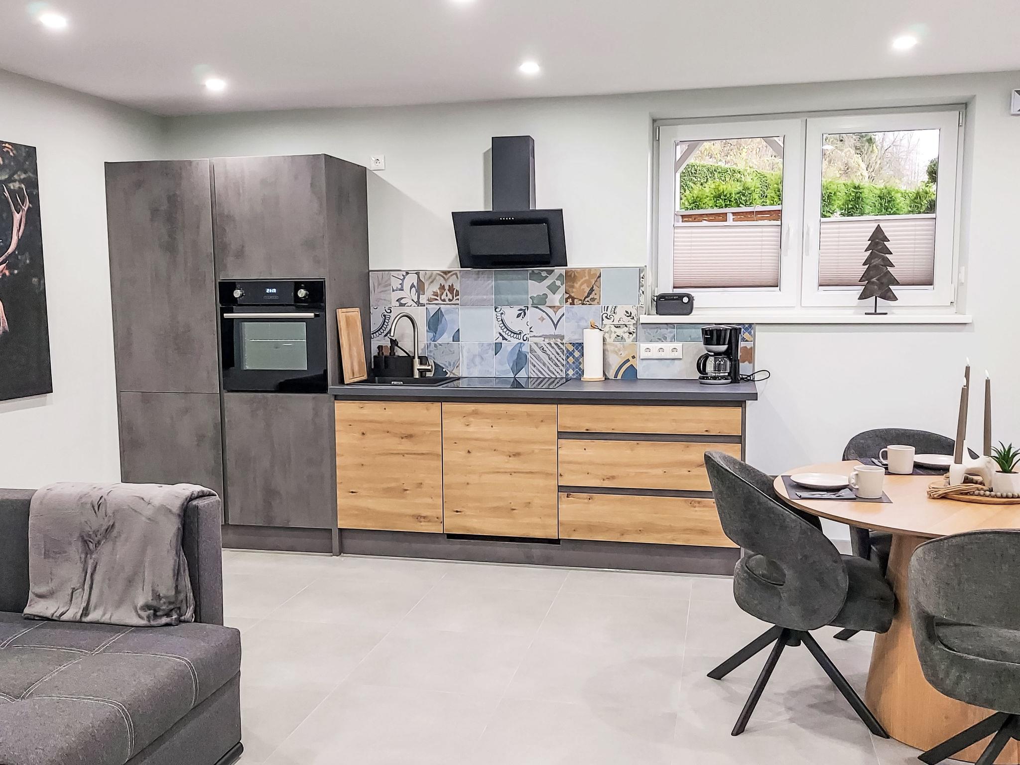"Am Waldrand", 2-room apartment 50 m2, lower ground floor. Fully renovated in 2024, modern and tasteful furnishings: living/dining room with dining table and cable TV (flat screen). Exit to the terrace. 1 room with 1 double bed (180 cm, length 200 cm), cable TV (flat screen). Open kitchen (oven, dishwasher, 4 ceramic glass hob hotplates, toaster, kettle, freezer, electric coffee machine). Shower/WC. Oil heating, underfloor heating. Terrace 20 m2. Terrace furniture, barbecue. Facilities: washing machine, dryer. Internet (WiFi, free). Please note: non-smokers only. Maximum 1 pet/ dog allowed. Private entrance, smoke alarm.