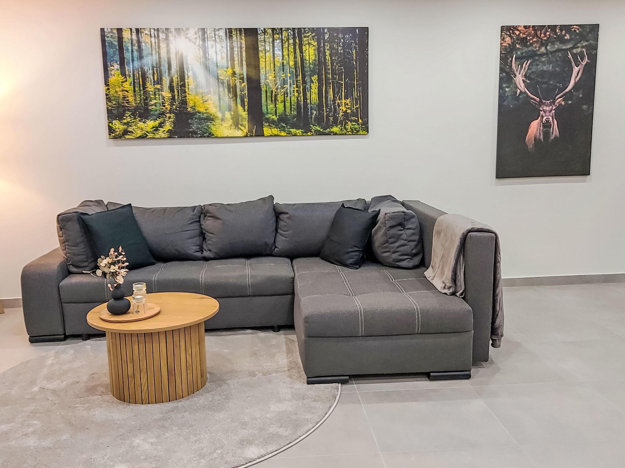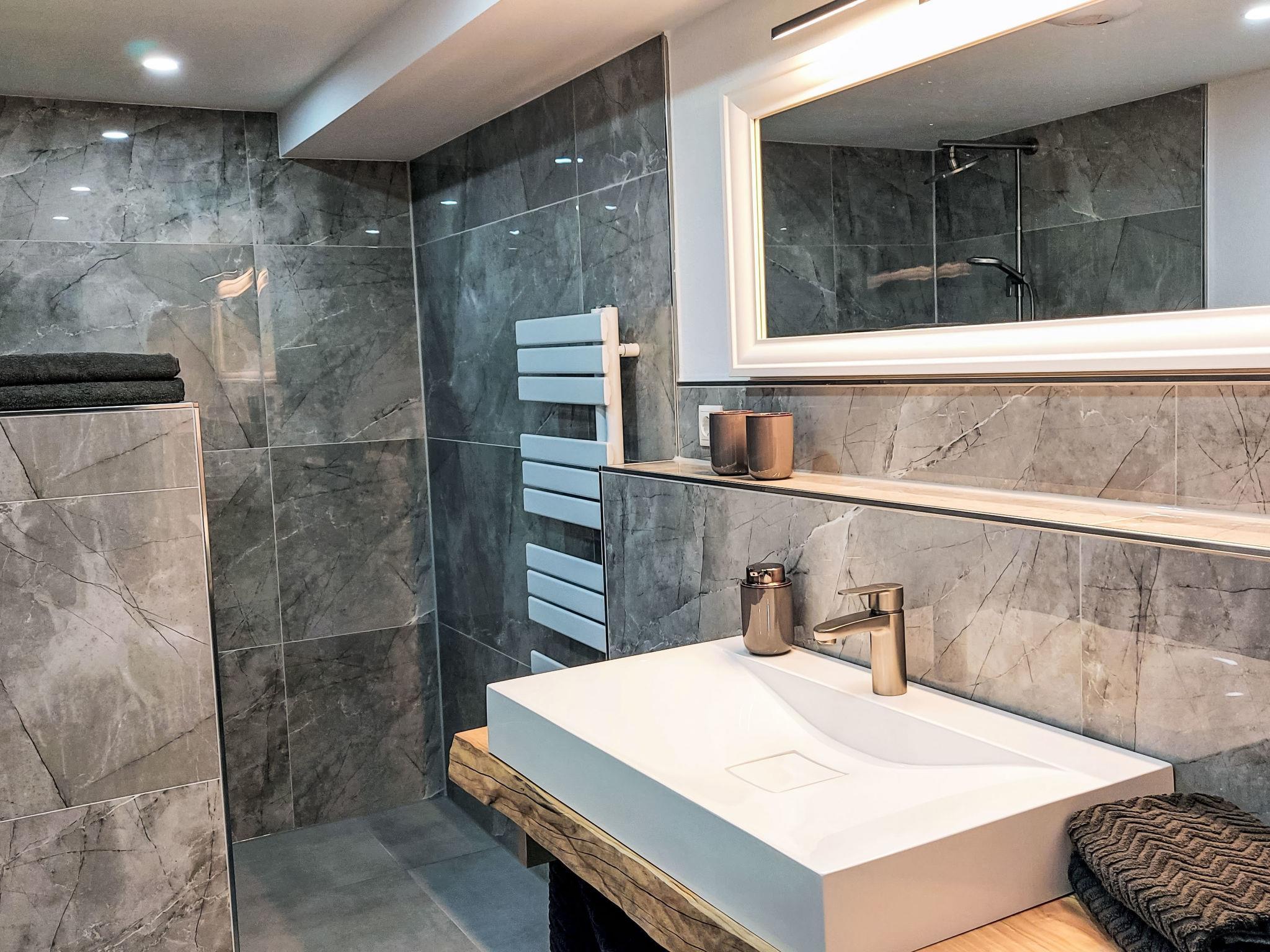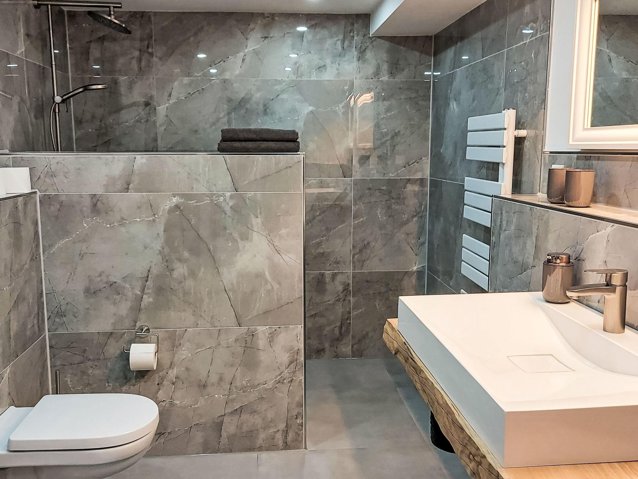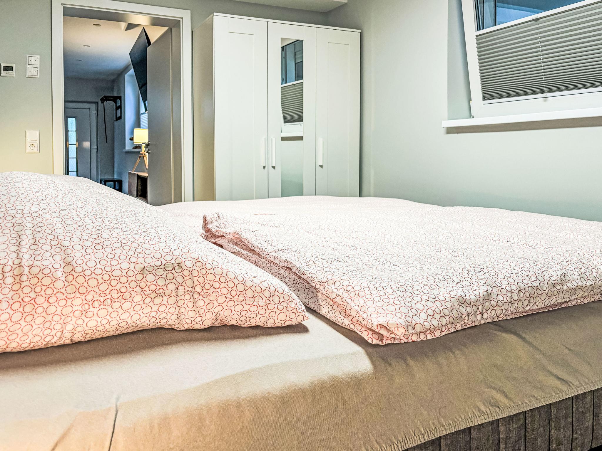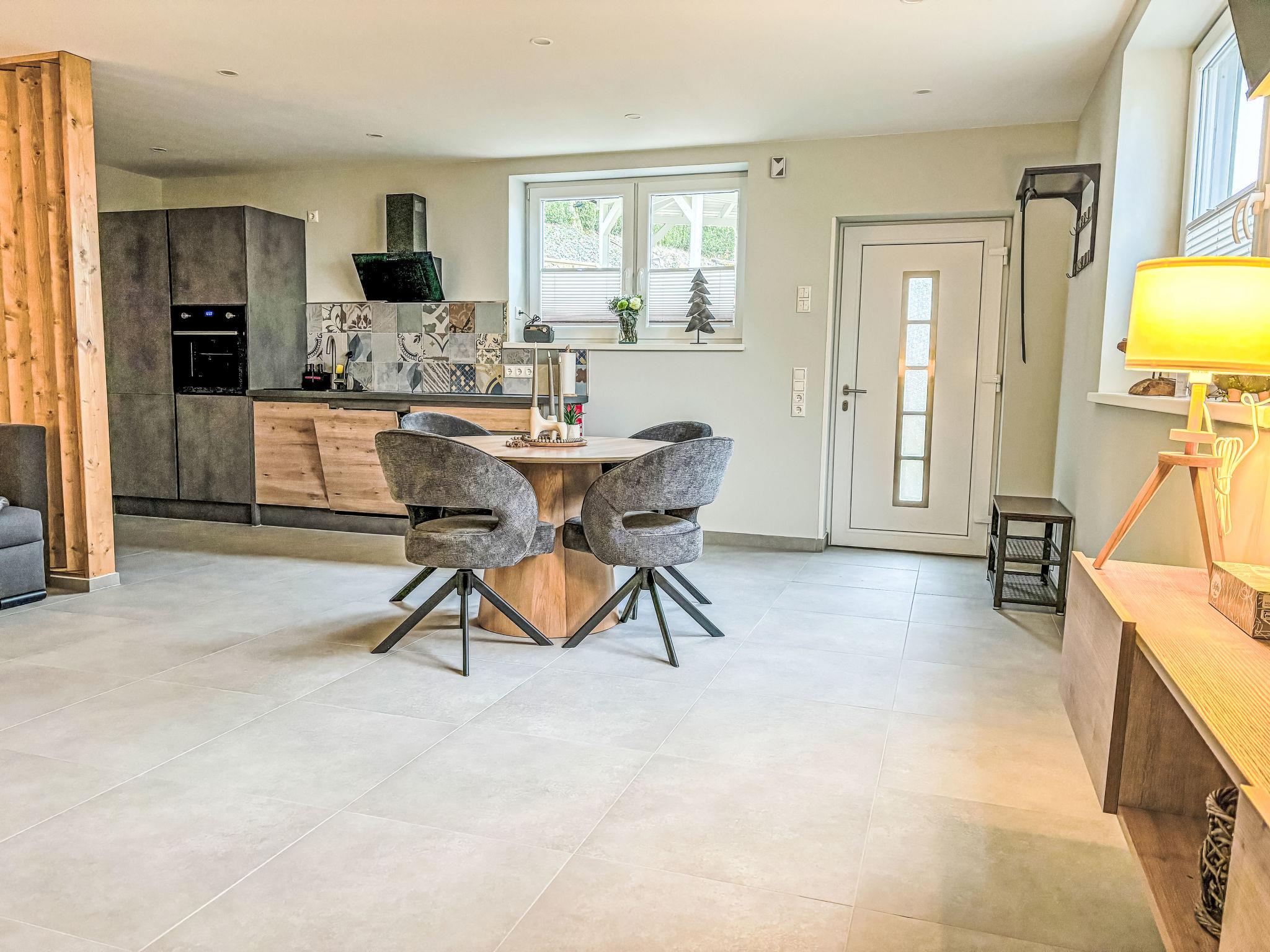 "Am Waldrand", 2-room apartment 50 m2, lower ground floor. Fully renovated in 2024, modern and tasteful furnishings: living/dining room with dining table and cable TV (flat screen). Exit to the terrace. 1 room with 1 double bed (180 cm, length 200 cm), cable TV (flat screen). Open kitchen (oven, dishwasher, 4 ceramic glass hob hotplates, toaster, kettle, freezer, electric coffee machine). Shower/WC. Oil heating, underfloor heating. Terrace 20 m2. Terrace furniture, barbecue. Facilities: washing machine, dryer. Internet (WiFi, free). Please note: non-smokers only. Maximum 1 pet/ dog allowed. Private entrance, smoke alarm.