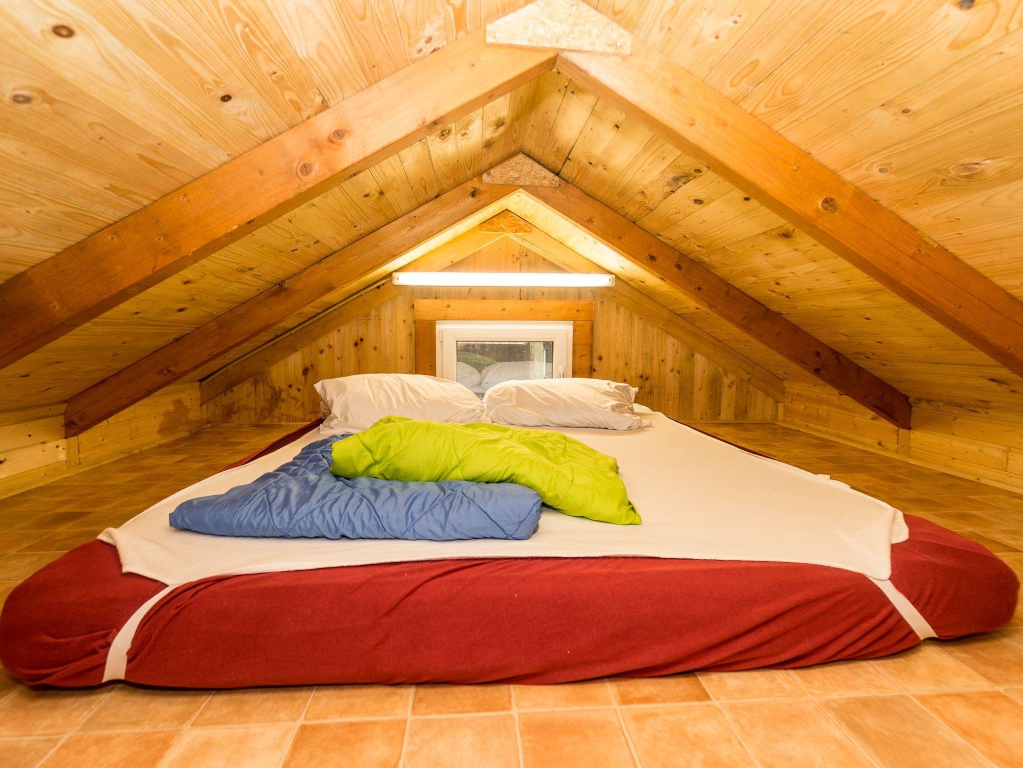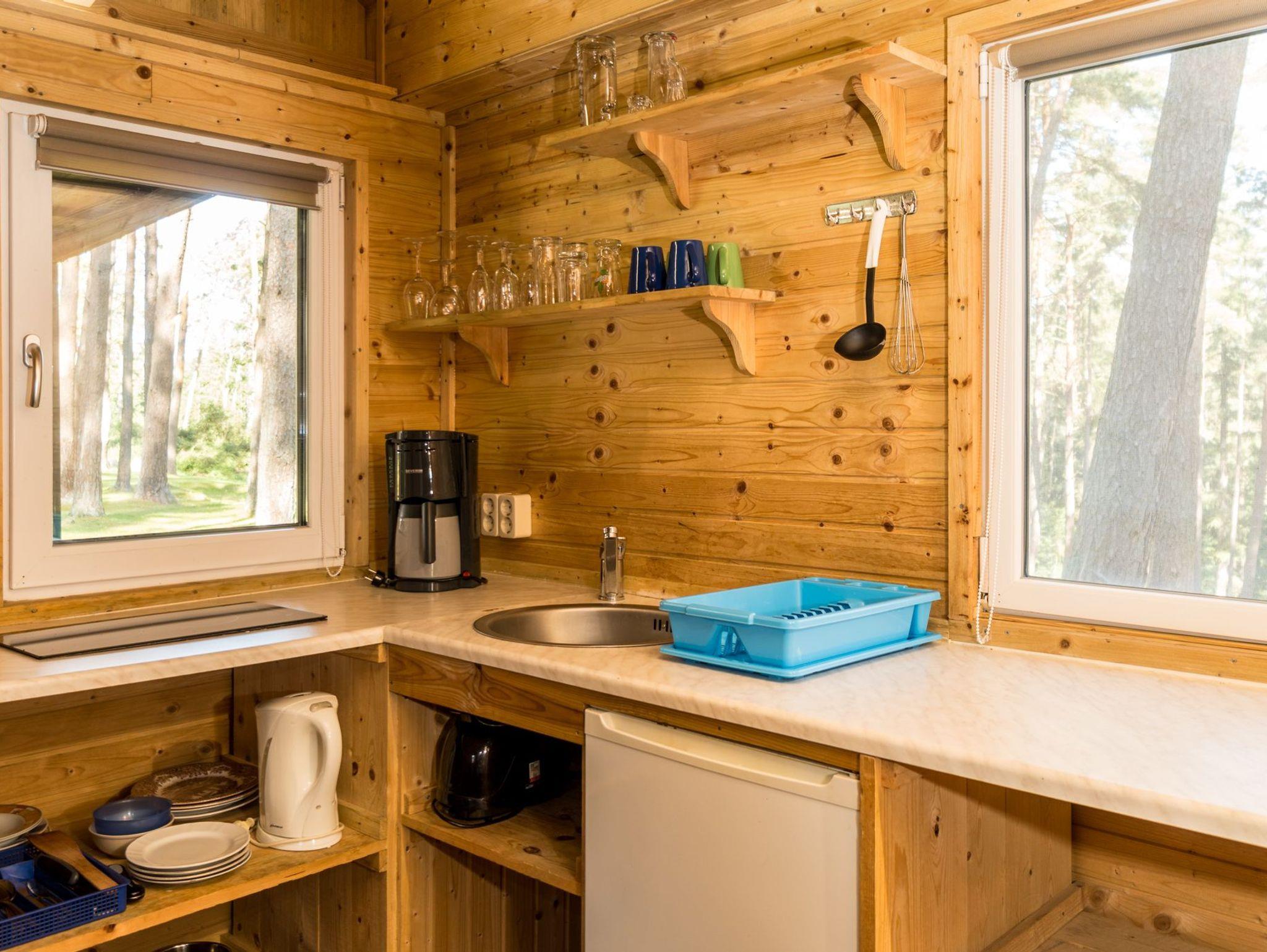 Der Bungalow verfügt über zwei Etagen. Die obere Etage ist ein Schlafboden mit dicker Matrazen (160x200cm) für zwei Personen und über eine Leiter zu erreichen. Die untere Etage besteht aus einem großen Raum mit TV-Ecke, einer Flachstrecken für ihre Garderobe, einer Schlafnische mit Boxspring-Doppelbett (180x200cm) und der Küchenzeile. Separat befindet sich ein Bad mit Toilette und einer Dusche.