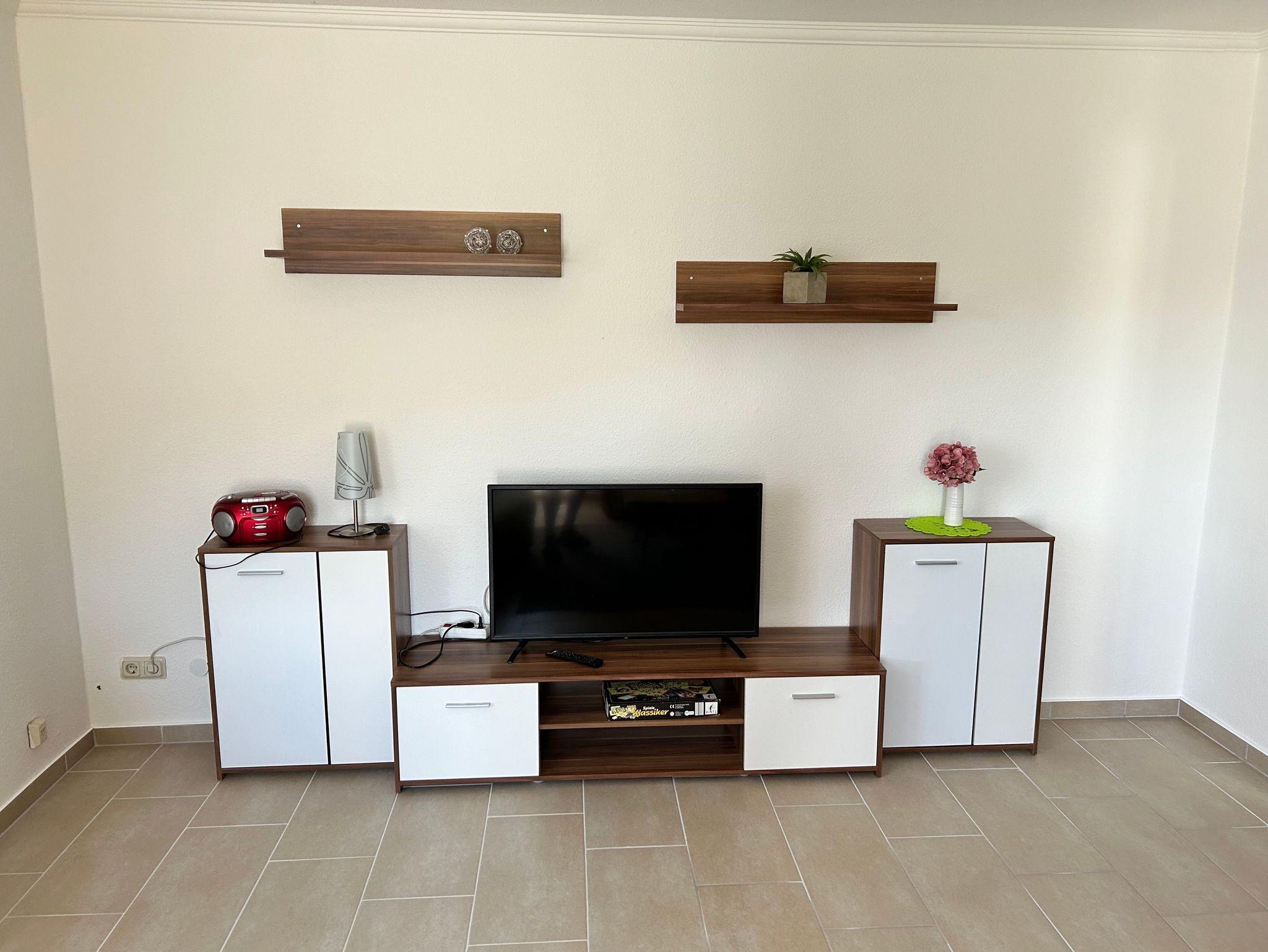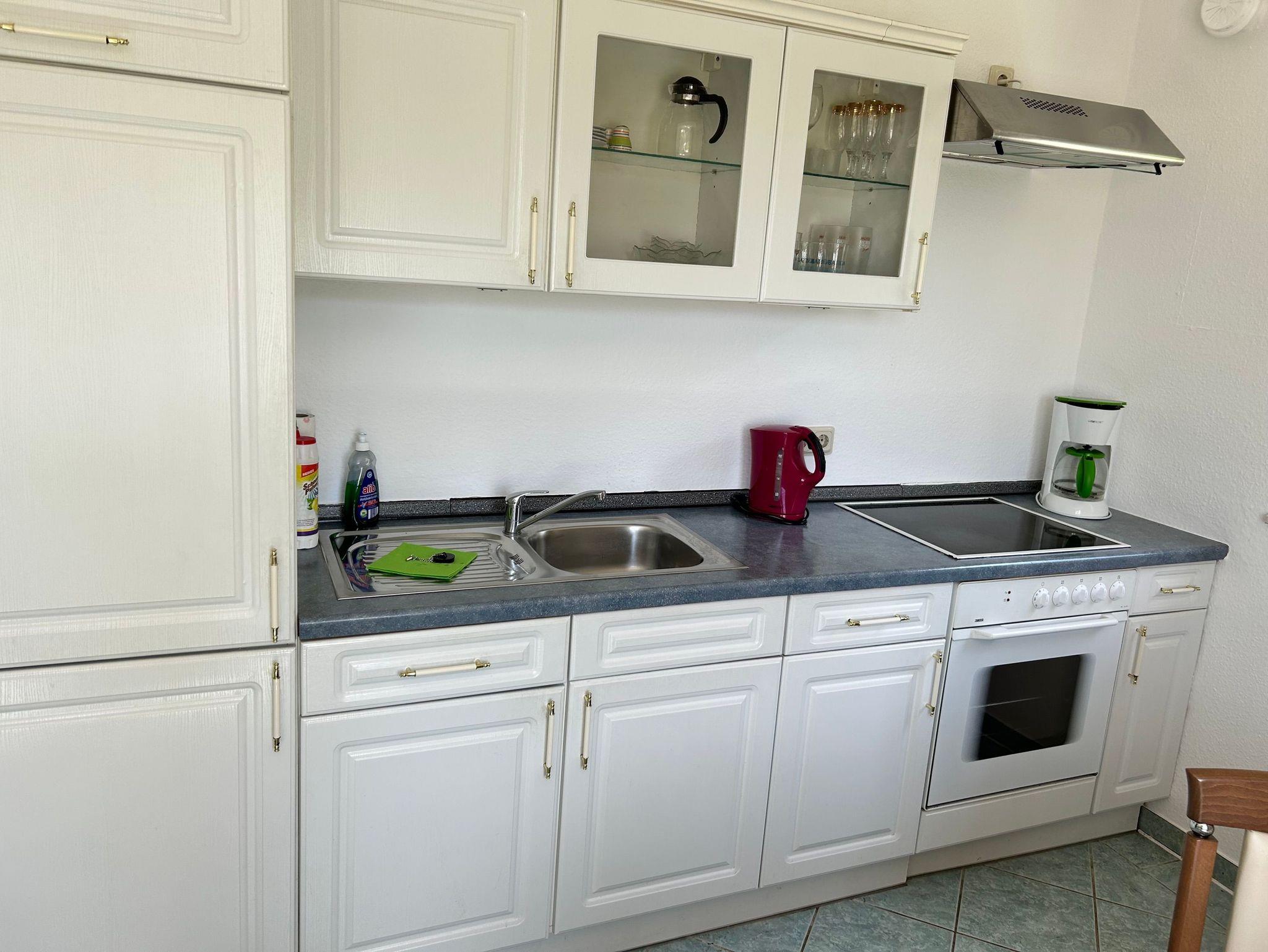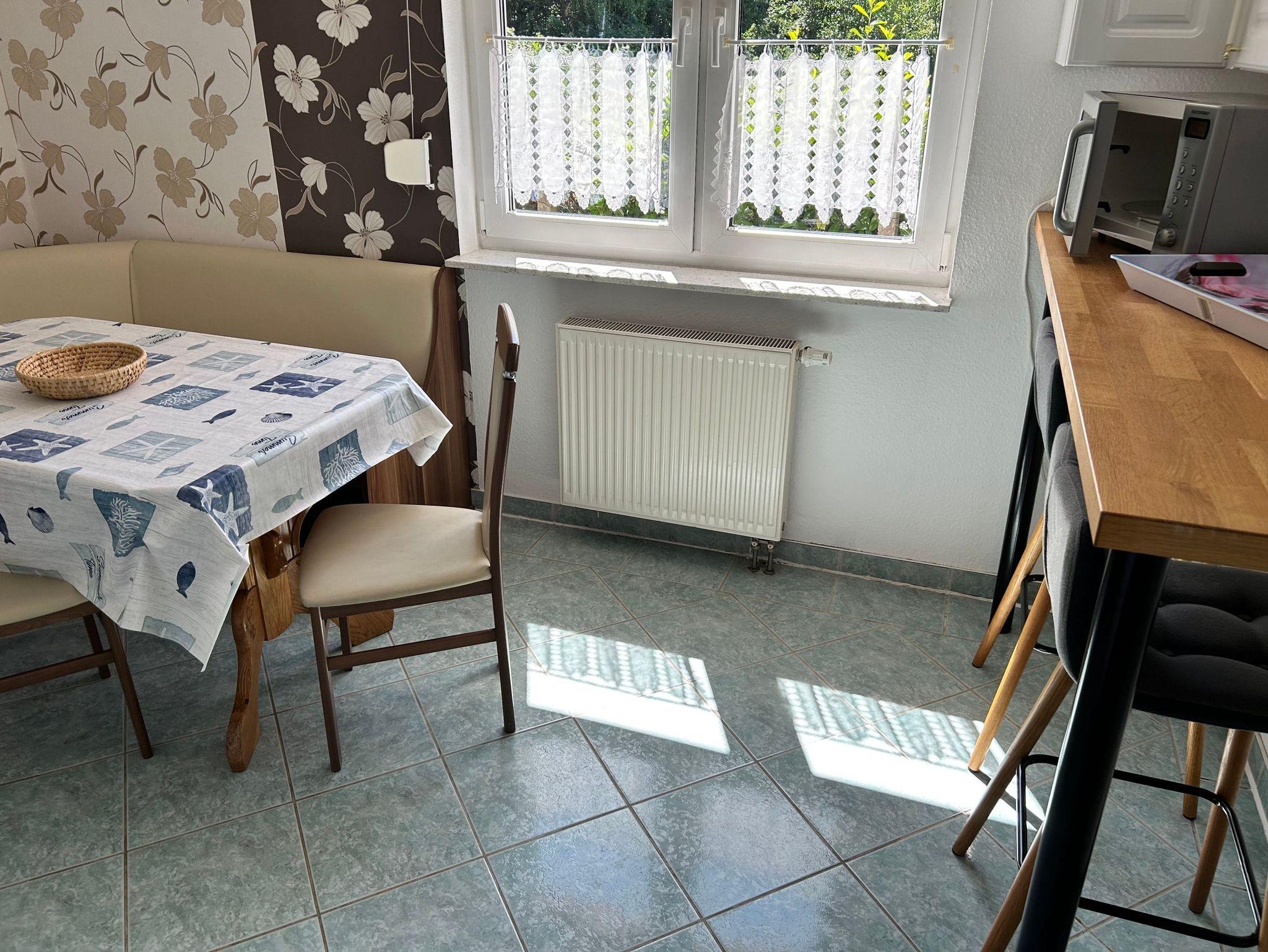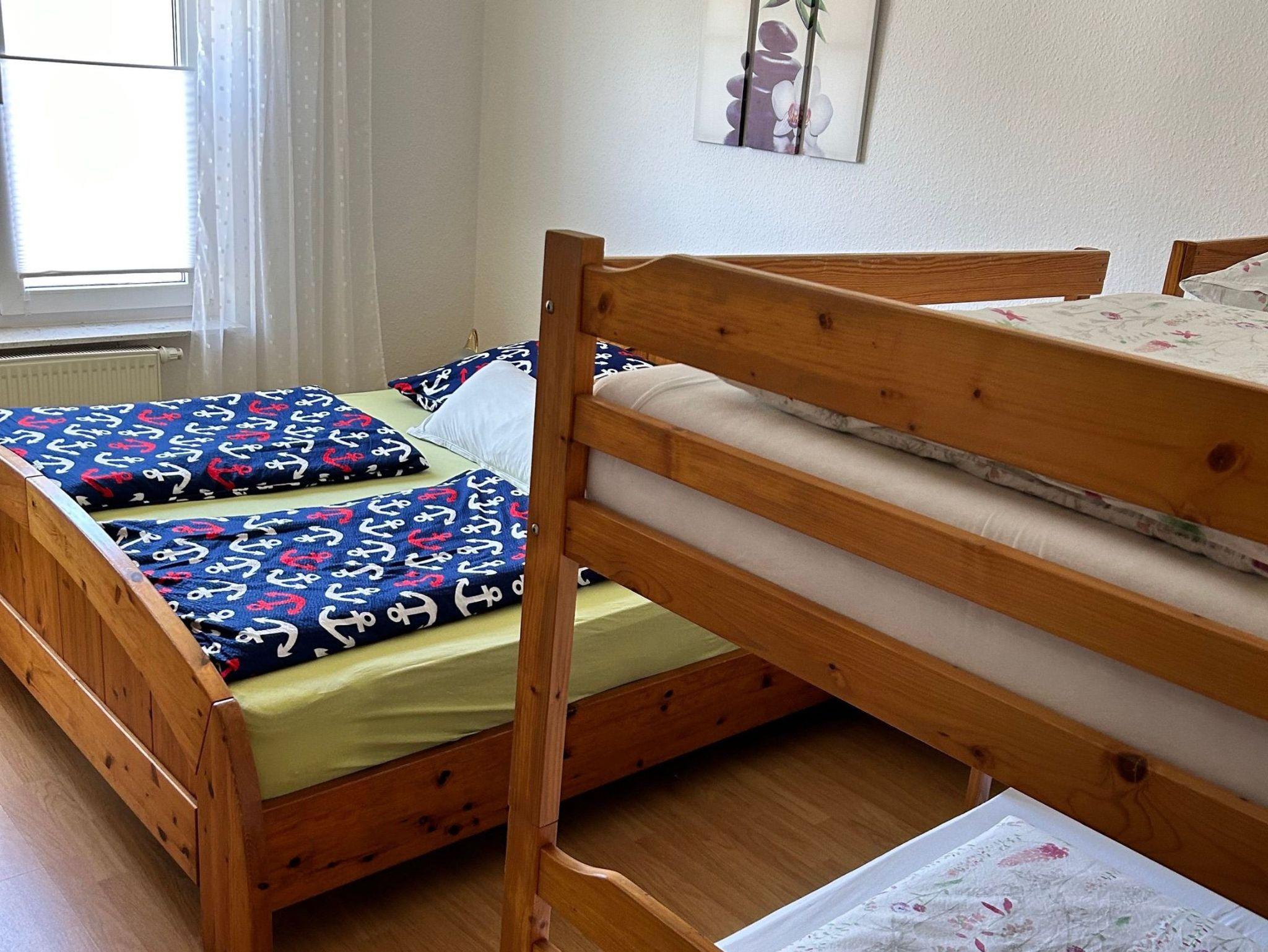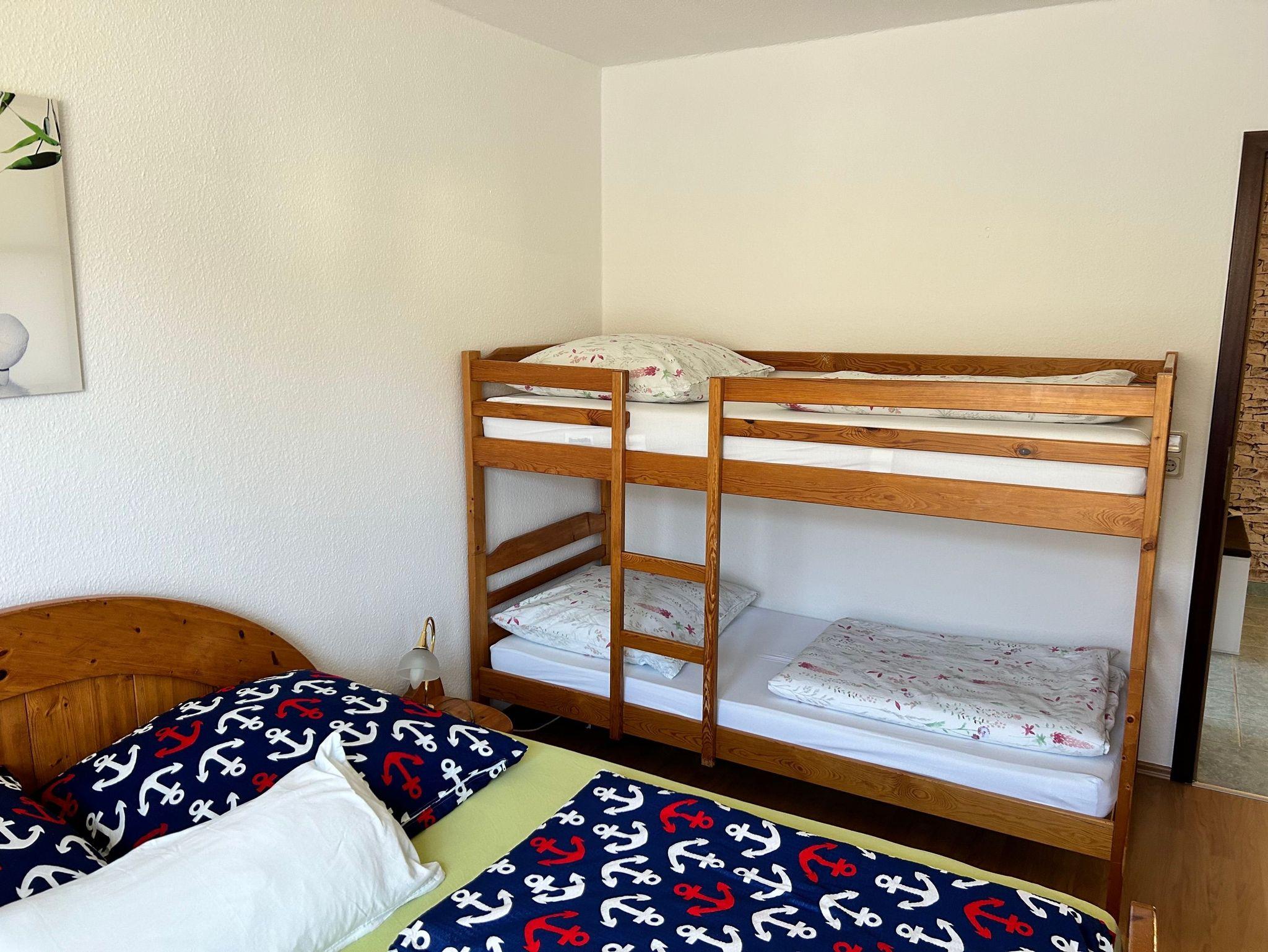 Unsere Ferienwohnung liegt im Erdgeschoss und ist komfortabel aufgeteilt in ein Wohnzimmer mit TV, ein Schlafzimmer mit Doppelbett und Etagenbett, ein Badezimmer mit Dusche/WC sowie eine komplett eingerichtete Küche mit Sitzecke.