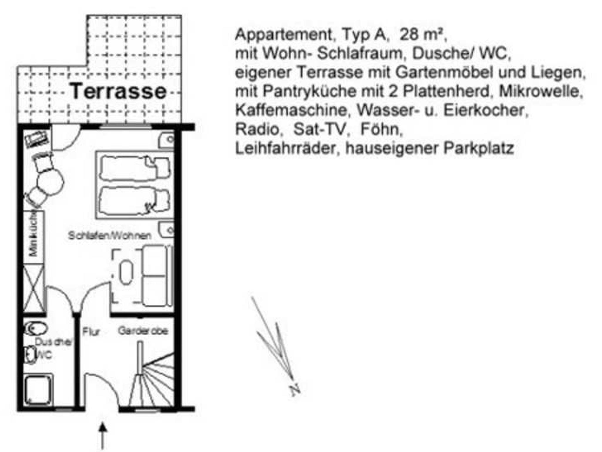 Kombinierter Wohn-Schlafraum (1 Aufbettung durch Schlafcouch möglich), Pantryküche (2-Plattenherd), Kühlschrank mit Gefrierfach, Mikrowelle, Kaffeemaschine, Eier- u. Wasserkocher, Sat-TV, Radio mit CD-Player, Wecker, Du/WC, Fön,