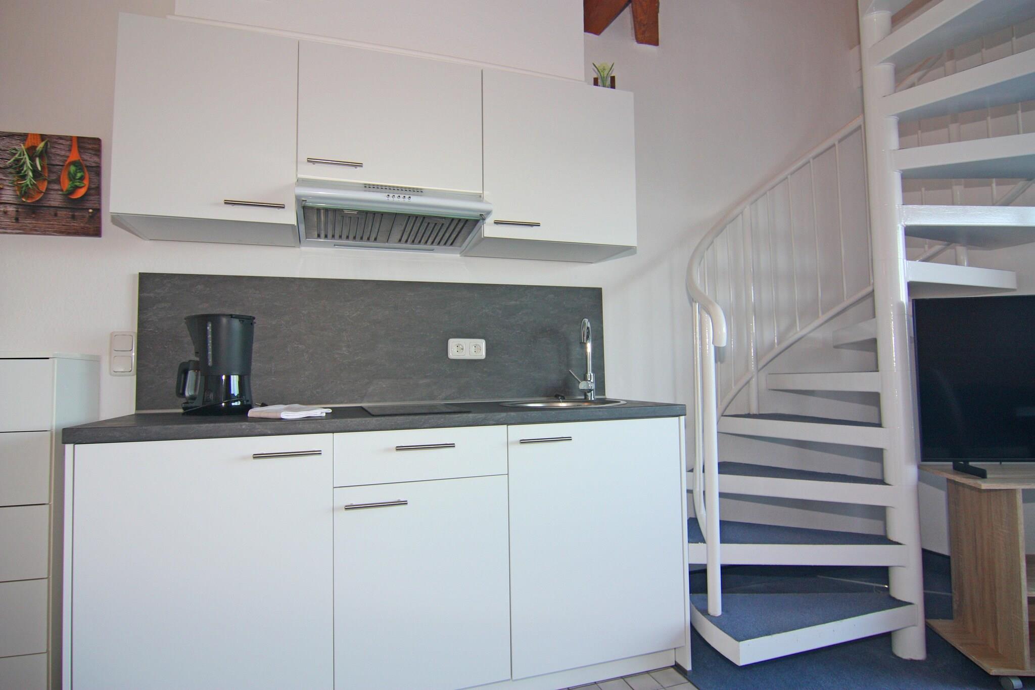 On the 2nd floor: (open kitchen(dining table(4 persons), hob(2 ring stoves, ceramic, electric), toaster, hood, coffee machine, microwave, fridge), Living/bed room(double sofa bed, TV(cable), radio), bedroom(double bed), bathroom(shower, washbasin, toilet), balcony, garden furniture) On the 3rd floor: (bedroom(double bed)) Reception, heating, lift, high chair, baby crib(paid), Towels/Sheets (Incl.)