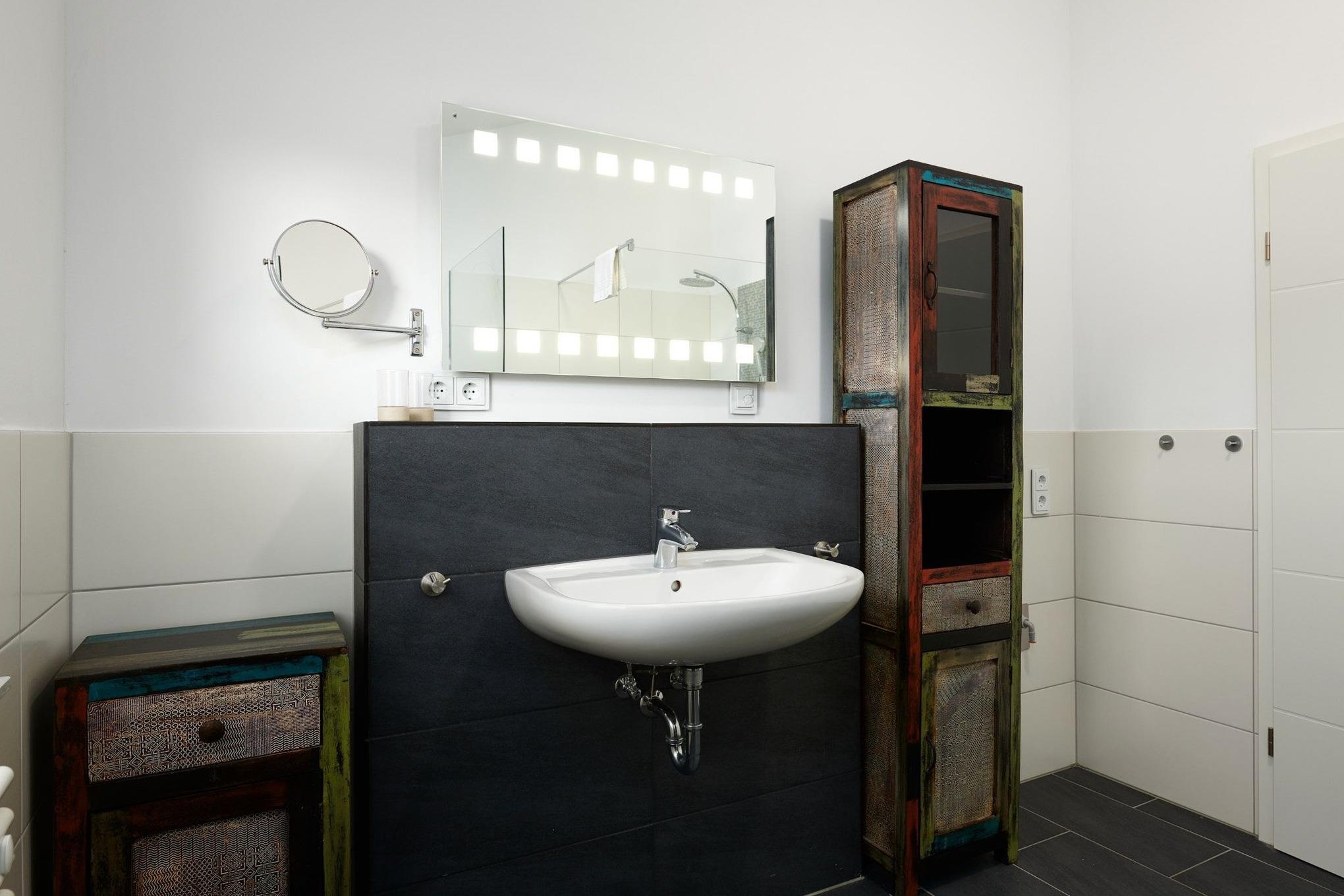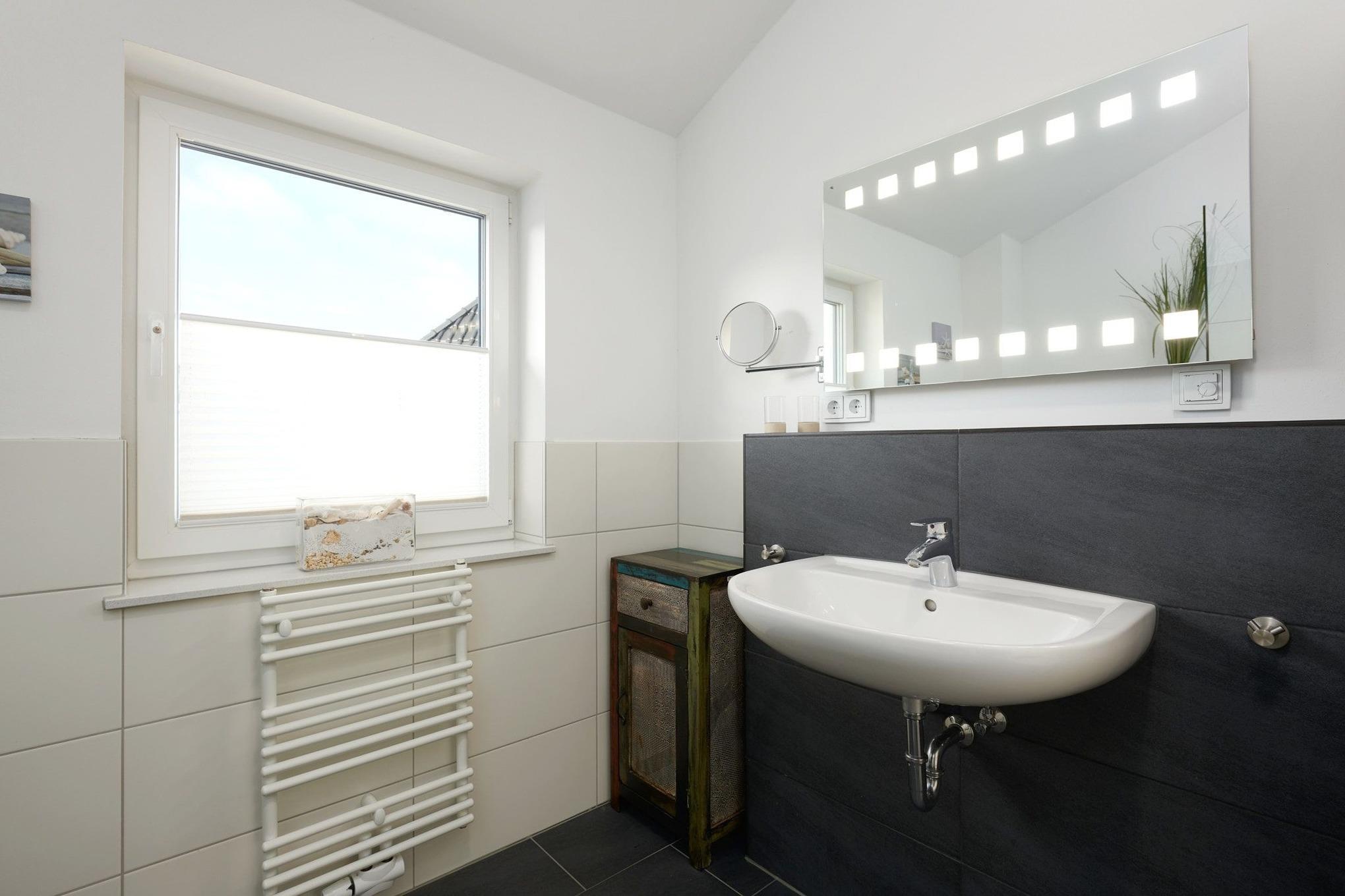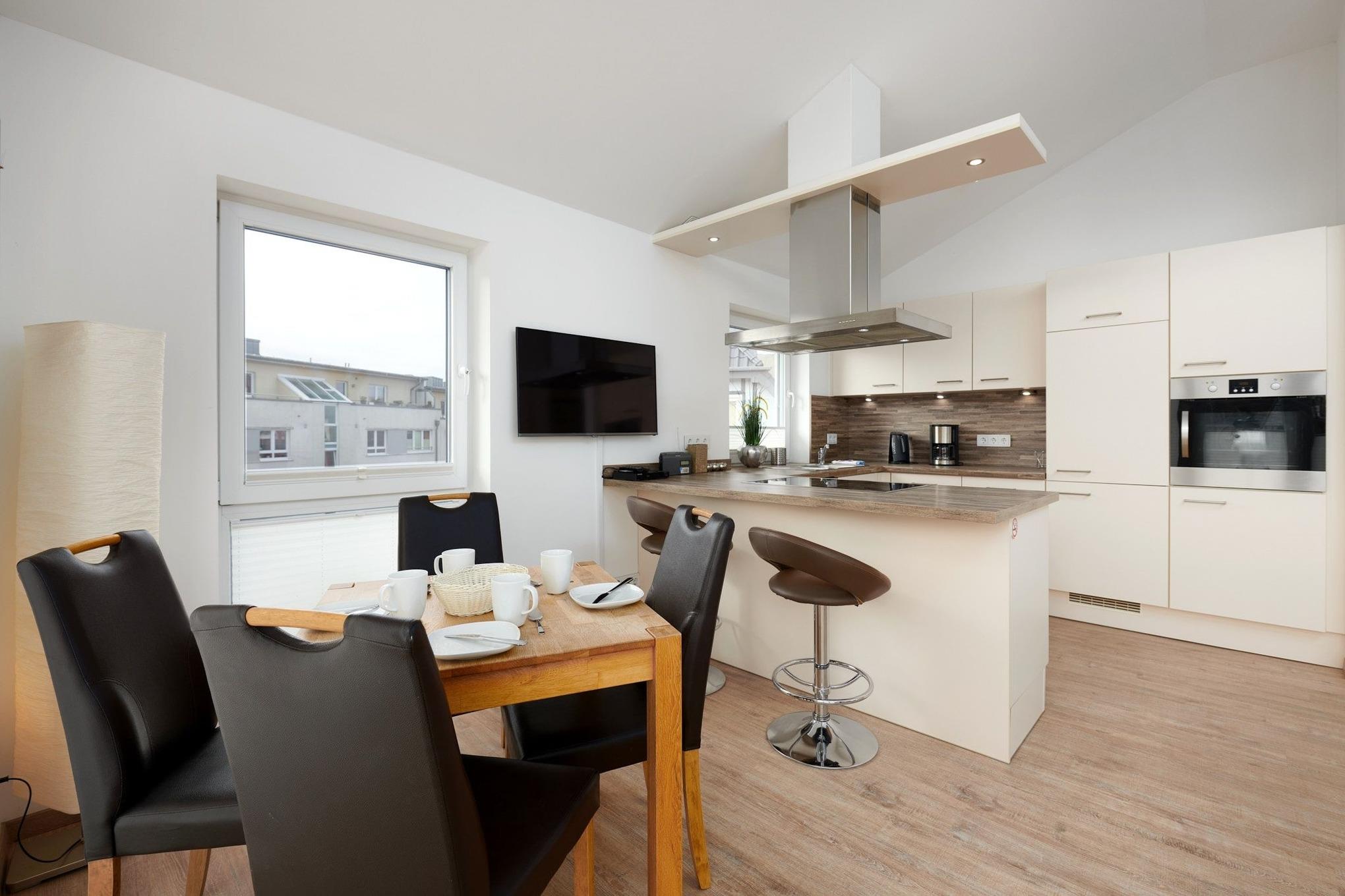 Ein eigener Treppen-Zugang führt in das hell und freundliche Feriendomizil. Das großzügig Wohnzimmer ist geschmackvoll und nordisch-modern eingerichtet. Relaxed wird auf der Couch, die sich nachts in ein Schlafsofa (160cm breit) verwandelt. Ein Flat-TV mit Sat-Anschluss sorgt genauso für Unterhaltung wie die Stereoanlage mit CD-Player sowie der DVD-Player. Die offene Küche mit Koch- bzw. Küchentresen ist gut ausgestattet. Für Kochspaß sorgen ein 6-Platten-Ceranherd, der Backofen und eine Mikrowelle sowie ein großer Kühlschrank mit Gefrierfach. Ein Esstisch zwischen Küche und Terrasse lädt am Morgen zum ersten Kaffee ein und entspannt abends nach traumhaften Ausflügen an der Ostsee. Das Schlafzimmer ist ausgestattet mit einem Doppelbett, einem großzügigen Kleiderschrank für Ihre Urlaubsgarderobe und einem weiteren Flat-TV. Das Badezimmer ist frisch und modern eingerichtet und punktet mit einer großen Rainshower-Dusche.