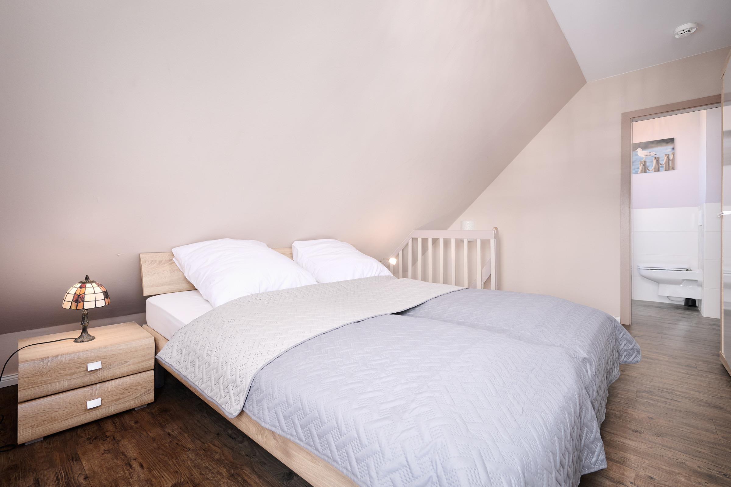 Schlafzimmer: 1 Doppelbett (2x 90x190 cm), TV, Kleiderschrank, Verdunkelung: Plissees