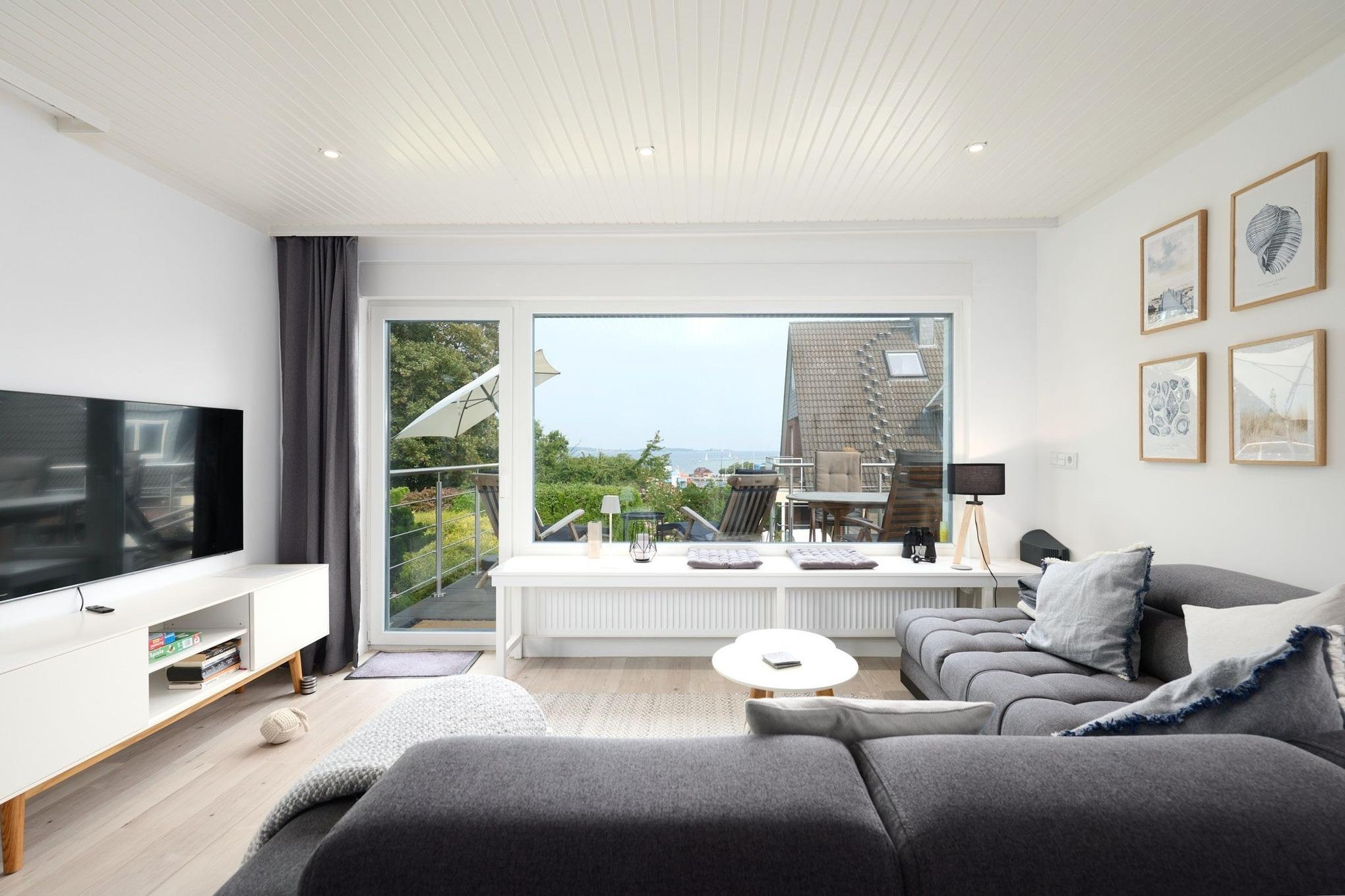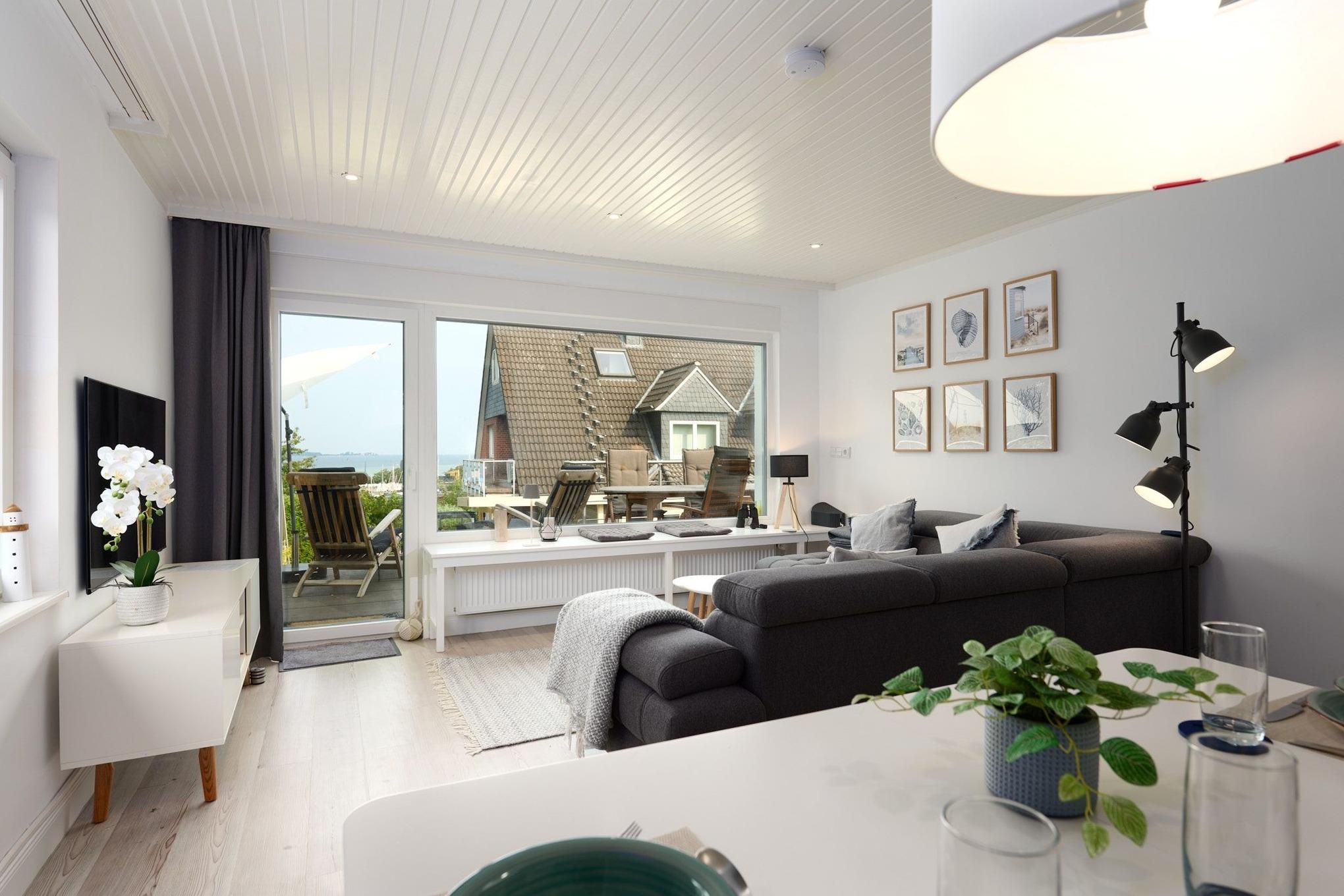 Freuen Sie sich auf einen erholsamen Ostseeurlaub! Schon beim Betreten der lichtdurchfluteten Wohnung werden Sie sich wohlfühlen. Vom Wohnzimmer mit gemütlicher Sitz- und Essecke blicken Sie durch die großen Fenster direkt auf das Meer. Die große Terrasse bietet Ihnen ausreichend Platz zum Relaxen. Die separate, moderne Einbauküche mit einer weiteren Essecke ist sehr gut ausgestattet und bietet sämtliche Annehmlichkeiten für eine Selbstversorgung. Die Wohnung verfügt über zwei Schlafzimmer, eins mit Doppelbett 180x200 cm) und ein mit einem Einzelbett, welches sich zu einem Doppelbett (2x 80x200 cm) ausziehen lässt. Das komfortable Badezimmer mit bodengleicher Dusche hat Tageslicht.