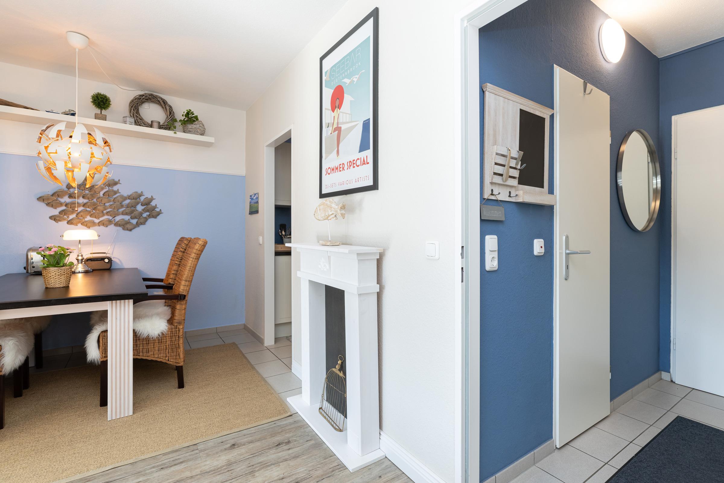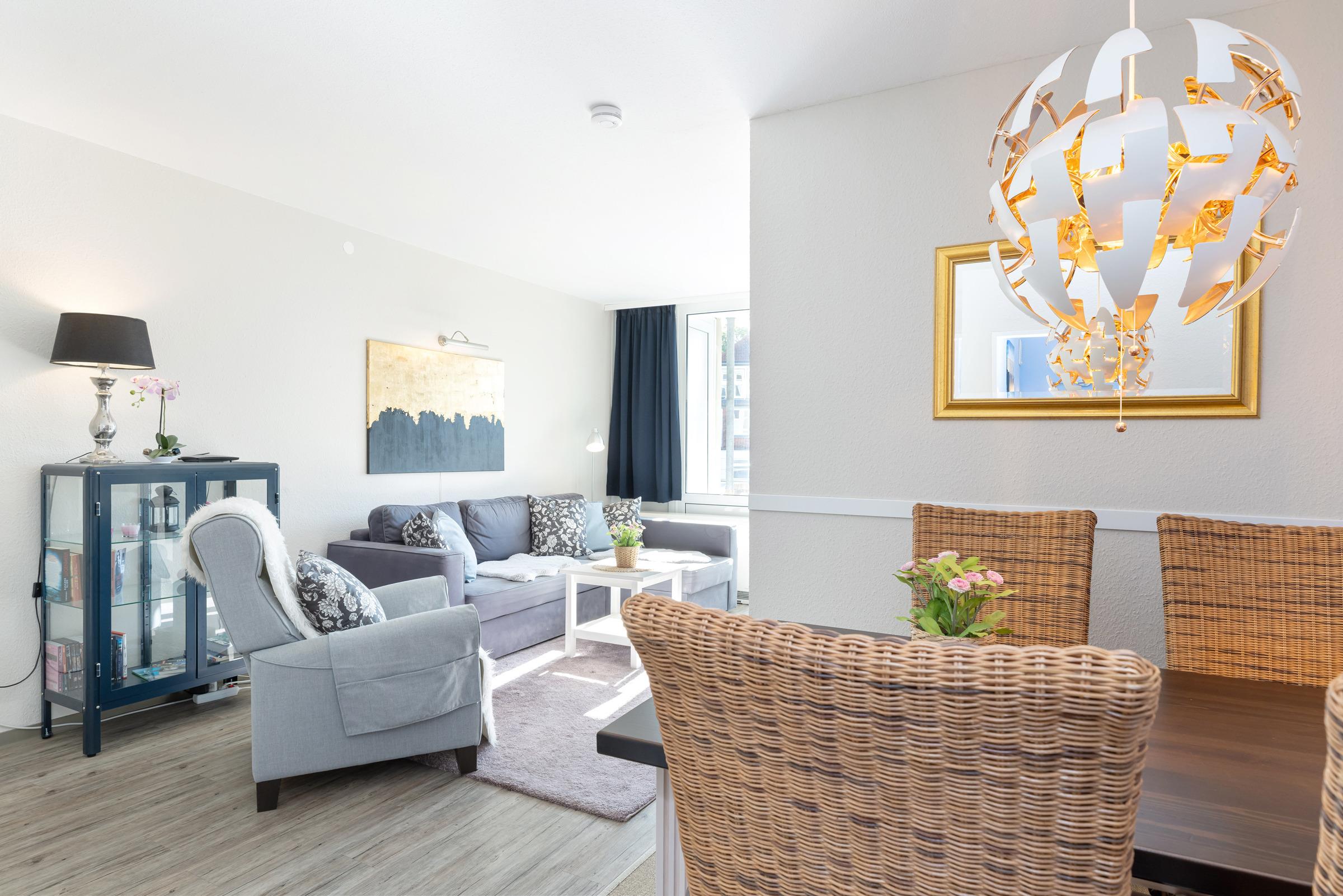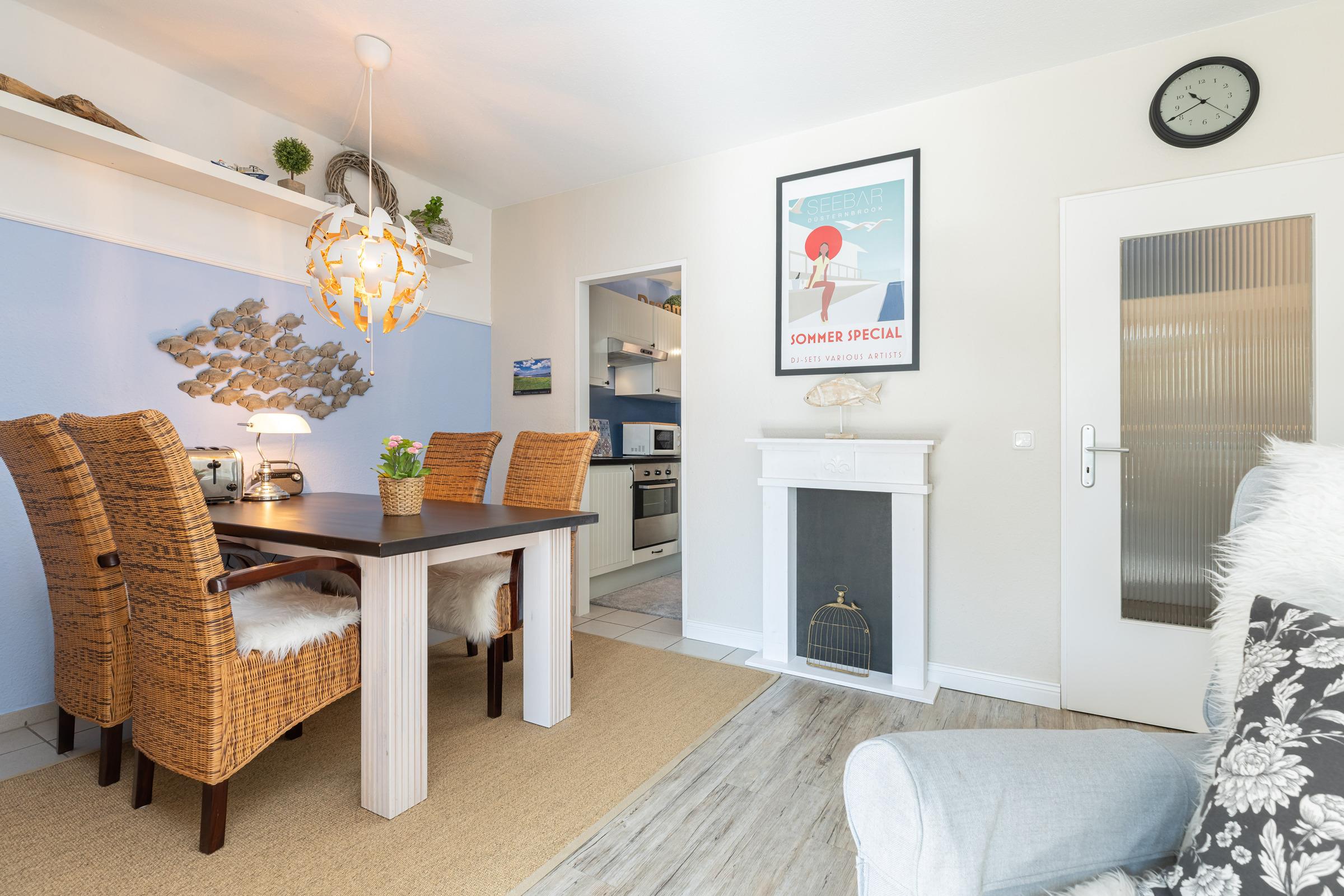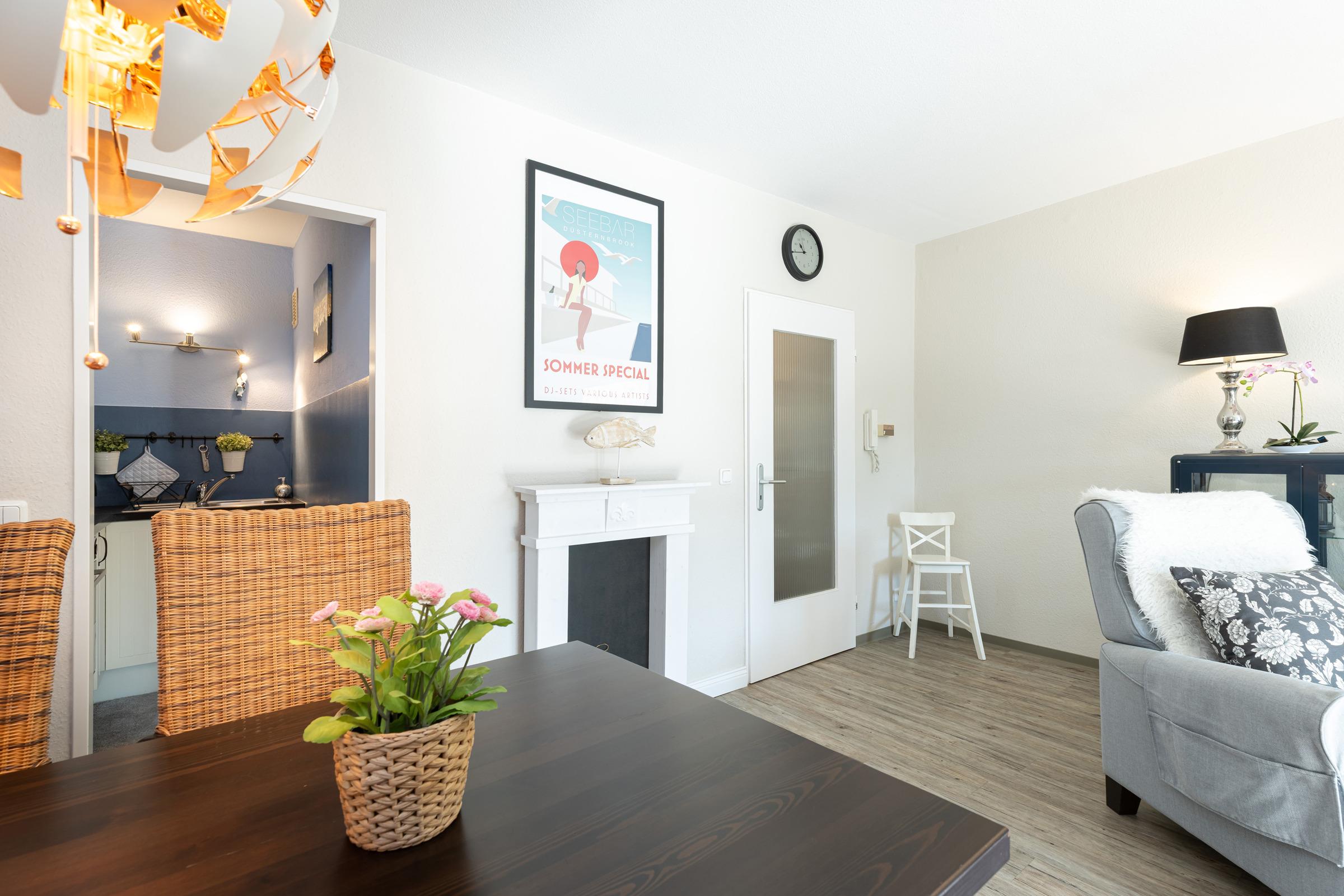 Das moderne 2-Zimmer-Appartement Strandperle für 2 Erwachsene und 2 Kinder befindet sich in der 2. Etage, nur wenige Minuten Fußweg vom Strand, vom Ortszentrum und vom Hafen entfernt.