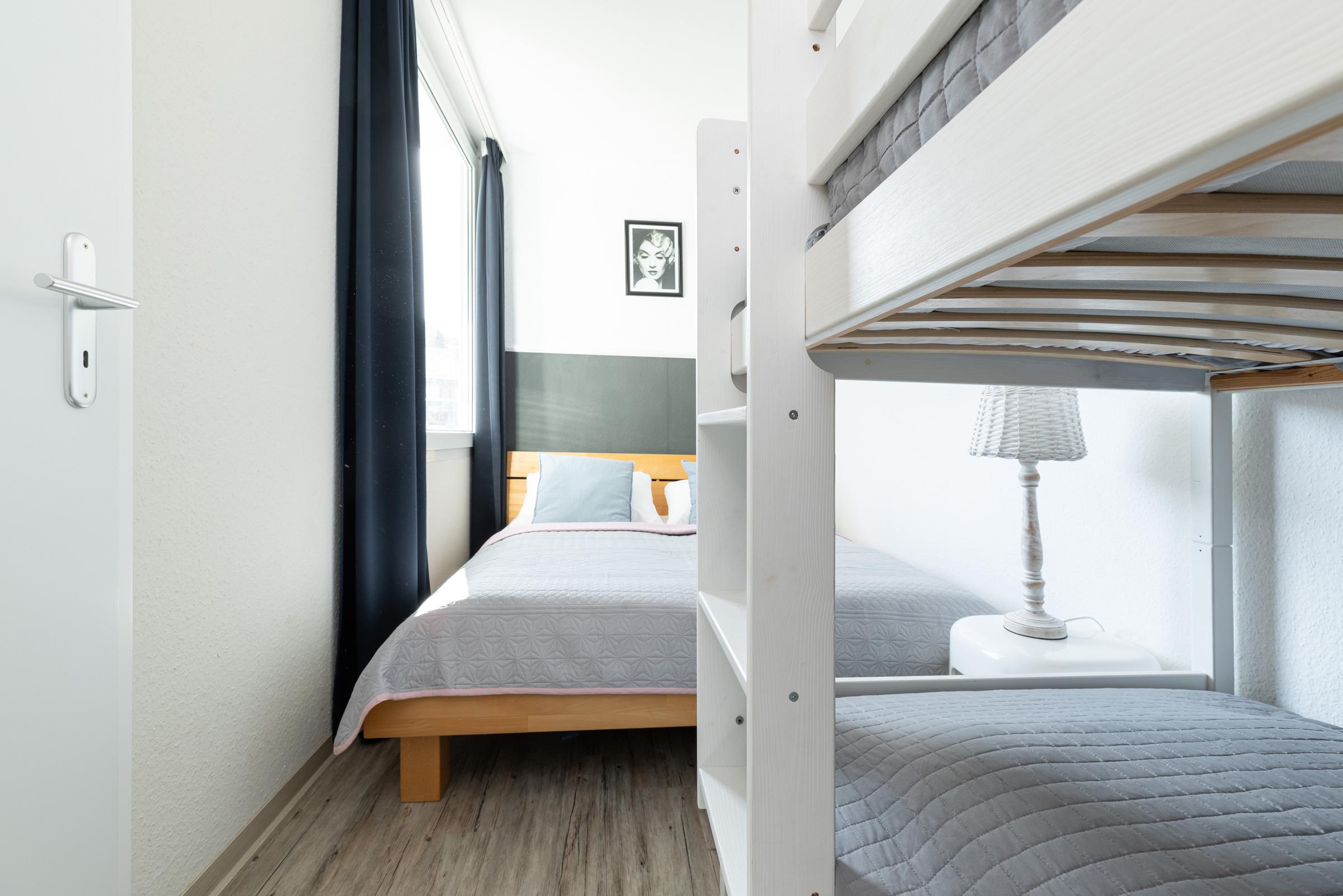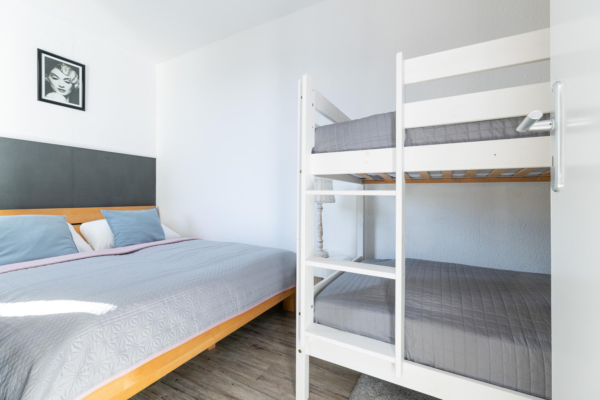 Schlafzimmer: Doppelbett (2x 80x200 cm), Etagenbett für 2 Kinder, Kommode