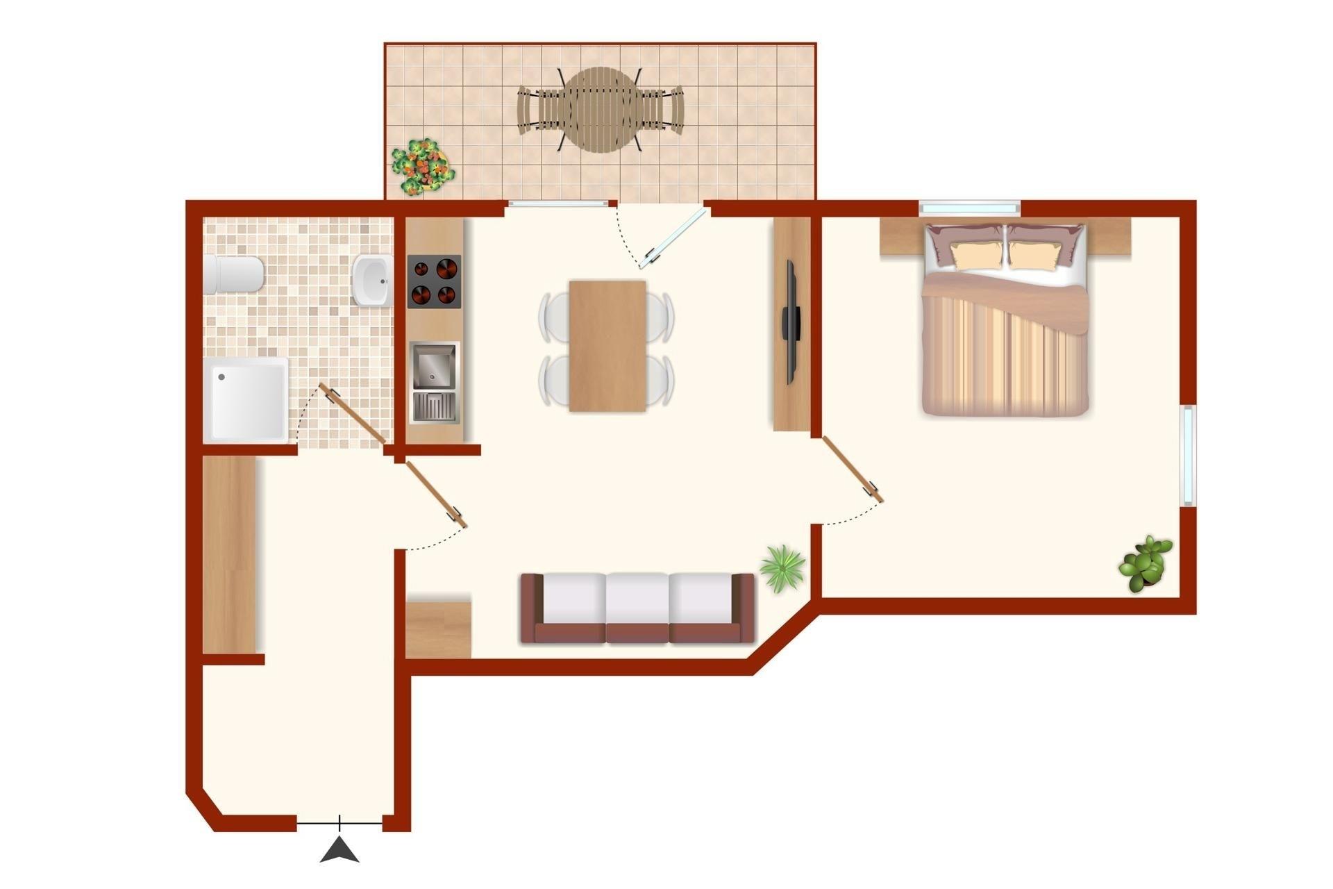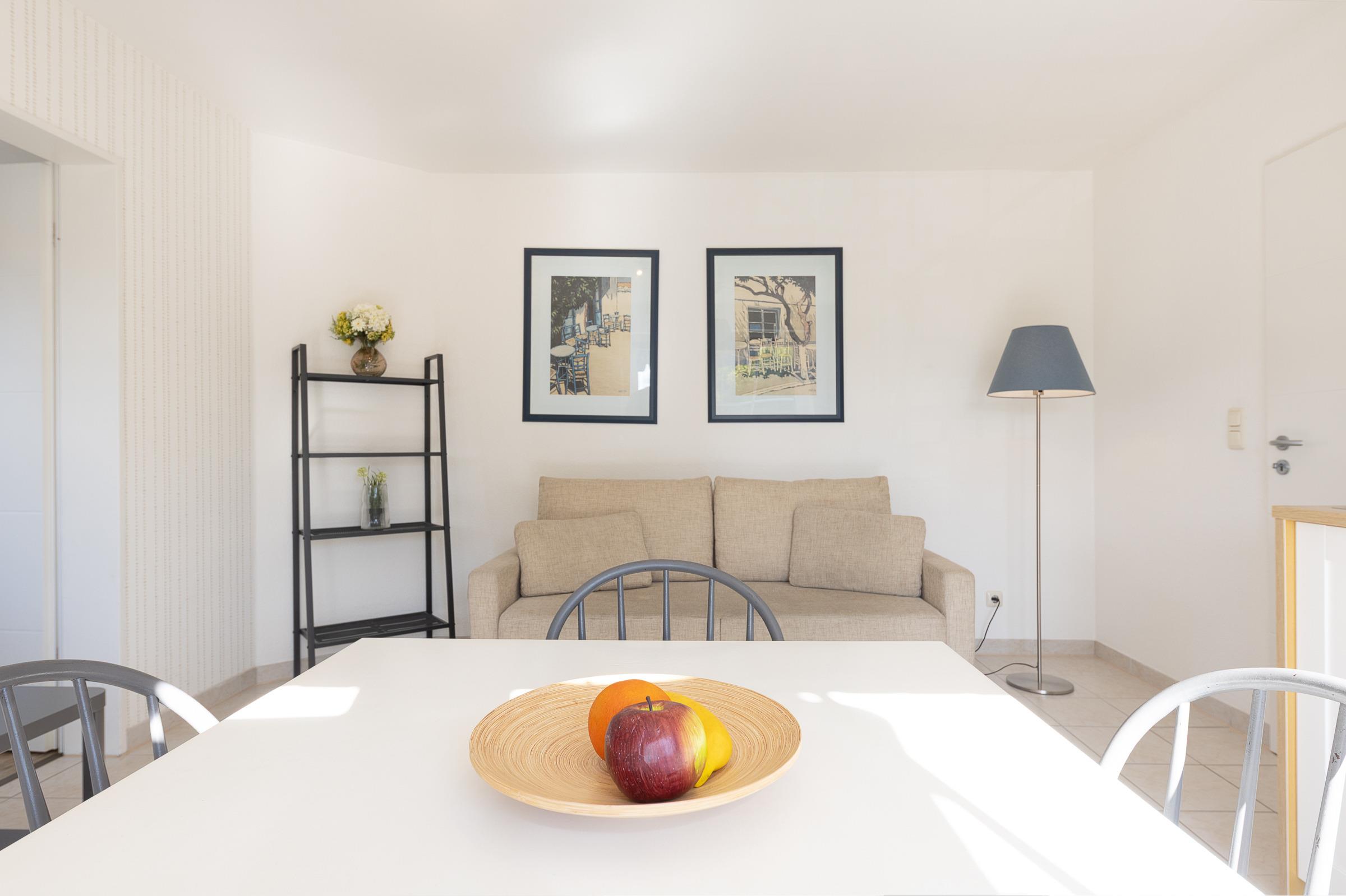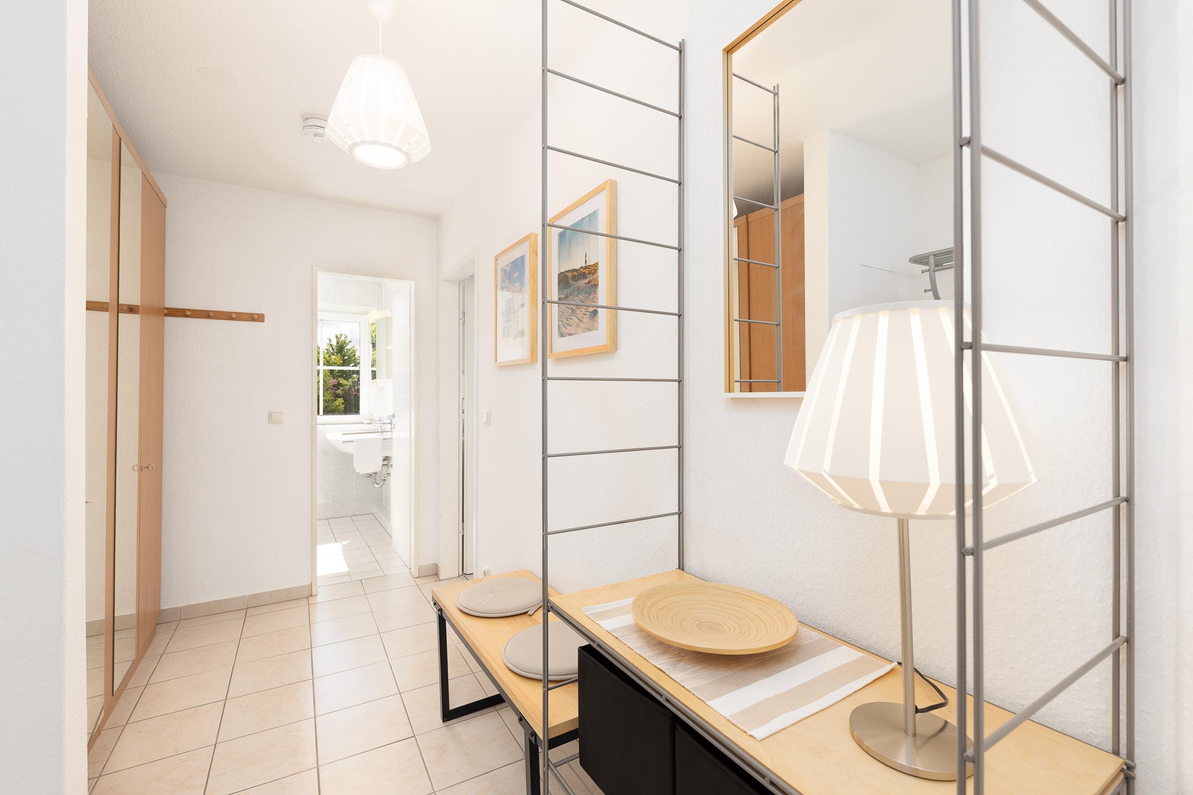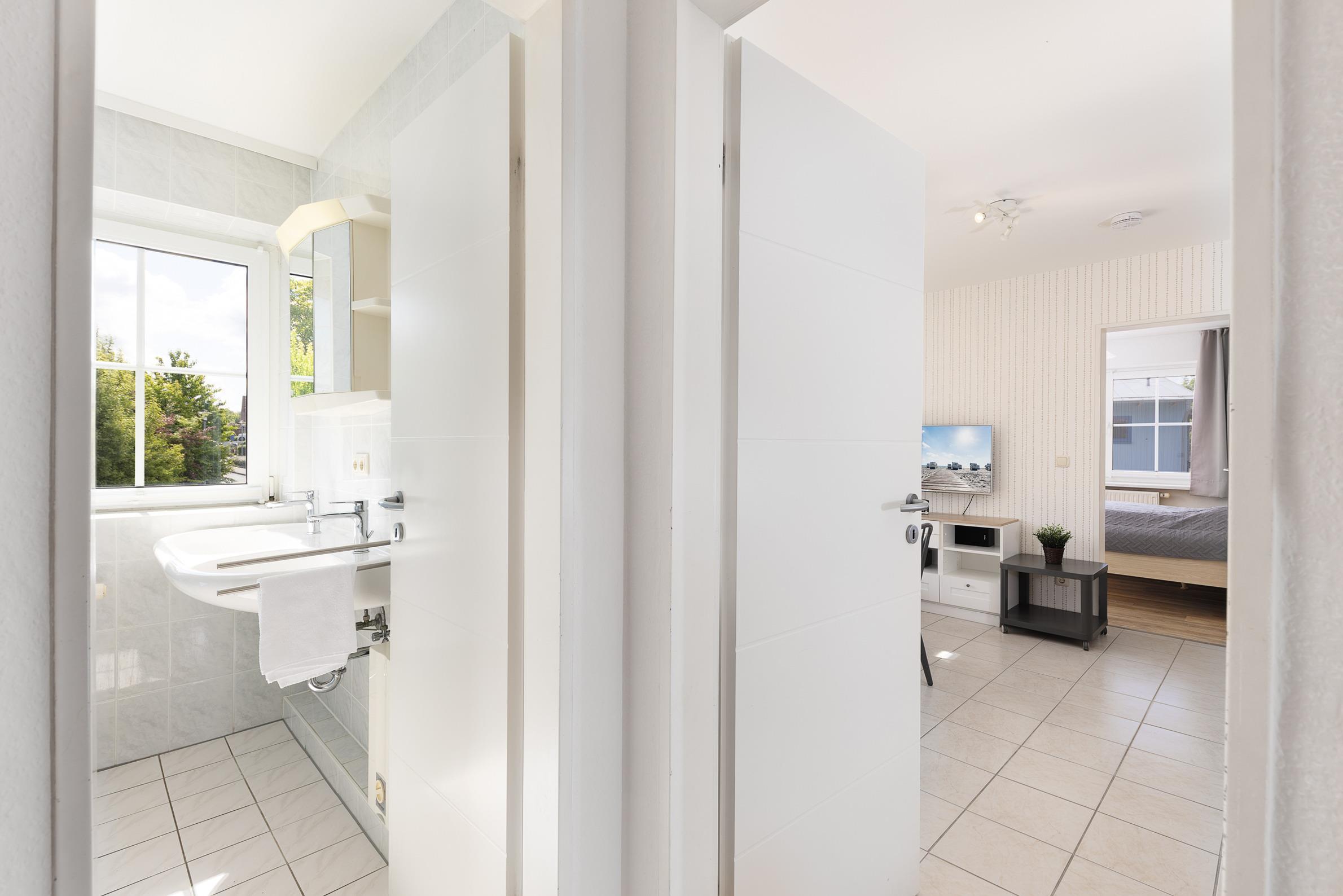 Die Wohnung verfügt über einen Flur, ein Badezimmer, ein separates Schlafzimmer sowie einen kombinierten offenen Küchen-Wohn-Ess-Schlafbereich. Letzterer bietet neben dem Zugang zum Balkon ein bequemes Doppelbettsofa, Flachbild-TV und eine HiFi-Anlage für CD, Bluetooth und USB. Das Schlafzimmer besticht durch sein Doppelbett mit höhenverstellbaren Lattenrosten und einem 2. Flachbild-TV. Im Flur befindet sich die Garderobe mit Schuhablage und Sitzbank wie auch ein sehr geräumiger Schrank für Ihre Urlaubsgarderobe. Die 2 Waschbecken im Badezimmer erleichtern morgens und abends die nötigen Abläufe ungemein.